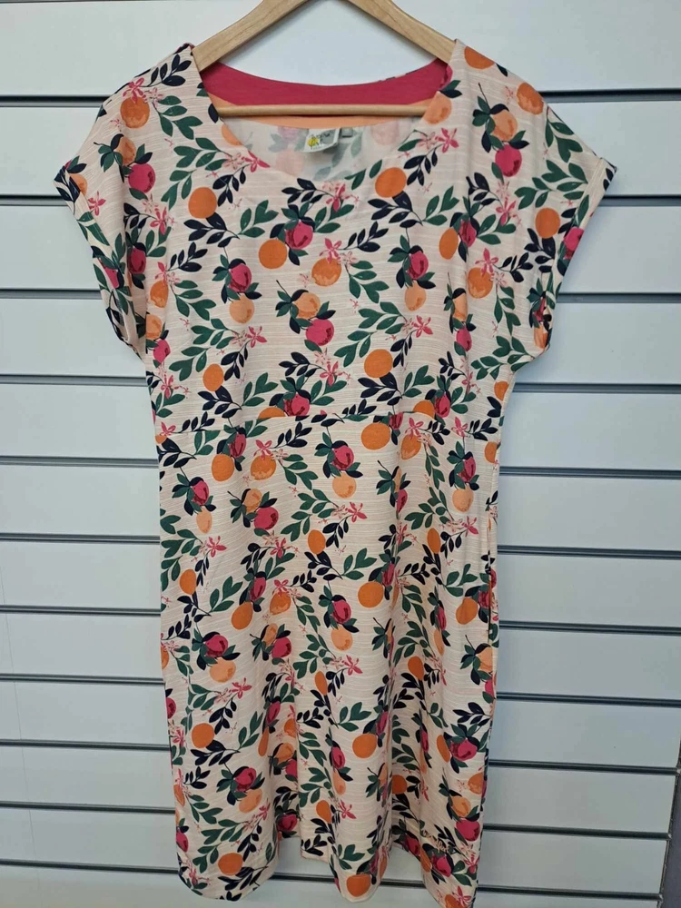 Introducing a brand new tunic dress from the popular brand Weird Fish. This knee-length A-line dress is made from 100% cotton jersey fabric, which guarantees a comfortable and breathable fit. Its multicoloured citrus fruit print is perfect for the summer season, while the round neck and short sleeves make it suitable for any casual occasion. Moreover, this dress features pockets, which is an added convenience for women on the go. Available in size 10, this tunic dress is perfect for those looking for a comfortable yet stylish outfit. Get this must-have item for your wardrobe today!