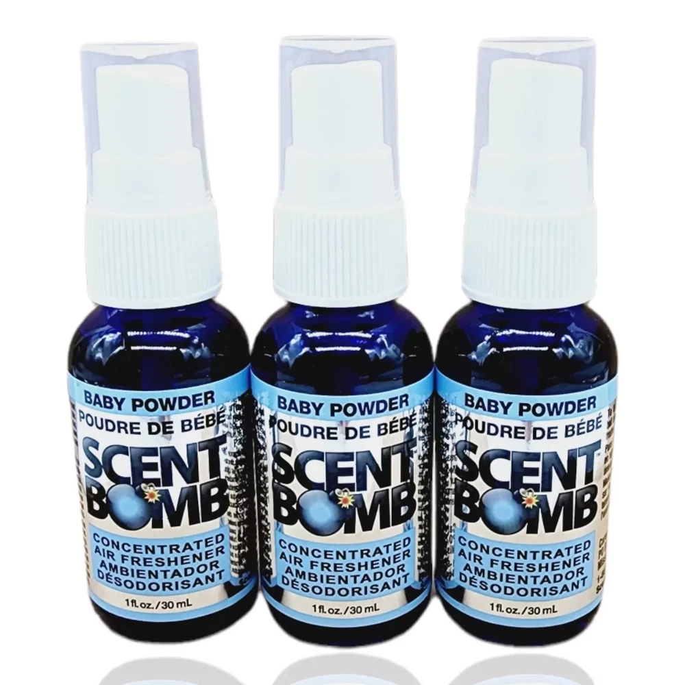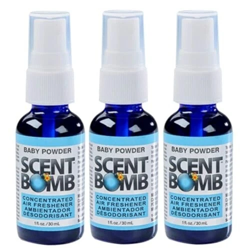 Scent Bomb 100% Oil Based Concentrated Air Freshener Spray, Baby Powder, Pack of 3 Scent Bomb Air Freshener Spray, Baby Powder 3 Bottle Product Info Scent Bomb air freshener spray refreshes your car, home, and anywhere you want to mask odor. Our air freshener spray is oil based, that is designed for its long lasting fragrance that will give you a fresh and calming ambience. This is intended to fill your home, car, or office with incredible scents that covers all types of odors and smells. Made in the USA. Just a few sprays and it will last for days! Features QUALITY FORMULA: Scent Bomb air freshener uses a scented oil-based formula that is created for long lasting fragrance that will give you a fresh and calming ambience. Just a few sprays and it will last for days! HOME AND CAR AIR FRESHENER: This air freshener spray is ideal to refresh your car, home, room, or office with incredible scents that eliminate all types of odor and smells! LUXURIOUS SCENTS: Scent Bomb air freshener will help you relieve stress, help you stay alert, and improve your mood. Remove odor and freshen your life that gives you a pleasant scent. PACKAGE CONTENT: Each pack contains Baby Powder, 1 fl.oz. spray air freshener bottles. Great use for car freshener, room spray, bathroom spray, or spray for your gym bag! A great air freshener for home, work or on the go! TRUSTED BRAND: All Scent Bomb Air Fresheners are made in the USA and designed for its long lasting fragrance. A great air freshener spray for your car and home