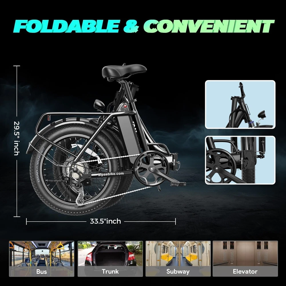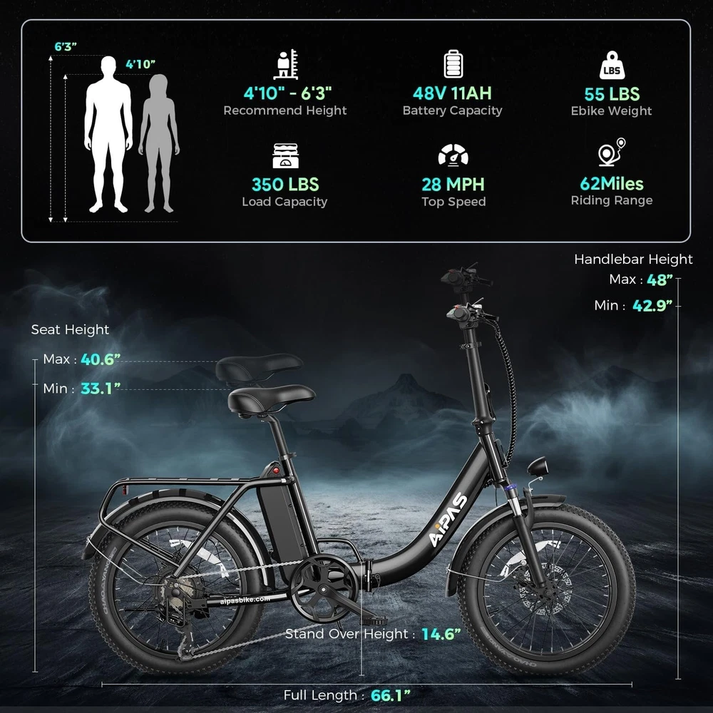 Suspension Type: Front UPC: Does not apply Custom-Built: No Motor Type: Rear Hub Motor Model Year: 2024 Voltage: 48 V Color: Gray Features: Front Light, Kickstand, Lithium Ion Battery Wheel Size: 20 in Item Height: 48 in Gear Change Mechanism: Derailleur Gears Material: Aluminum Alloy Maximum Speed: 28 mph Frame Number: ### Frame Size: 20 in Maximum Range: Up to 62 mi Bike Type: E-Folding Bike Charging Time: More Than 5 Hours Handlebar Type: Cruiser Bar Item Length: 66.1 in Number of Speeds: 7 Speed gtin13: Does not apply Brake Type: Disc Brake - Mechanical Department: Unisex Adults Brand: Aipas Model: Aipas A4 MPN: Does not apply Tire Type: Fat Tires Manufacturer Warranty: 6 Months Shifter Style: Thumb Shifter