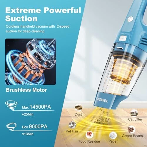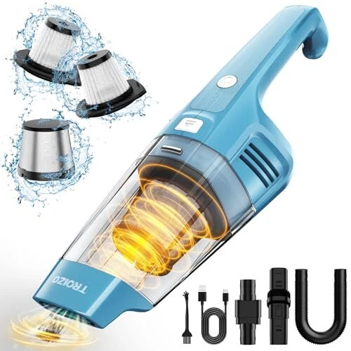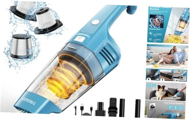 Return Policy Fast Delivery Trusted seller Handheld Vacuum Cordless, Portable Car Vacuum Cleaner with 14500PA Blue Product Description Strong Suction for Deep Cleaning: equipped with high-speed brushless motor, this hand vacuum delivers superb suction power of 14500PA, which can efficiently eliminates pet hair, dust, debris, crumbs from car, office and home. The portable vacuum has two adjustable speeds for you to tackle daily cleaning swift and effortless with incredible deep-cleaning performance, it is a good helper for you to make your environment look new in a second and enjoy a more comfortable life. Versatile Vacuum with Professional Attachments: the mini vacuum comes with multiple professional accessories to meet your different cleaning needs. The crevice nozzle can efficiently removes dust and dirt for narrow crevices and corners. The brush nozzle is designed to tackle hair on carpets, sofas or dust on keyboards. And the long hose with connector provides flexibility for hard-to-reach places to ensure that every corner can be cleaned thoroughly. Long Time Use and Cordless: the car vacuum utilizes 2000mA*3 rechargeable lithium battery and fast type-c charging tech. Which provides you a uninterrupted cleaning time for 25 mins with the standard suction and 13 mins with the max suction after 4-4.5H hours full charging. With the included USB-C charging cable, you can charge the small vacuum anyw or charge it with the recommended 5V adapter. The cordless design and 1.37lb light weight allows you to clean and move around as you wish. Double Filtration System: the portable vacuum for car adopts upgraded two-layer filtration system to to keep a clean healthy environment for your family. The first stainless steel filter helps to keep out the large debris while the HEPA filter can effectively collect 99.99% of dust particles to make sure that zero dust escapes into the air. The washable and reusable two-layer filter act as an impenetrable protective barrier to keep the environment fresh and maintain optimal suction efficiency. Easy Trash Disposal: comes with large 340ml dust cup, the wireless vacuum cleaner enables you to handle more dirt in a single go, the transparent design provides a clear view of the vacuuming process, reminding you to clean it promptly. And a simple button press lets you to dispose the dirt easily without any mess. The smart vacuum cleaner with low noise can provide you a peaceful cleaning experience without disturbing baby pets and the elderly. Shipping Returns Payment Shipping Shipping is FREE to all addresses other than APO/PO boxes in the lower 48 states. All our stock ships from US-based warehouses. Shipped via USPS or UPS (depending on location and package weight) Unless stated otherwise, all orders will ship within 24-72 hours of your payment being processed. Check our feedback to see the great reviews of FAST shipping we offer. Returns Seller does not accept returns Payment We currently accept payment via eBay managed payments only. Once payment is cleared, we will dispatch your shipment within 1-3 business days. Please refer to the "Shipping" tab for more information regarding shipping speed to your destination.