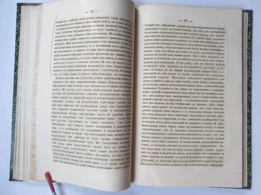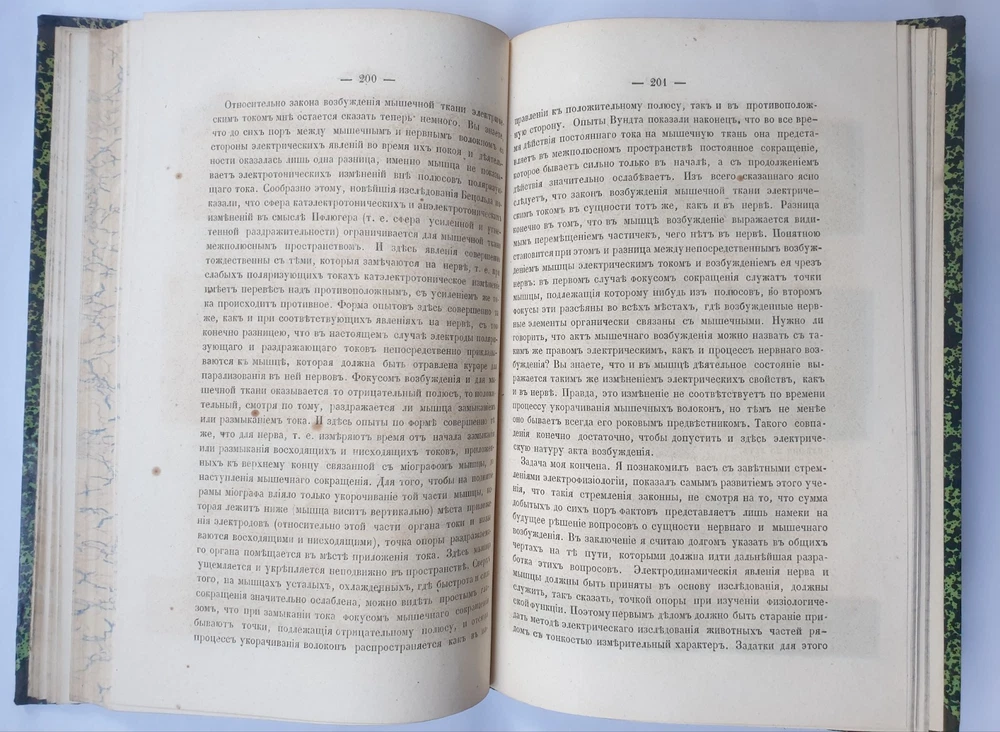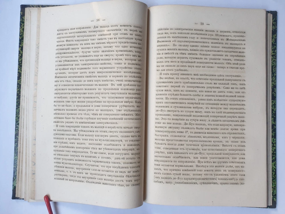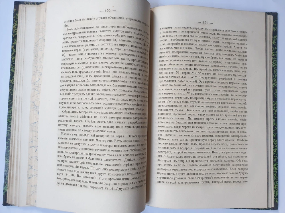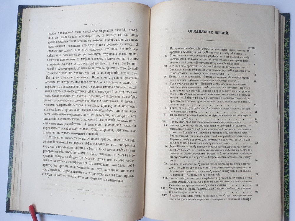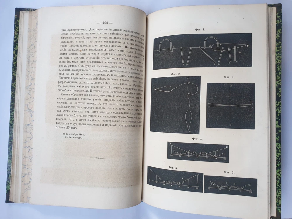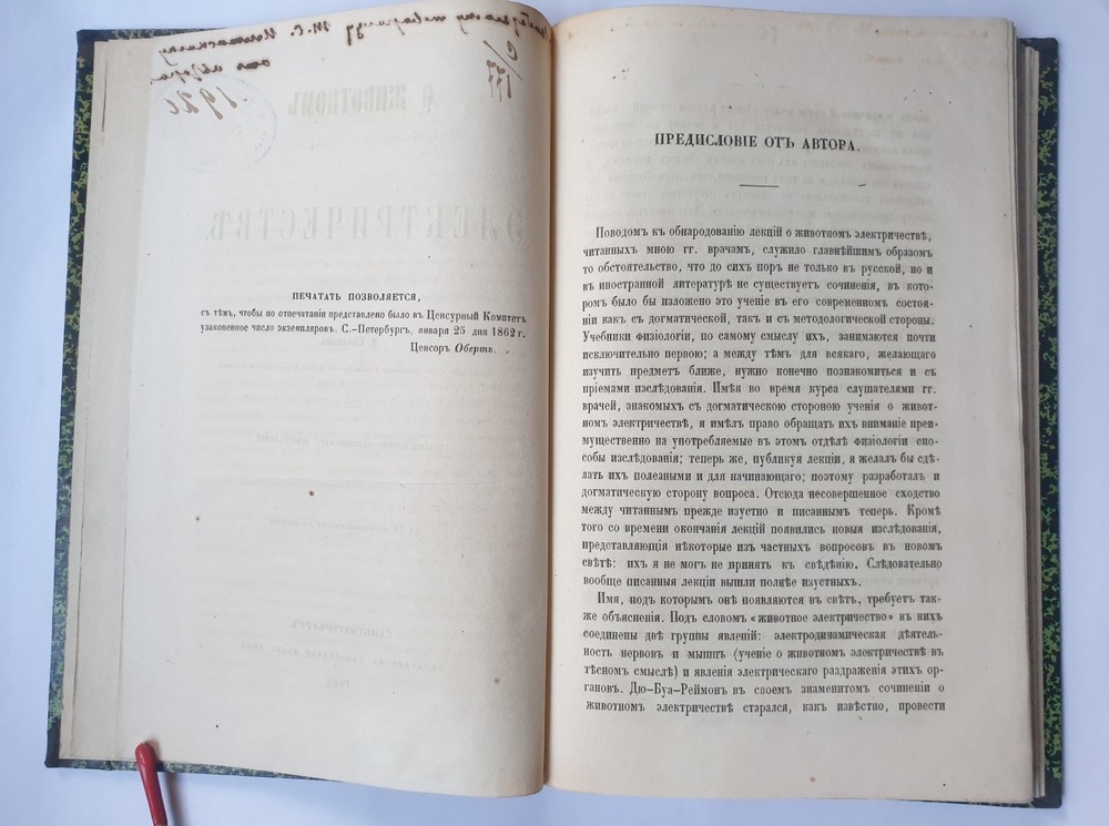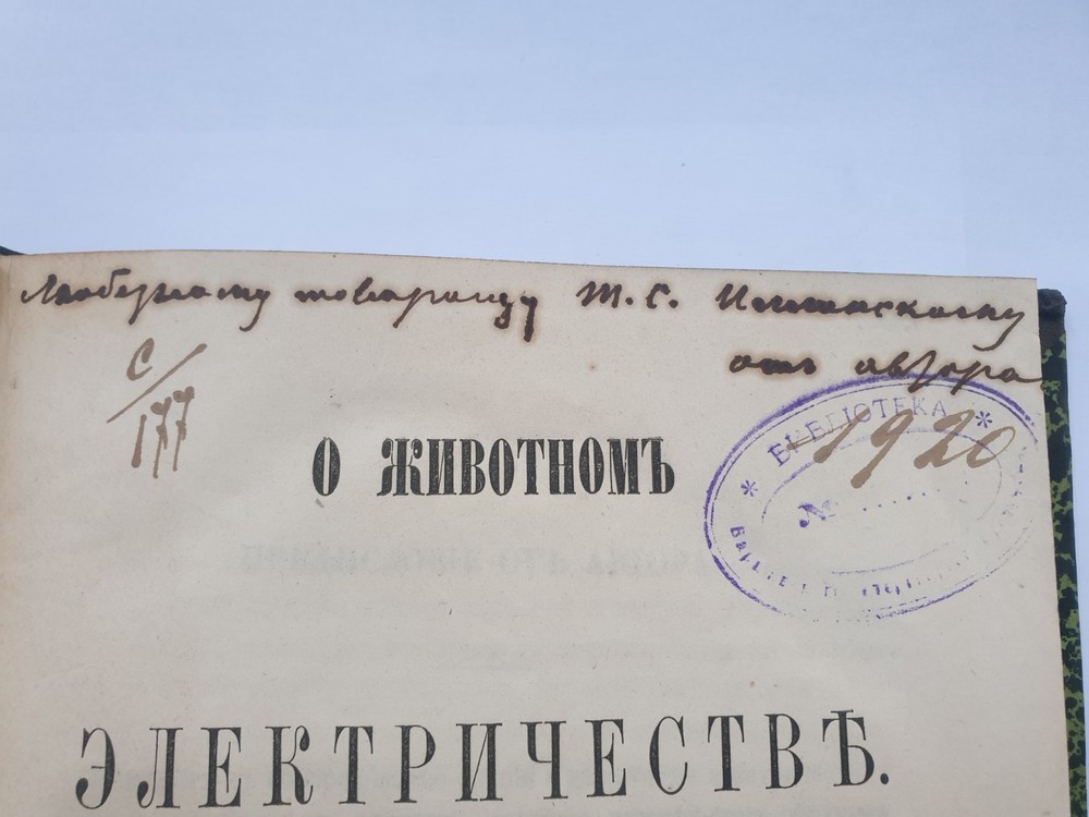 « О животном электричестве » Ива́н Миха́йлович Се́ченов СПб.: в тип. Якова Трея, 1862. VI, 202 с., 16 л. ил.; 240х160 м м. На титуле дарственная надпись. Иван Михайлович Сеченов (1 августа 1829 — 2 ноября 1905) — выдающийся русский физиолог и мыслитель-материалист, создатель физиологической школы, член-корреспондент (1869 г.), почётный член (1904 г.) Петербургской Академии Наук. В своём классическом труде «Рефлексы головного мозга» (1863 г.) обосновал рефлекторную природу сознательной и бессознательной деятельности, доказав, что в основе всех психических явлений лежат физиологические процессы, которые могут быть изучены объективными методами. Открыл явления центрального торможения, суммации в нервной системе, установил наличие ритмических биоэлектрических процессов в центральной нервной системе, обосновал значение процессов обмена веществ в осуществлении возбуждения. Исследовал дыхательную функцию крови. Создатель объективной теории поведения, заложил основы физиологии труда, возрастной, сравнительной и эволюционной физиологии. Труды Сеченова оказали большое влияние на развитие естествознания и теории познания. Кроме того, он установил закон растворимости газов в водных растворах электролитов. Общее состояние на фото.