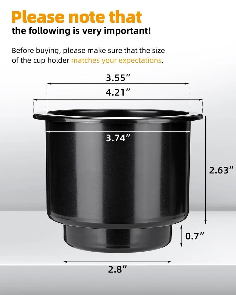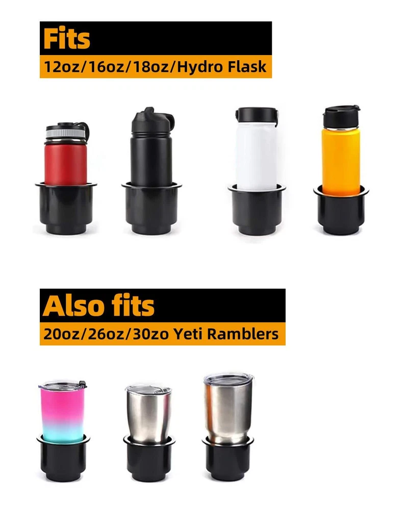 Our cup holder inserts suitable for boat, RV, or cars with 3.74"-4.1" cup base (Please measure the diameter in advance before you make the purchase). cup holder inserts also can perfect replacement couch cup holder The cup holder can perfectly hold your Hydro Flasks Yeti Ramblers or other large bottles Dimensions of the cup drink adapter: cup base of 3.74"-4.1" in diameters and fits cups of up to 3.55" in diameters. To prevent you from buying by mistake, please be sure to confirm the size before buying The package includes 4 pieces of cup holders, which can be installed such as couch, table, sofa, golf cart, dashboard, chair, backseat, furniture, etc Incompatibility: Venti and Trenta, 32oz Contigo, Toyota Highlander, 2021 Ford Mustang California special 5.0, Delivery Truck, 2019 Infiniti QX60
