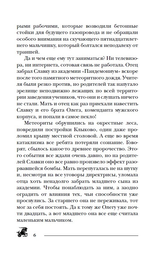 Признанный мастер молодежного фэнтези Евгений Гаглоев вновь зовет нас на поиски приключений в миры Санкт-Эринбурга! Жизнь в Санкт-Эринбурге кипит днем и ночью, – но что за ужасы скрываются за его современными фасадами и яркими огнями? Нет покоя и в окрестностях мегаполиса – тихий городок Клыково таит в себе немало страшных загадок. Вторая книга серии «Пандемониум». Тимофей, Димка и другие ученики академии каждый день узнают о себе что-то новое. Но их чудесные способности – источник не только удовольствия, но и бесконечных опасностей. Кто знает, какими жуткими приключениями может обернуться для юных Первородных обычная экскурсия? А как защитить их от рвущихся из небытия древних черных колдунов? Преподаватели академии день и ночь ломают голову, как уберечь своих подопечных, которые пока плохо представляют себе враждебный мир, готовый уничтожить их в любой момент.