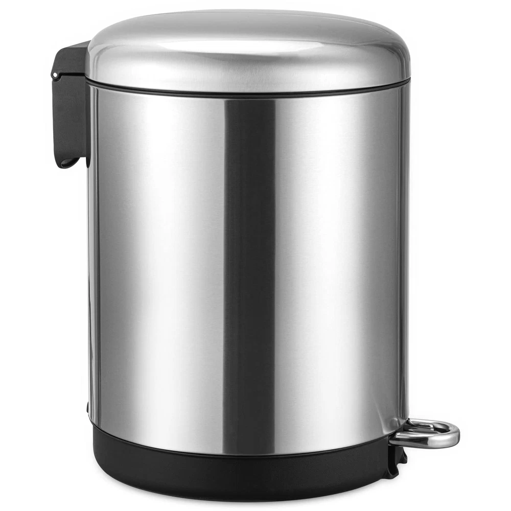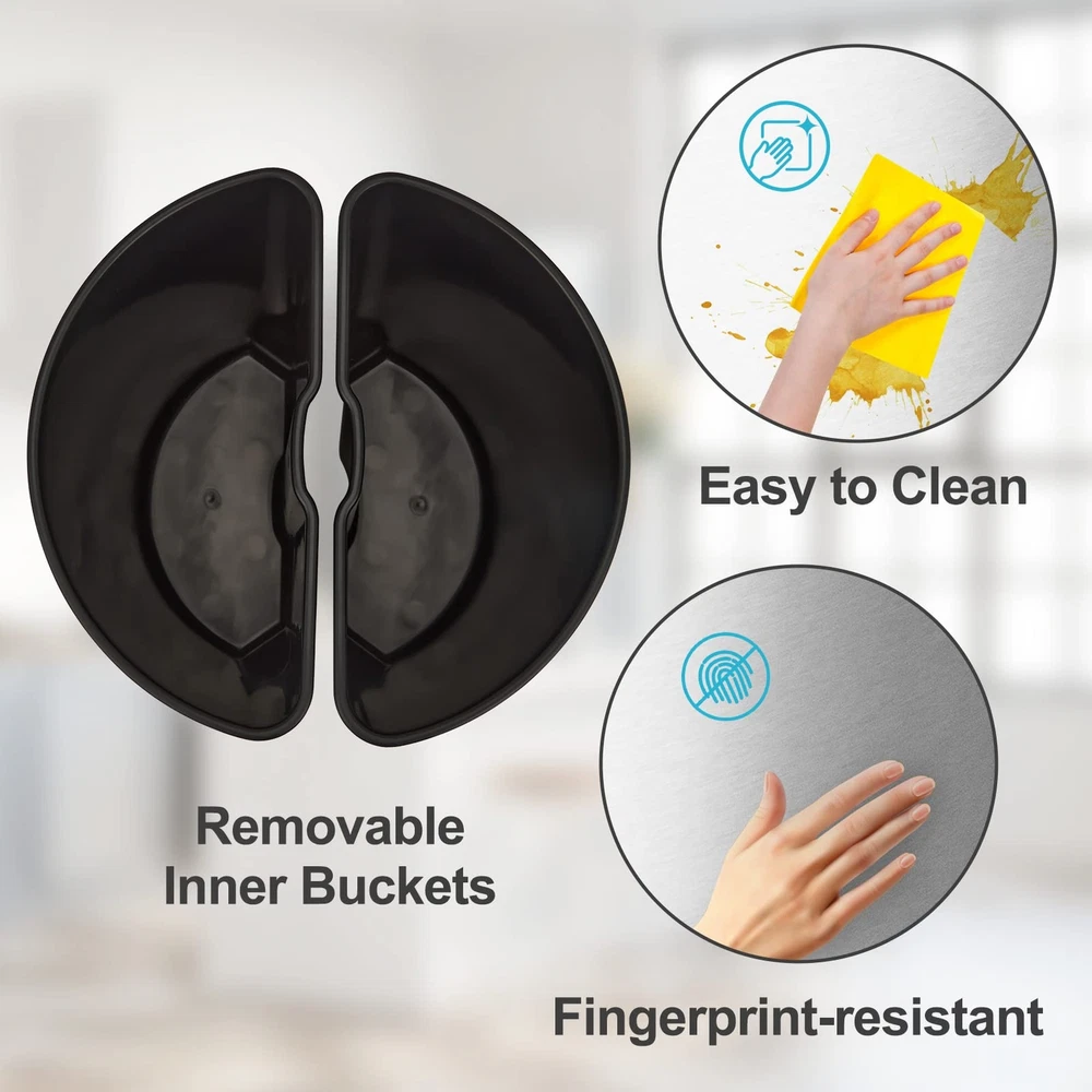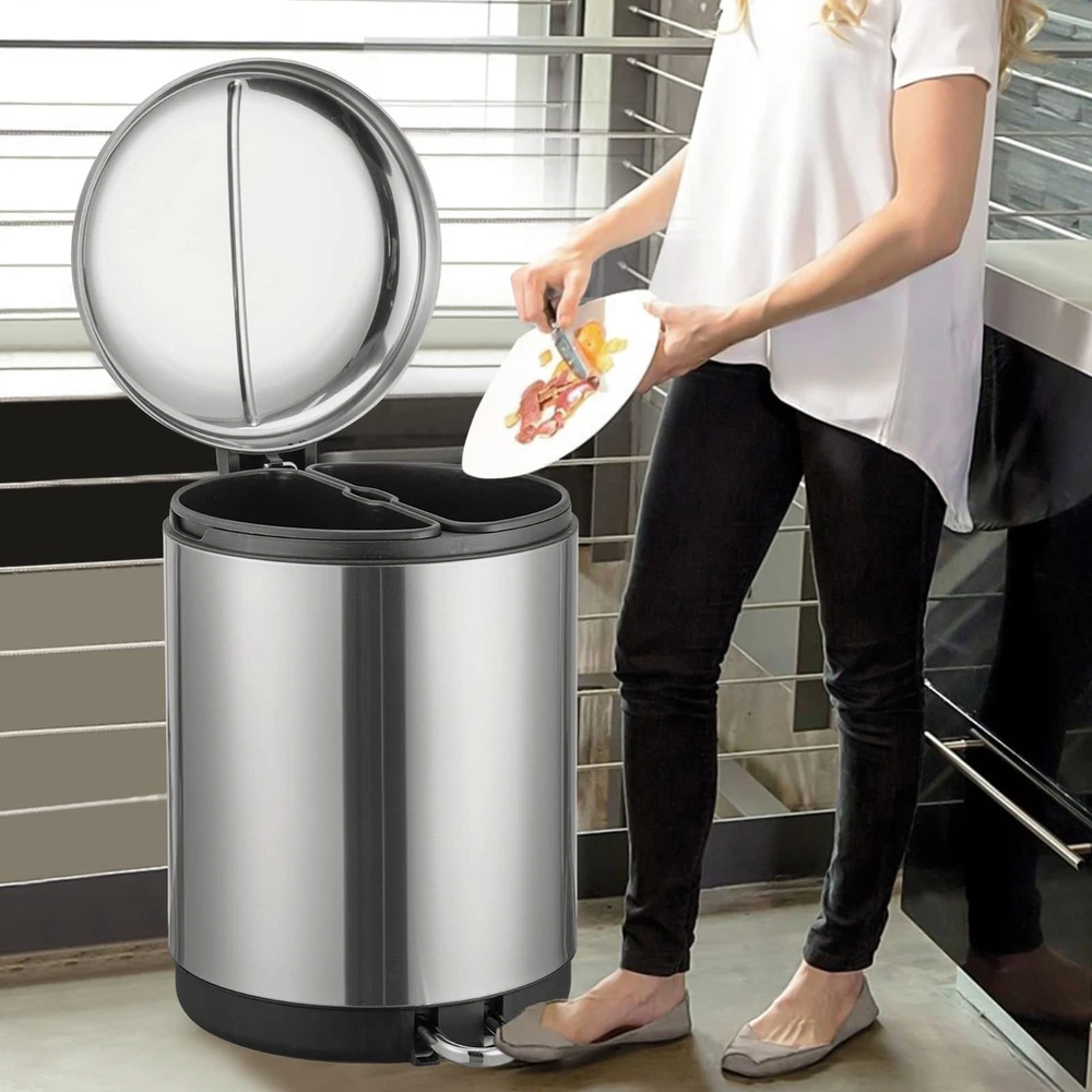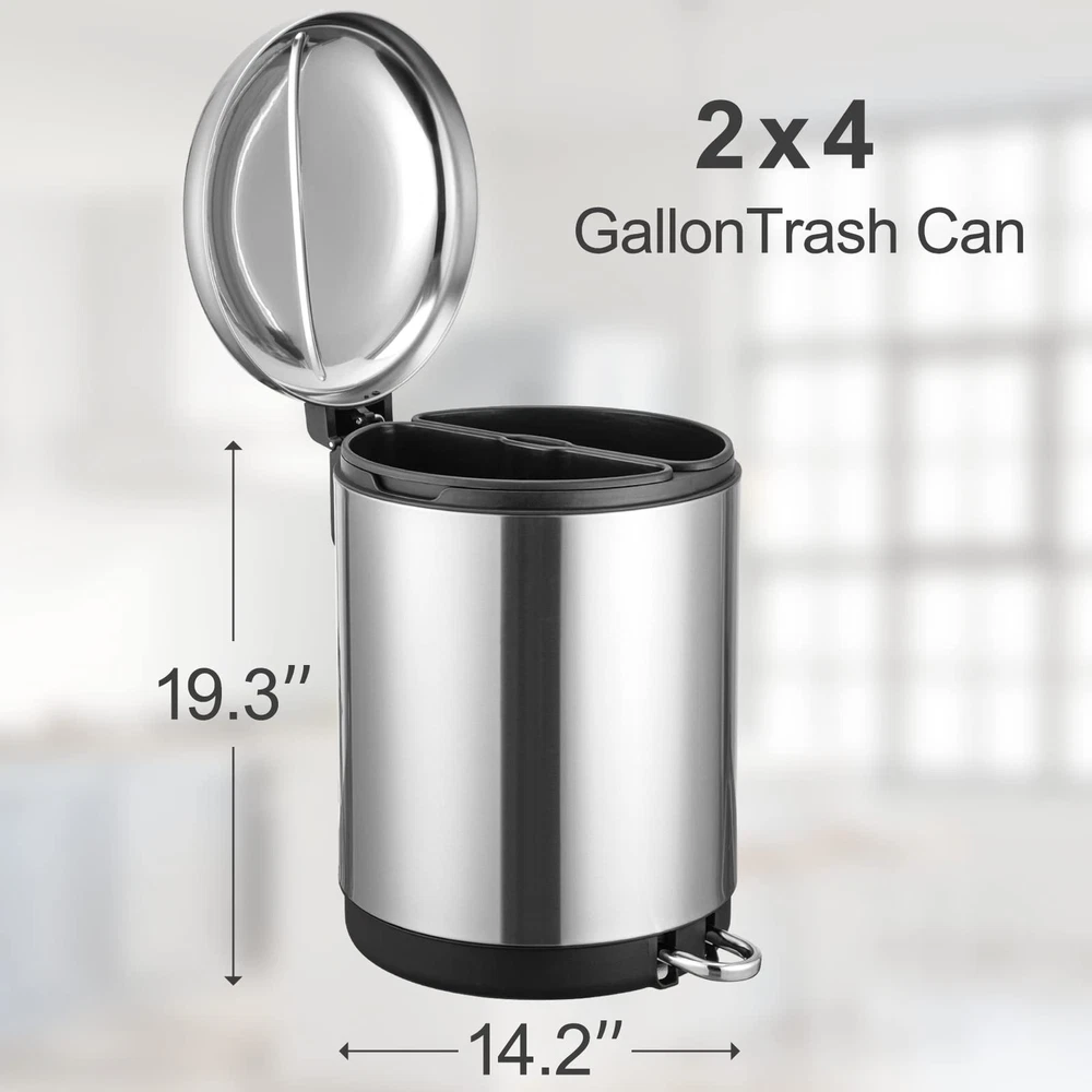Dual Trash Can, 2 x 4 Gal Garbage Can, 2 Compartments, Steel Pedal, Plastic Inner Buckets and Soft-Close Lid, Round Stainless Steel Hands-Free Kitchen Recycle Bin Silent Close Lid: The soft-close lid ensures the environment remains peaceful, the design of internal hinge prevents the lid from bumping the wall. No loud slamming to be heard. Neat Kitchen Environment: The stainless steel material resists fingerprints and the spread of dirty things without dulling the natural sheen and luster of the steel. Bottom seal, enjoy a cleaner environment. Strong Steel Pedal: This kitchen trash can with strong steel pedal. It’s hard to open the lid of a rubbish bin with your hands when you are busy in the kitchen. The pedal-type garbage can solves this problem well, letting you have your hands free to tuck away your waste. Standing Function: While the manual cover opening angle is greater than 90 degrees, it's convenient for kitchen use or peeling. (Note: The cover cannot be opened for a long time when the foot is less than 90 degrees, and it can be opened and closed when the foot is pressed.) Dual Compartments Trash Can & Bucket in Bin: Double inner barrel design, dry and wet classification, recyclable and non-recyclable classification. The inner bucket has a storage hole. Put on the garbage bag(minimum 45cm opening, height 60cm) and roll the bag mouth to make it more stable.