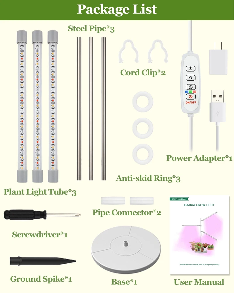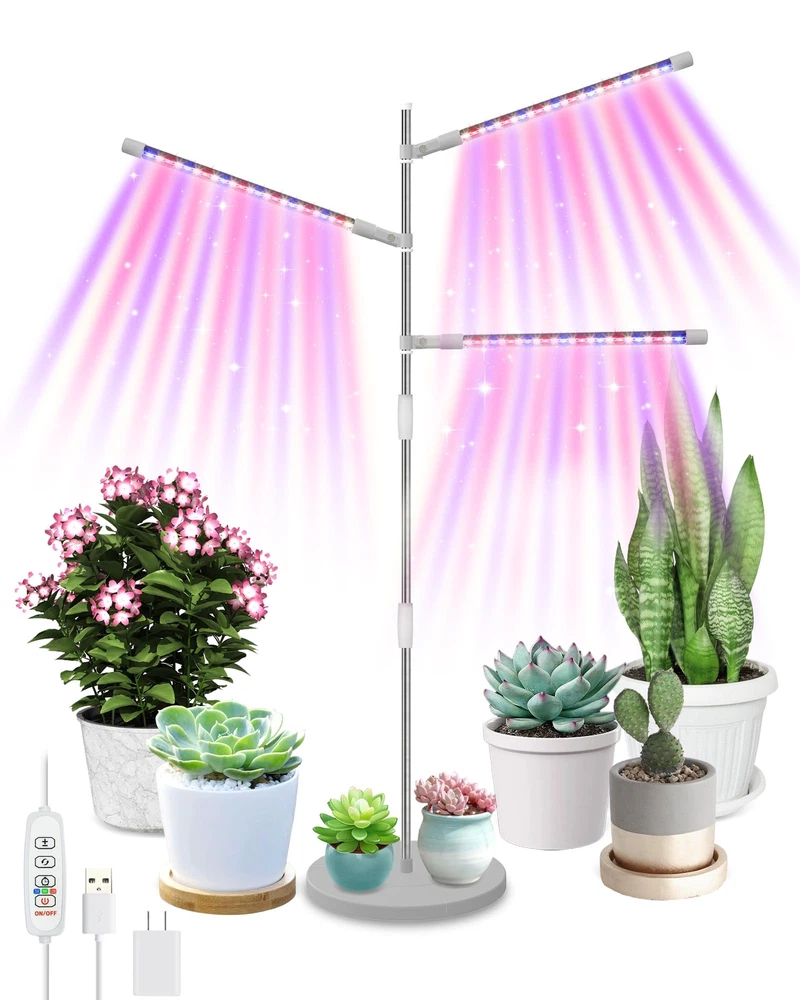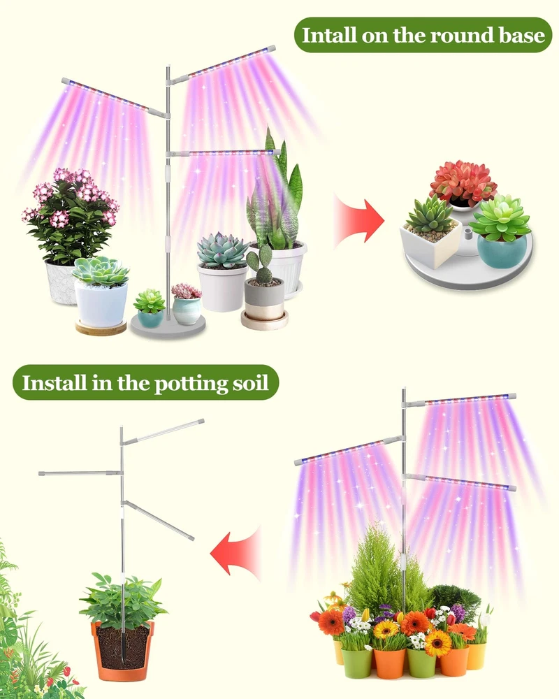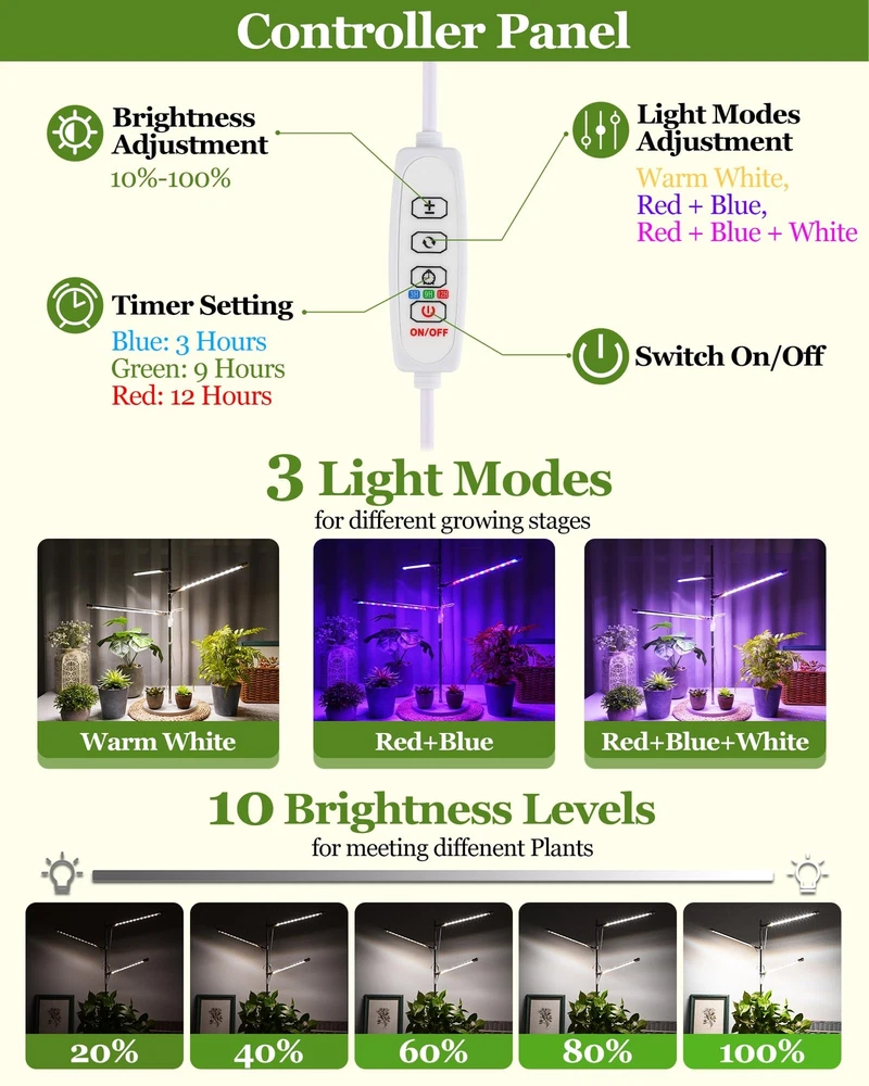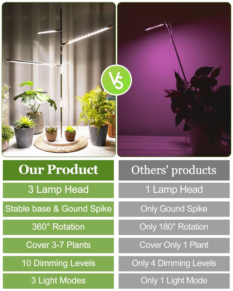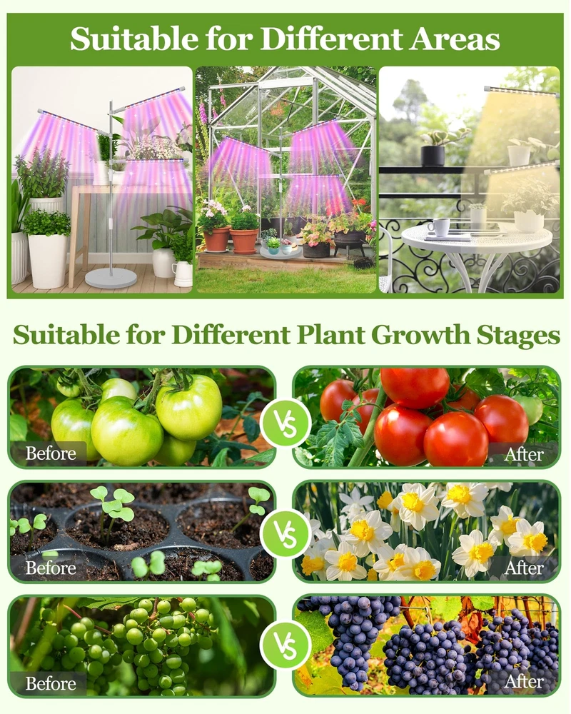 Upgraded Design and Greater Coverage: Compared with other clip-on and hanging plant lights, our indoor plant light features an upgraded design that not only can be placed securely by the round base, but also can be used by inserting the pole into the potting soil. The unique triple head design provides a wider range of illumination for your indoor plants, allowing your plants to get more and better light energy 3 Spectral Modes and 10 Brightness Levels: The grow light lamp for indoor plants is equipped with 72 LEDs (36 white +18 red +18 blue) and 3 spectral modes (red + blue + warm white, red + blue, warm white) with adjustable brightness from 10% to 100%. You can choose the right mode and brightness to meet the light needs of plants at different stages of life 360° Rotation and Height Adjustment Stand: Equipped with 360 degrees rotatable and height adjustable stand, the plant light for indoor plants not only allows you to easily adjust the angle between the plant light and your houseplants but also adjusts the height up to 90cm, suitable for indoor plants of different heights 3 9 12H Auto On/Off Timer: The full spectrum LED grow light supports 3, 9, 12H timer with auto cycle memory timer function, it can be automatically turned on/off every day according to your settings, no need to do it manually anymore, make sure that your plants absorb enough light for photosynthesis and have enough rest time. Even if you are not at home, the plant light will take care of your plants every day Wide Application: indoor plant light for growth in winter is designed for plant growth, it can meet the light needs of various flowers, vegetables, fruits, succulents and other small plants or desktop plants at different stages of life, suitable for balconies, greenhouses, dark rooms, offices and so on. Especially when plants need light in rain, snow, or indoor darkness, it gives your plants intimate care