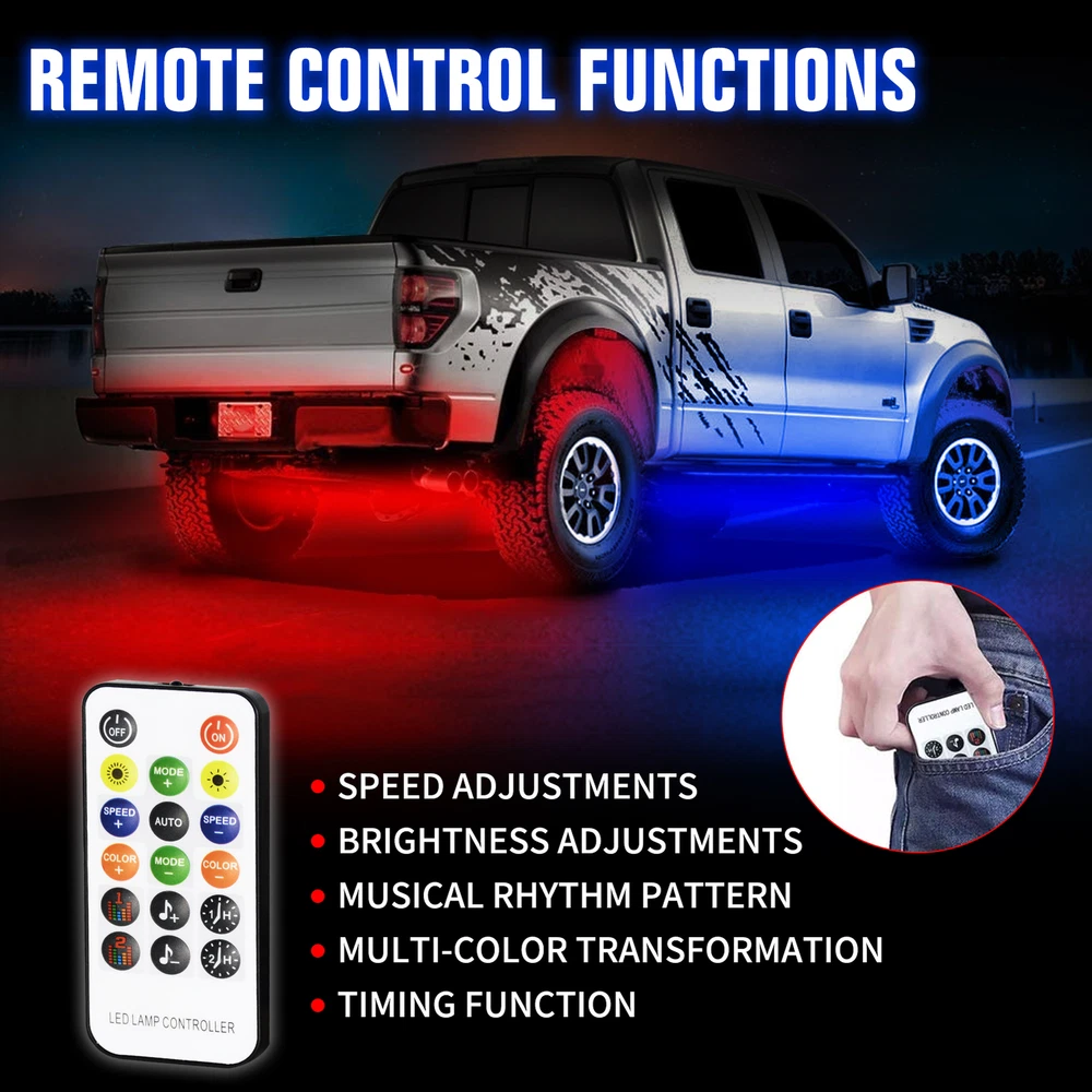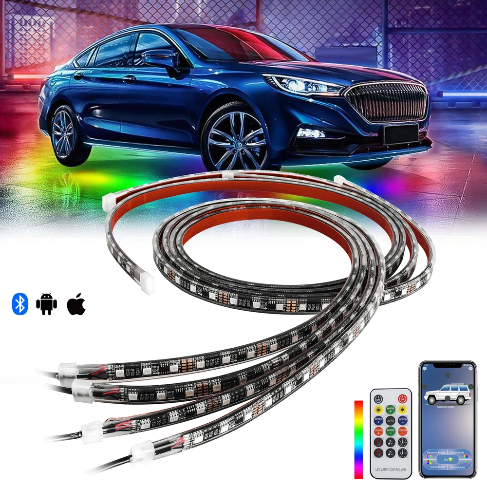 About this item: High quality: 4PCS Car Underglow Lights are made of high brightness SMD 5050 LED chips , 3 In 1 RGB Chips with flexible PVC rubber; Waterproof, Robust, Rust-proof; and our LED under car glow system can be connected to any DC 12V USB port; Not only suitable for Car exterior, But can also motorcycles, boats, trucks, TV lighting, Home, KTV, Party decortaion, etc. Control Modes: 17 keys remote control, APP control will help you avoid connecting issues, which you can use them to adjust the change speed, brightness and stroboscopic speed. The car underglow strip lights for car led lights exterior is built-in sensitive mic, which make it glow and dance to the rhythm of your music, enjoy every driving! Dream Color Chasing lights: The Undercar Strips Lighting Kits built-in Kinds of Color Chasing Modes looks like recurrently chasing, skipping, dancing, twinkling on the strip. You can make your favorite chasing lights effect underglow the car or DIY a static color for lighting. Increase the safety of driving during the day and night and the appearance of the vehicle. Easy installation: Flexible LED RGB Chassis strip lights can be bended easily, strong 3M adhesive, additional zip ties and screws equipped definitely hold it on place firmly. DC12V , IP67 waterproof, Never worry about the safety of the Car bottom light. You can install them in your car with flexibility. Package includes: 4 x Car Underglow Neon Accent Strip lights 1 x Remote Control 1x Control Box & Wiring On Nov 12, 2024 at 00:11:07 PST, seller added the following information: