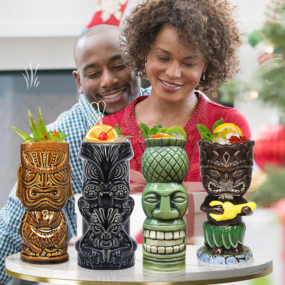 [HIGH QUALITY]:These tiki mugs made with the sturdy ceramic, sturdy, not easily broken.Moreover, as the tiki glasses are glazed they are much longer-lasting with their colors intact. [BEAUTIFUL DETAILS and DESIGNS]:Tiki mugs have been carefully crafted in elegant shapes with creative designs and high-quality artwork. The great gift for all collectors and lovers. Will be a great choice for your tiki bar or home collection. [BEST GIFT]: These cute ceramic cocktail glasses are ready to let you enjoying exotic drinks with your girlfriends on the patio or hosting a Hawaiian party.Great for bar, restaurant, home, cocktail party, beach party, wedding party, Halloween party. [CARES INSTRUCTIONS]: After you use it, we recommend that you use hand wash to protect your TIKI mugs. [HAPPY PURCHASE]: If you have any questions, please contact us, we will solve it for you as soon as possible. Provide you with the best service. Product Description Tiki Mugs Set of 4 GREAT DRINKWARE FOR YOUR BAR Tiki bars and restaurants have always provided a form of escape for their customers. Let them feel traveling to a tropical destination serving your creative cocktails in these funny ceramic cups and they will want to come back again. HIGH QUALITY Tiki mugs are heat-resistant, durable, and have a good strength to hold liquids of varying temperatures. Moreover, as the tiki glasses are glazed they are much longer-lasting with their colors intact. BEST GIFT These cute ceramic cocktail glasses are ready to let you enjoying exotic drinks with your girlfriends on the patio or hosting a Hawaiian party.Great for bar, restaurant, home, cocktail party, beach party, wedding party, Halloween party. -These ceramic tiki mugs are ready to let you and your friends enjoy exotic drinks. -Creative design mug brings exotic fun to every cocktail you serve. These tropical cocktail mugs set are perfect near your tiki bar or pool. Material: Ceramic Please Note: These ceramic Tiki Mugs are handmade and hand painted so there may be a slight variance in shape and colour. Hand wash only