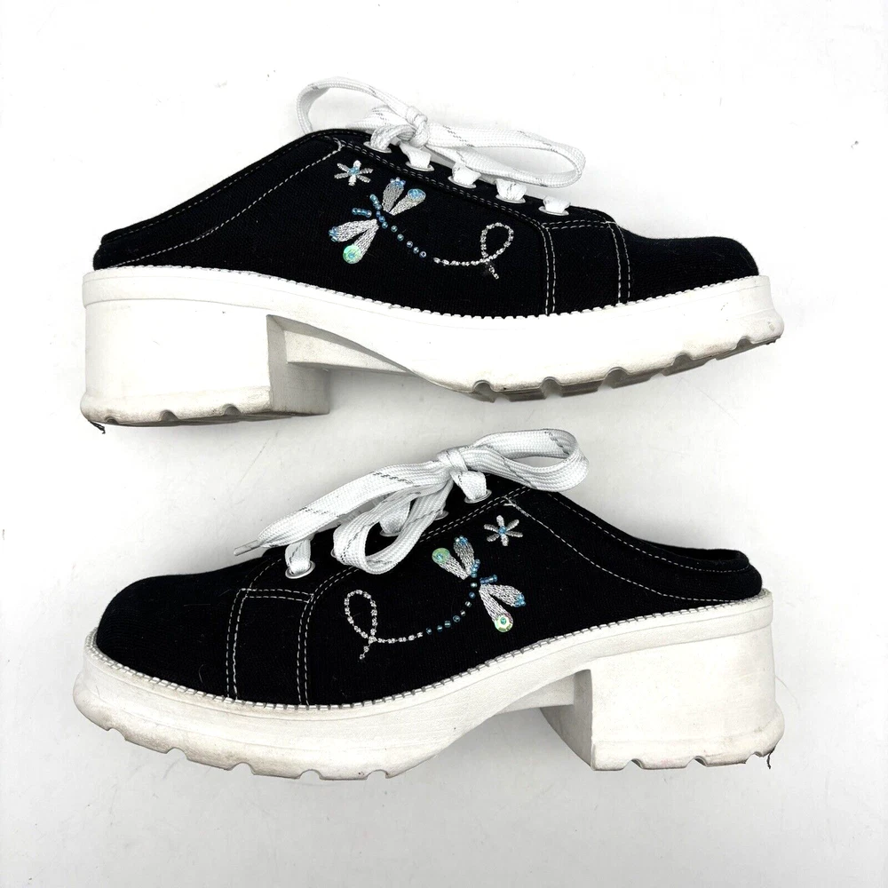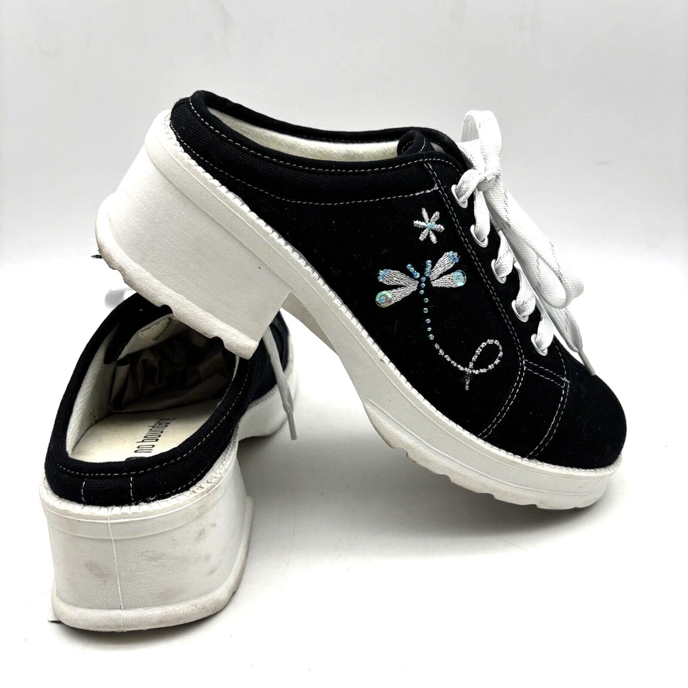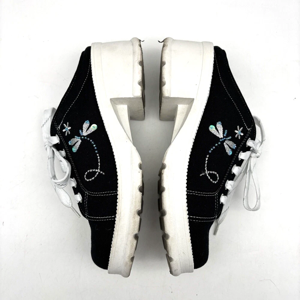 Vintage 90s Y2K No Boundaries Platform Sneakers Model: MICHELE Black Canvas Upper Lace Up Slip On Open Back Round Toe Block Heel Metallic Silver Embroidered Beaded Dragonflies on Sides Shoe Width: Standard 2.5" heel 1" platform Women's Size US 8.5 UK 6.5 EU 39 Great vintage pre owned condition. Gently owned. Mild wear on soles - shown in photos. Otherwise, no rips, tears, stains, holes or other notable flaws. Clean and from a smoke free home.