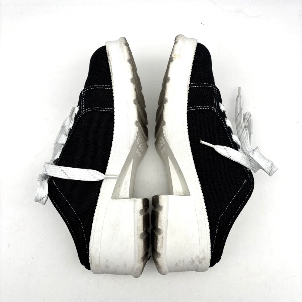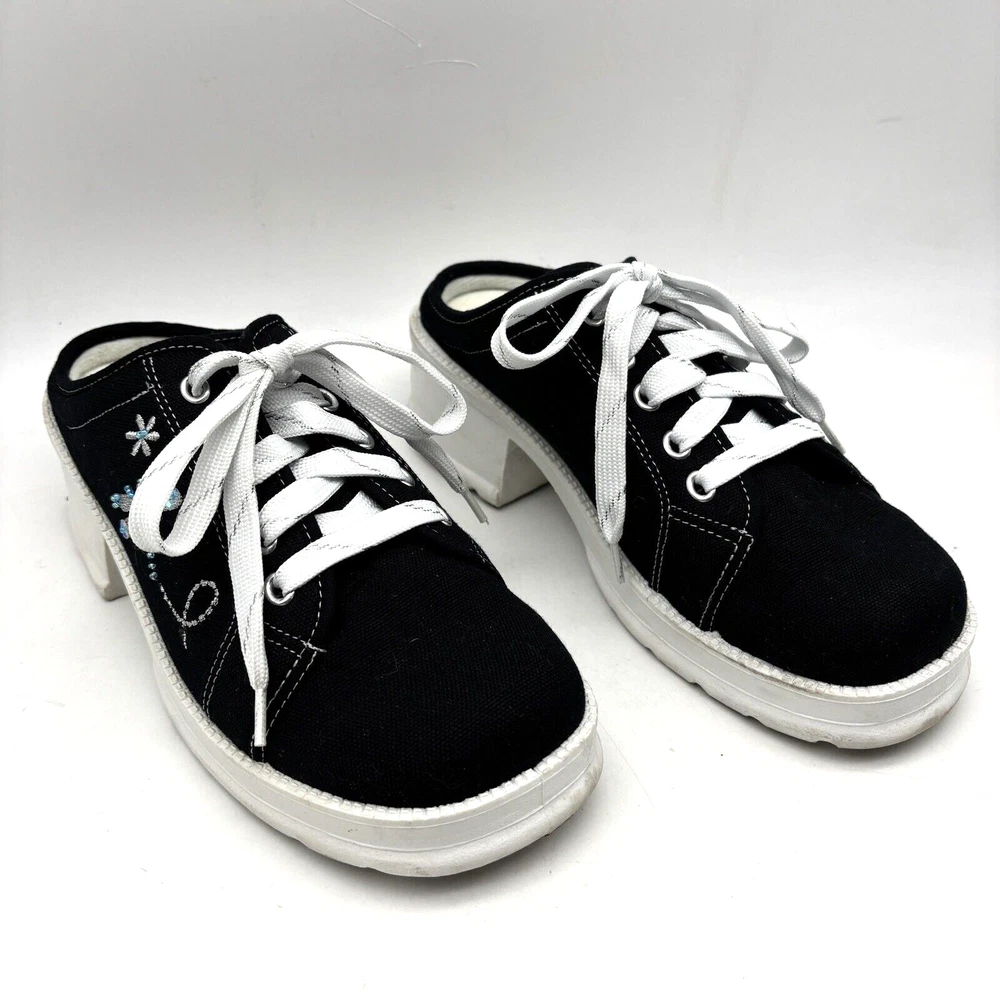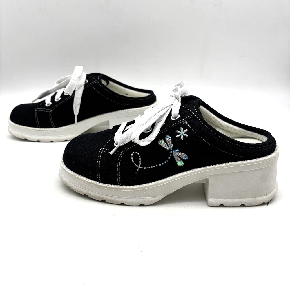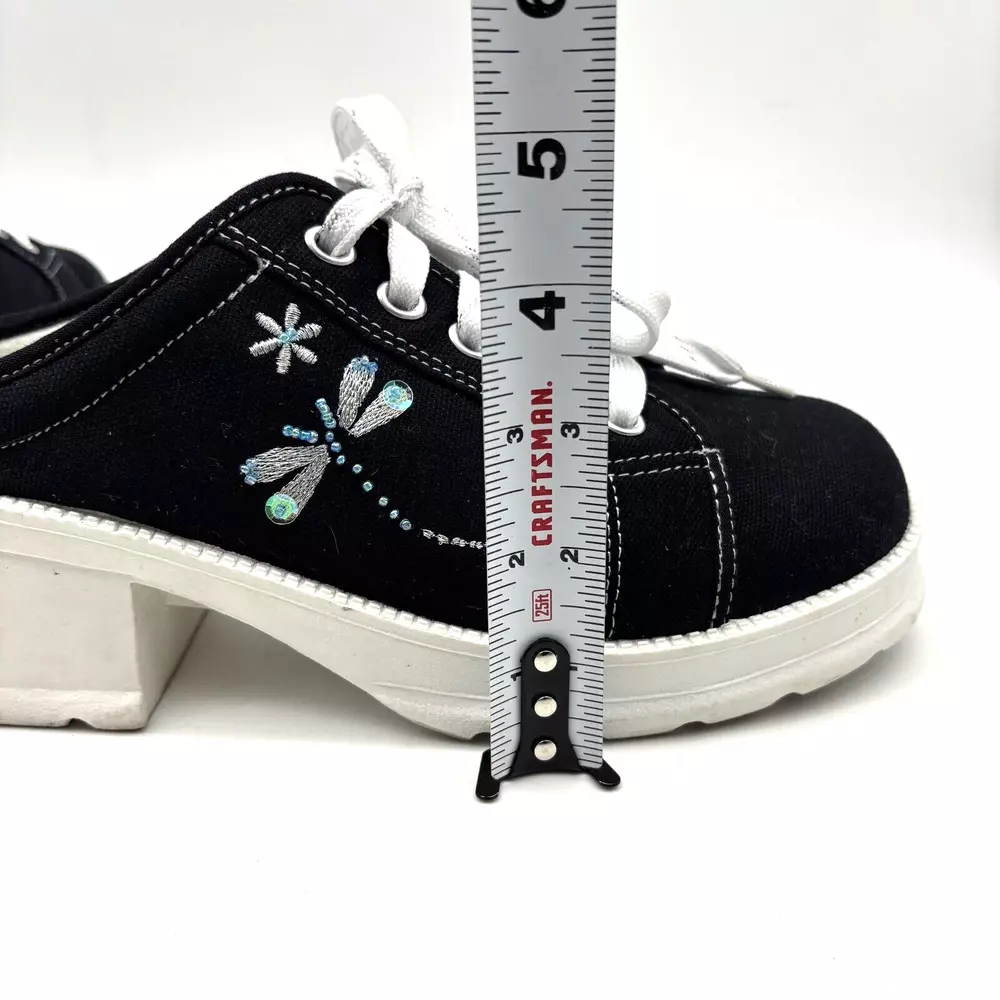 Vintage 90s Y2K No Boundaries Platform Sneakers Model: MICHELE Black Canvas Upper Lace Up Slip On Open Back Round Toe Block Heel Metallic Silver Embroidered Beaded Dragonflies on Sides Shoe Width: Standard 2.5" heel 1" platform Women's Size US 8.5 UK 6.5 EU 39 Great vintage pre owned condition. Gently owned. Mild wear on soles - shown in photos. Otherwise, no rips, tears, stains, holes or other notable flaws. Clean and from a smoke free home.
