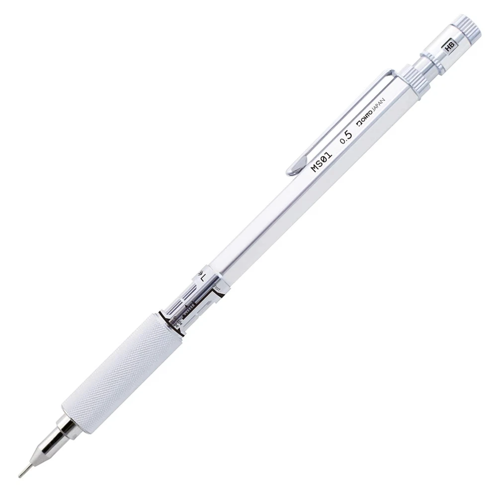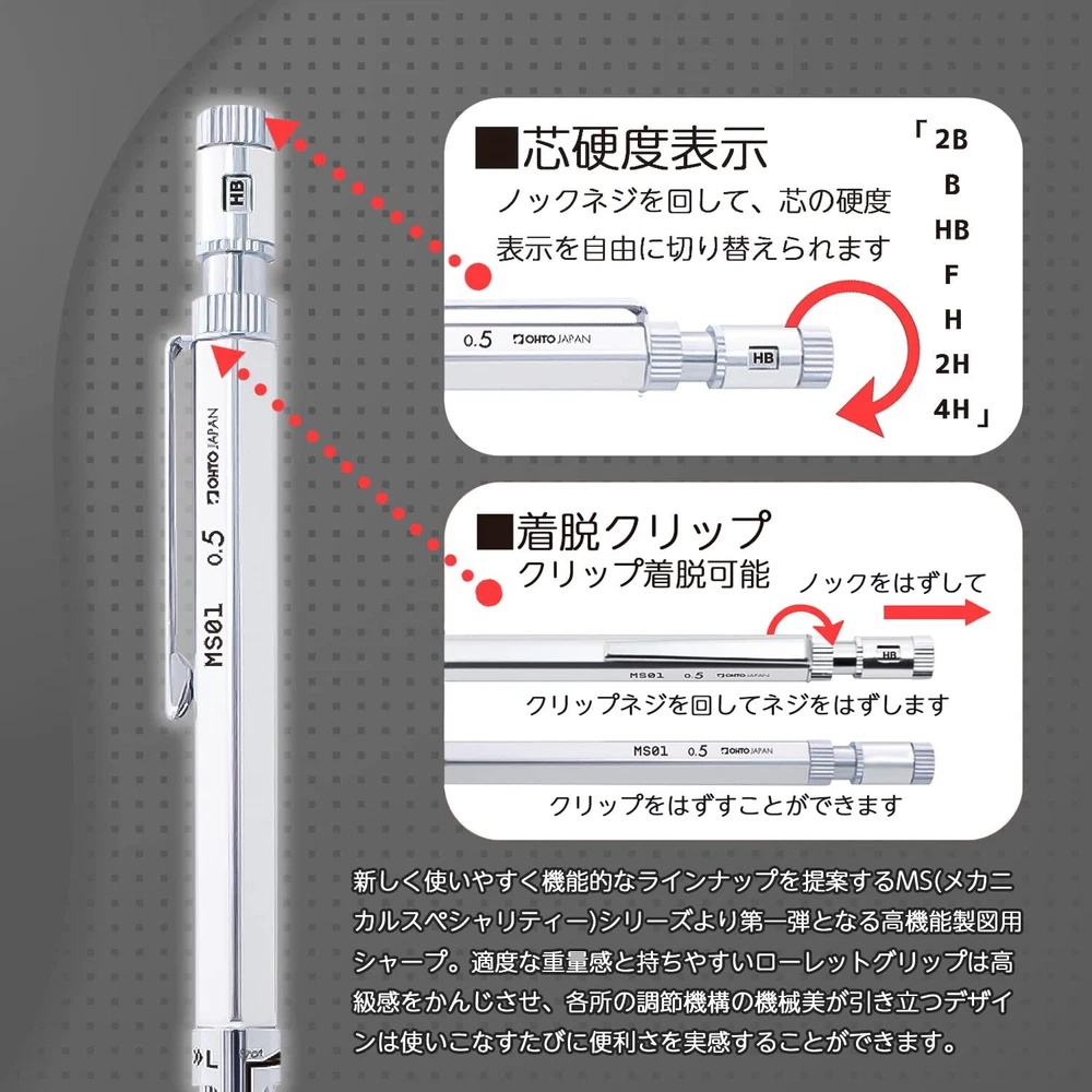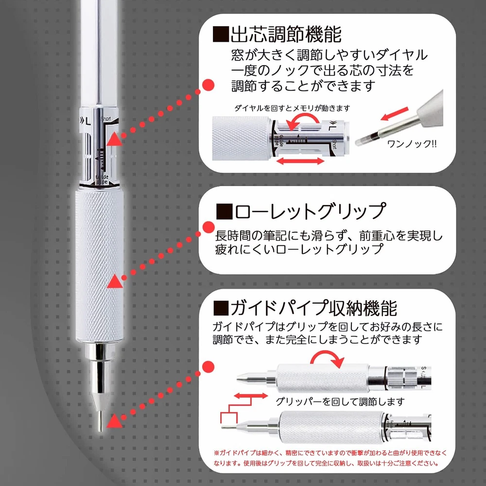 Professional high-performance sharp that can also be used as a drafting tool. 3-tier taper that makes it easy to see lines and letters while writing. Guide pipe adjustment mechanism: Can be adjusted according to the thickness of the ruler. Adjustment Mechanism: The length of the lead is adjustable with one knock. Knock cover has a hardness display window. High performance sharp that can adjust the length of the guide pipe and the length of the lead you are sending out Size: Total length 5.9 x shaft diameter 0.4 x maximum diameter 0.4 inches (151 x 10 x 11 mm); Weight: 1.0 oz (27 g) Material: Gripper, Dial, Tip, Knock: Brass, Knock Cover, Rear Shaft: Aluminum, Clip: SK material Lead diameter: 0.02 inches (0.5 mm) Country of Origin: Japan