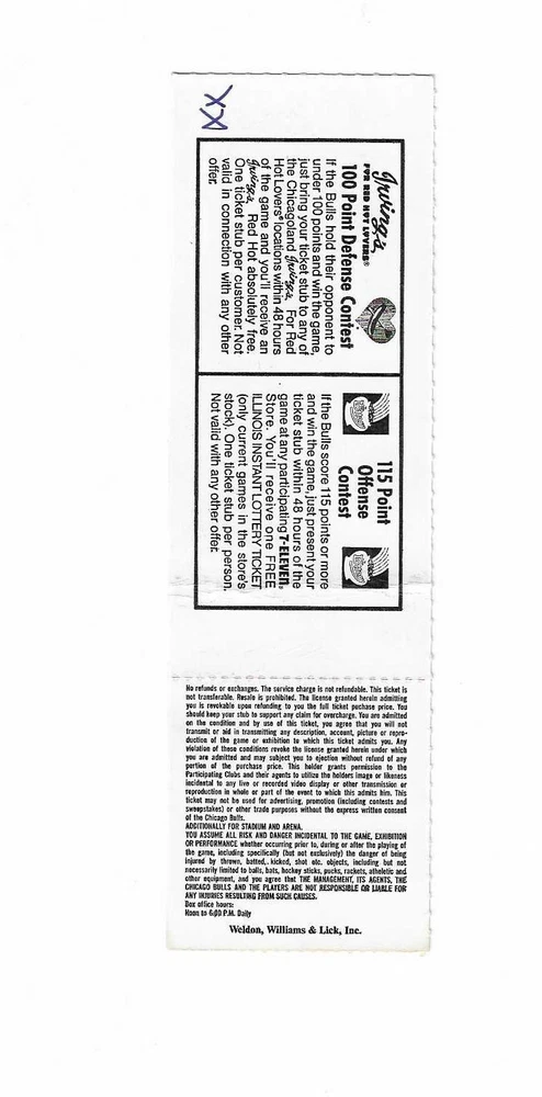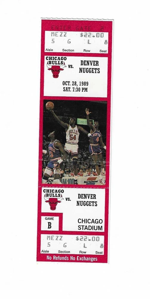 Chicago Bulls vs Denver Nuggets Unused Basketball Ticket From October 28, 1989 Here is 1 unused Chicago Bulls vs Denver Nuggets unused Basketball Ticket from October 28, 1989. The game took place at The Chicago Stadium in Chicago, Illinois. The ticket is in fair condition and would make an excellent addition to your collection. Payment Payment is due within 24 hours of sale. Shipping Your item will be shipped within 24 hours of receipt of payment via US Mail. Terms and Conditions All Sales are final. No Refunds