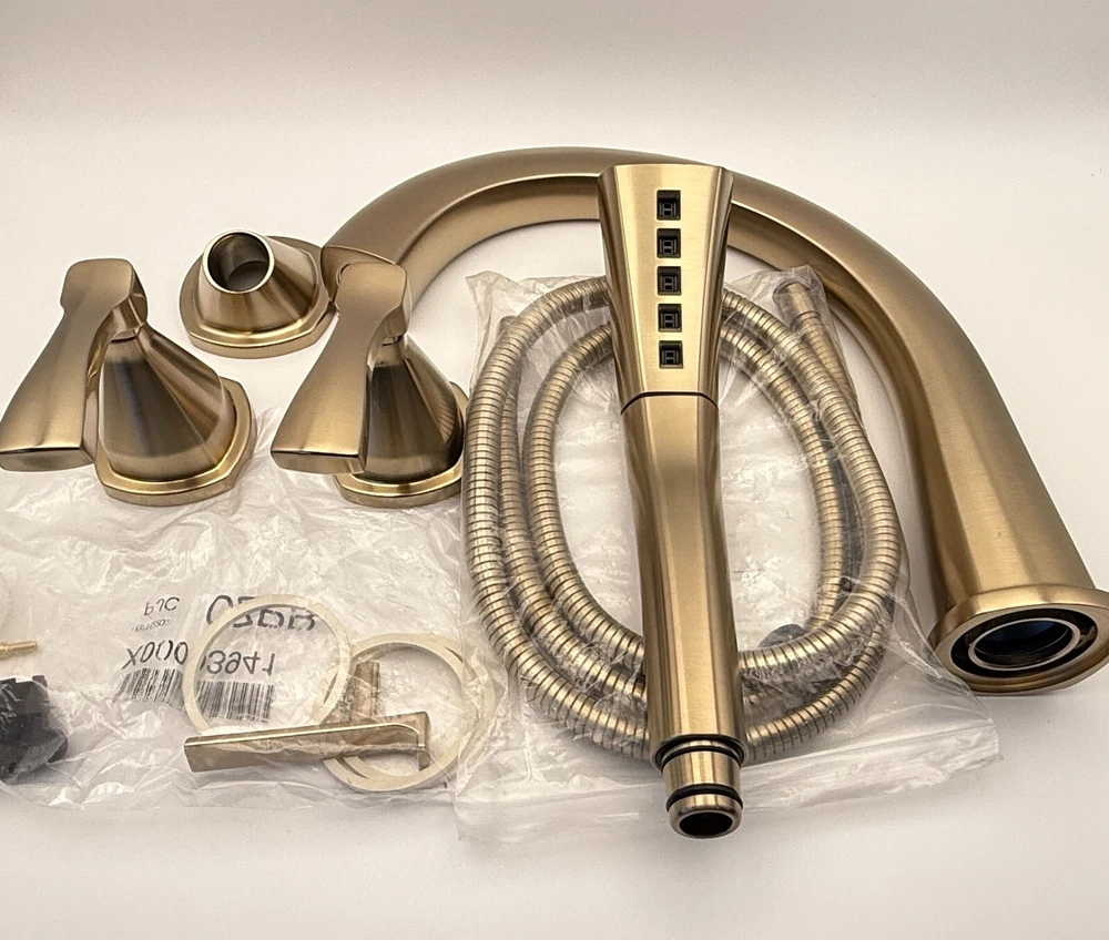 Delta Faucet Stryke Roman Tub Faucet - T4777-CZ - Bathtub Handles, Faucet & Diverter - Modern Bathroom Fixtures - Champagne Bronze, Lever Handles (Valve Sold Separately) Discover the perfect blend of style and functionality with the Delta Faucet Stryke Roman Tub Trim Kit. Designed to create a striking aesthetic in your bathroom, this trim kit features a gracefully arched spout and sleek, ADA-compliant handles that bring a touch of modern elegance to any space. The hand shower included offers versatility and ease, allowing you to direct water exactly where you need it. It's ideal for rinsing off, bathing children, washing pets or simply keeping your tub pristine. This tub faucet not only enhances the visual appeal of your bathroom but also offers a water-efficient solution without compromising on performance. Thanks to the innovative H2Okinetic hand shower, you'll experience the sensation of more water while actually using less, making it a smart choice for the eco-conscious homeowner. The hand shower's unique wave pattern ensures a powerful drench spray, providing a luxurious and invigorating bathing experience every time. This trim kit is thoughtfully engineered for a seamless installation. It is designed to fit 4-hole installations with 8–16 inch configurations, giving you the flexibility to upgrade your bathtub's faucet and handles with ease. Please note the R4707 rough-in valve is required and sold separately. Embrace the sophisticated design and superior quality of the Delta Faucet Stryke Roman Tub Trim Kit as it transforms your bathing ritual into a spa-like escape within the comfort of your own home. At Delta Faucet, our mission is to help you make lasting changes in your home and help change the way you interact with water. From human-first innovations to unforgettable design, our faucets, showerheads and beyond aim to make every moment you spend in your kitchen or bathroom one worth remembering.