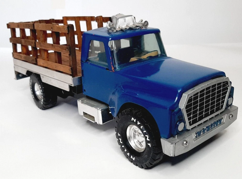 Vintage Ertl International Loadstar 1600 Stake Truck Blue Diecast Model Vehicle Good condition with only minor issues; horns on hood are a little warped; smoke stack is slightly detached; minor finish wear