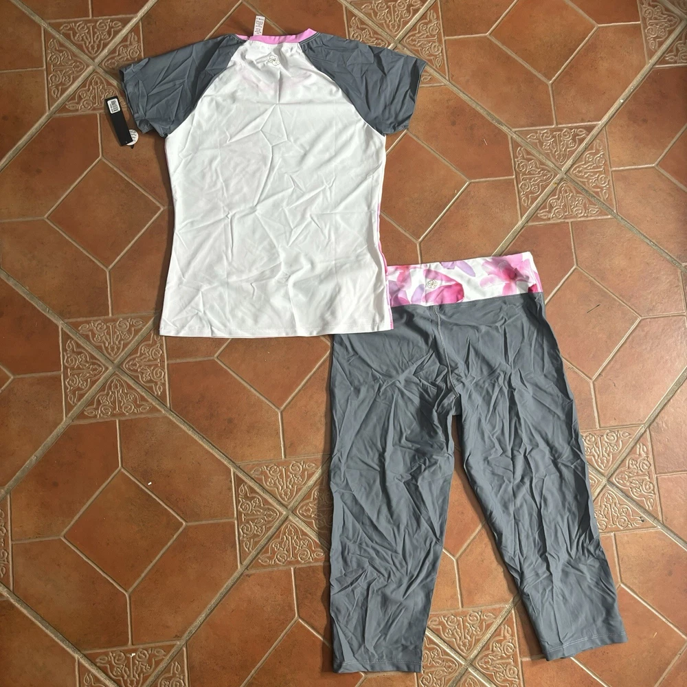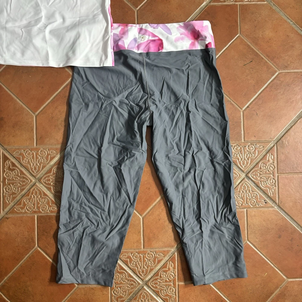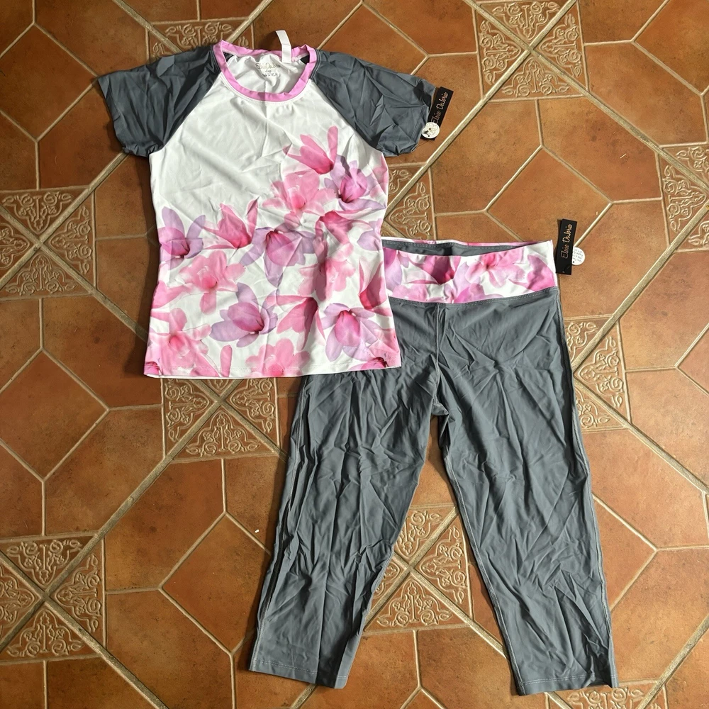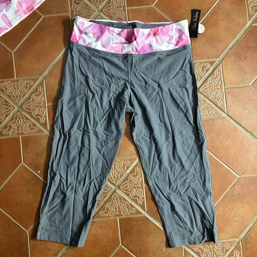 Eloise DeJoria Grey Pink Floral Leggings and Top 2 Piece Workout Set Women Size L Brand new with hanging tags intact. No tears/holes or stains. Brand label says fits a women’s size large. Includes grey capri leggings with white and pink floral banding, and white short sleeve workout top with pink floral around the base, pink trim, and grey sleeves. I have other Eloise DeJoria athletic wear in this size, check my page for other options and reach out to bundle. Grey & Pink Floral set #2
