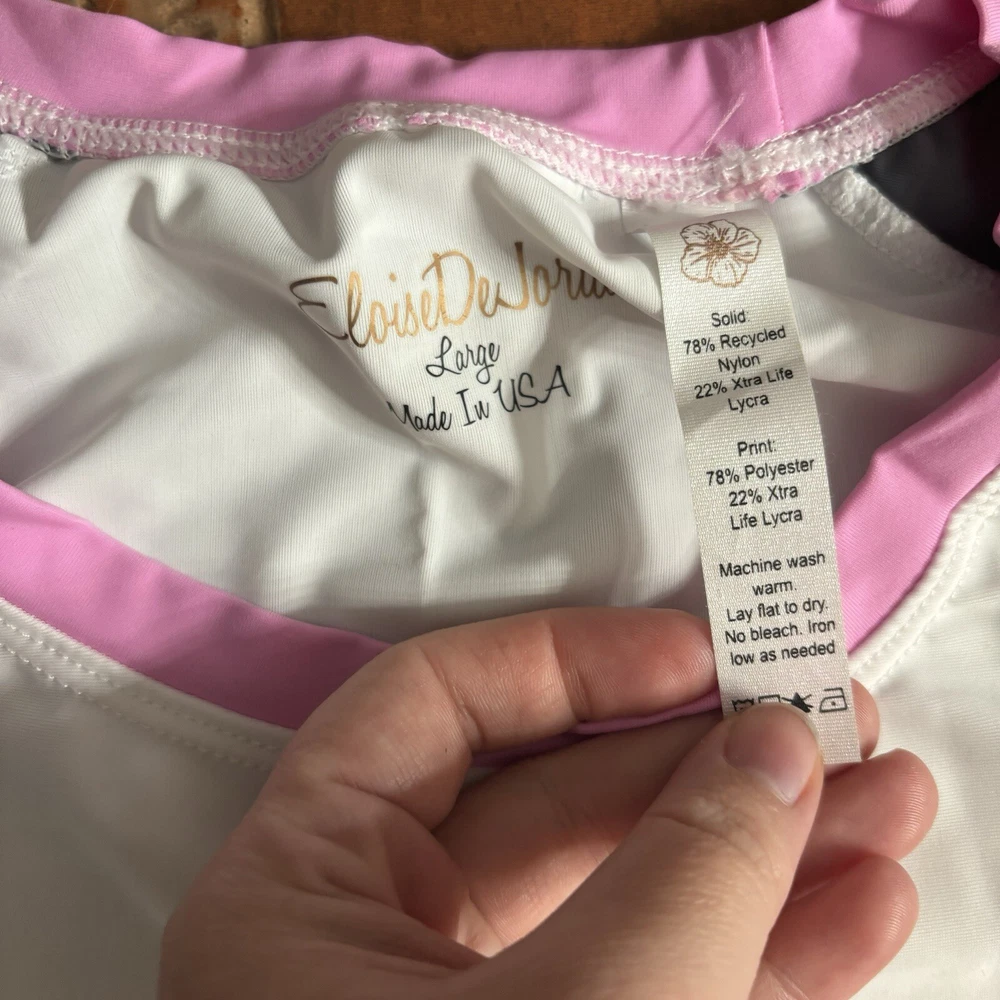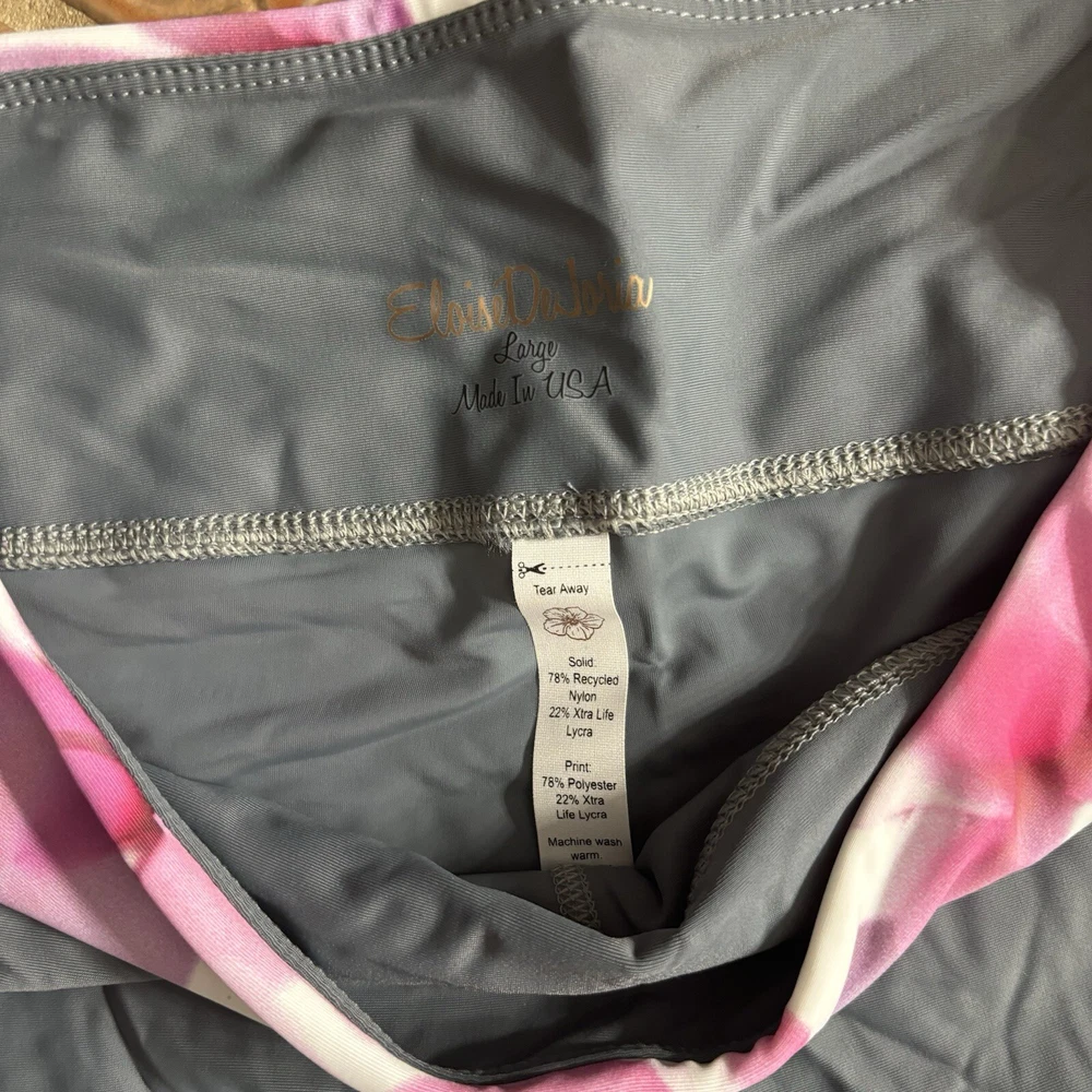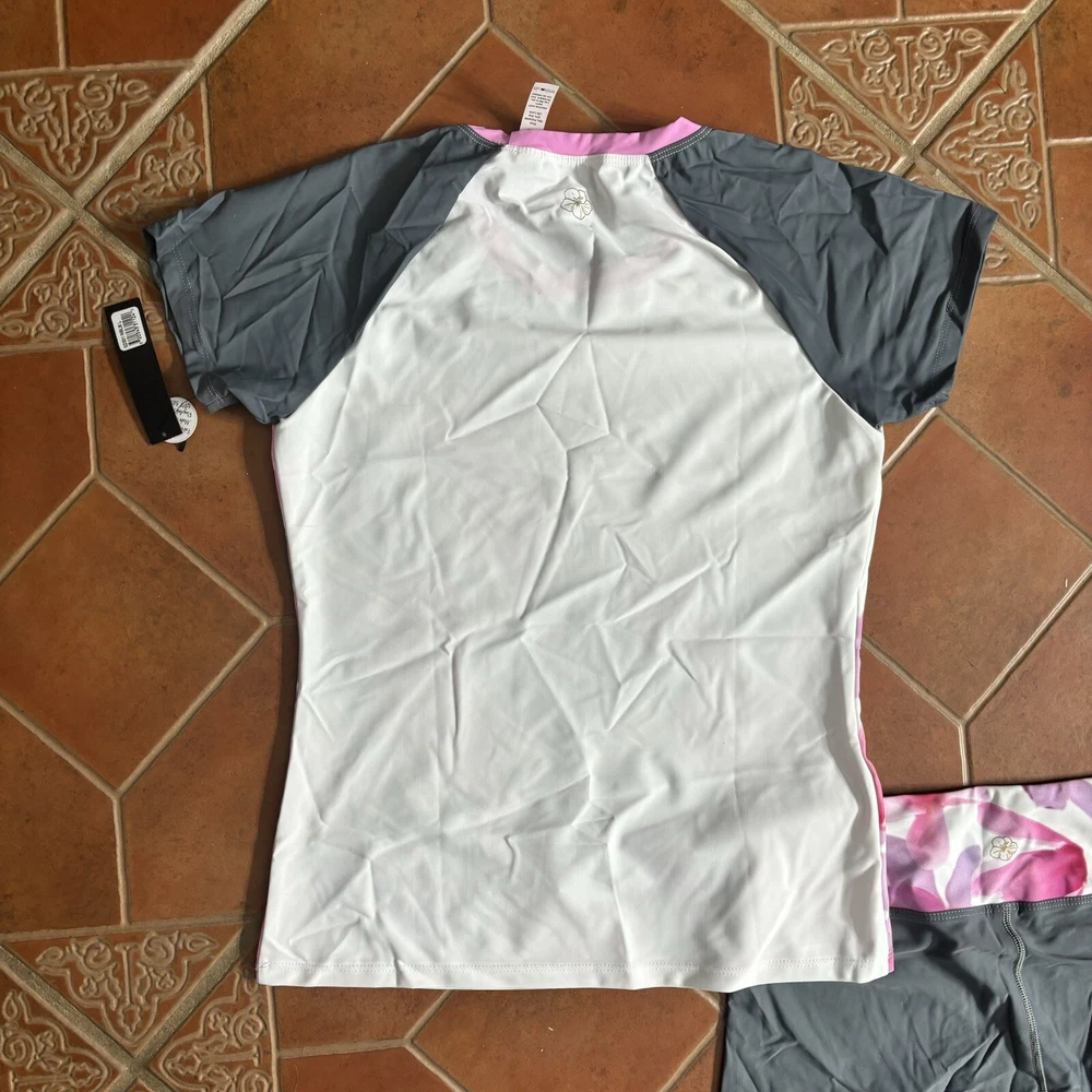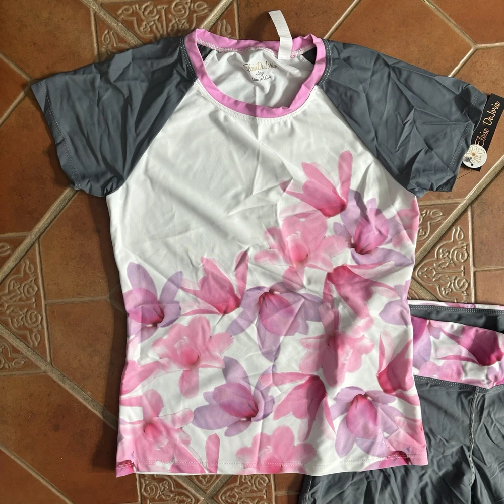 Eloise DeJoria Grey Pink Floral Leggings and Top 2 Piece Workout Set Women Size L Brand new with hanging tags intact. No tears/holes or stains. Brand label says fits a women’s size large. Includes grey capri leggings with white and pink floral banding, and white short sleeve workout top with pink floral around the base, pink trim, and grey sleeves. I have other Eloise DeJoria athletic wear in this size, check my page for other options and reach out to bundle. Grey & Pink Floral set #2