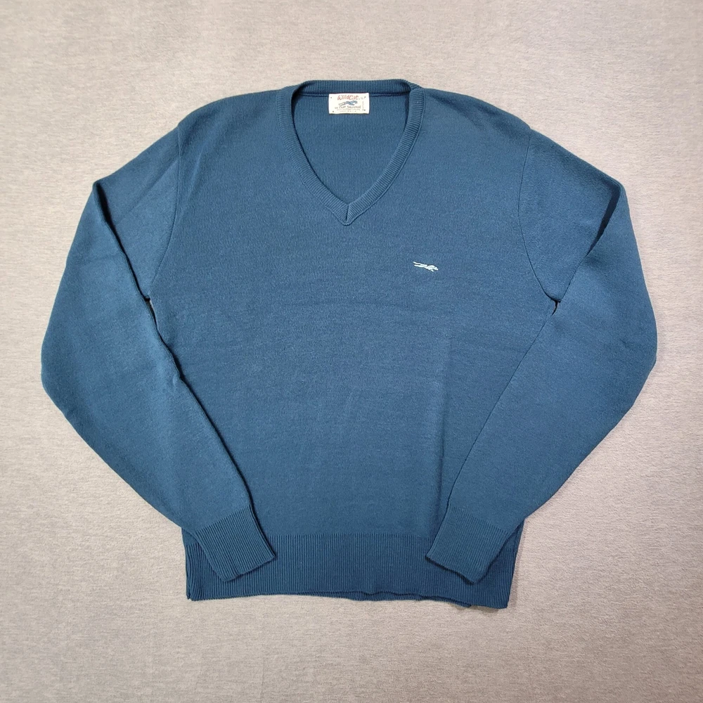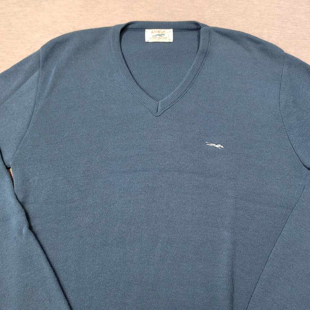 This vintage Wild Cat sweater is a must-have for any fashion-savvy man. Made in the USA, this pullover features a classic fit with a V-neckline and long sleeves. The blue color and solid pattern make it a versatile addition to any wardrobe. Crafted from high-quality cotton knit fabric, this sweater is both comfortable and durable. The Wild Cat logo accents the design, adding a touch of style and sophistication. Perfect for any occasion, this sweater is a timeless piece that will never go out of fashion.