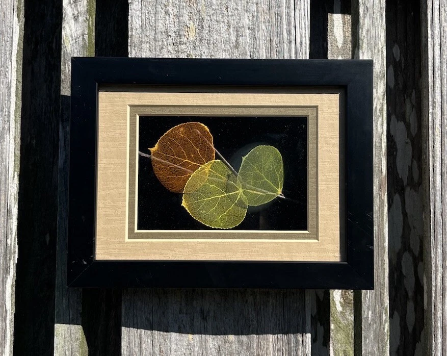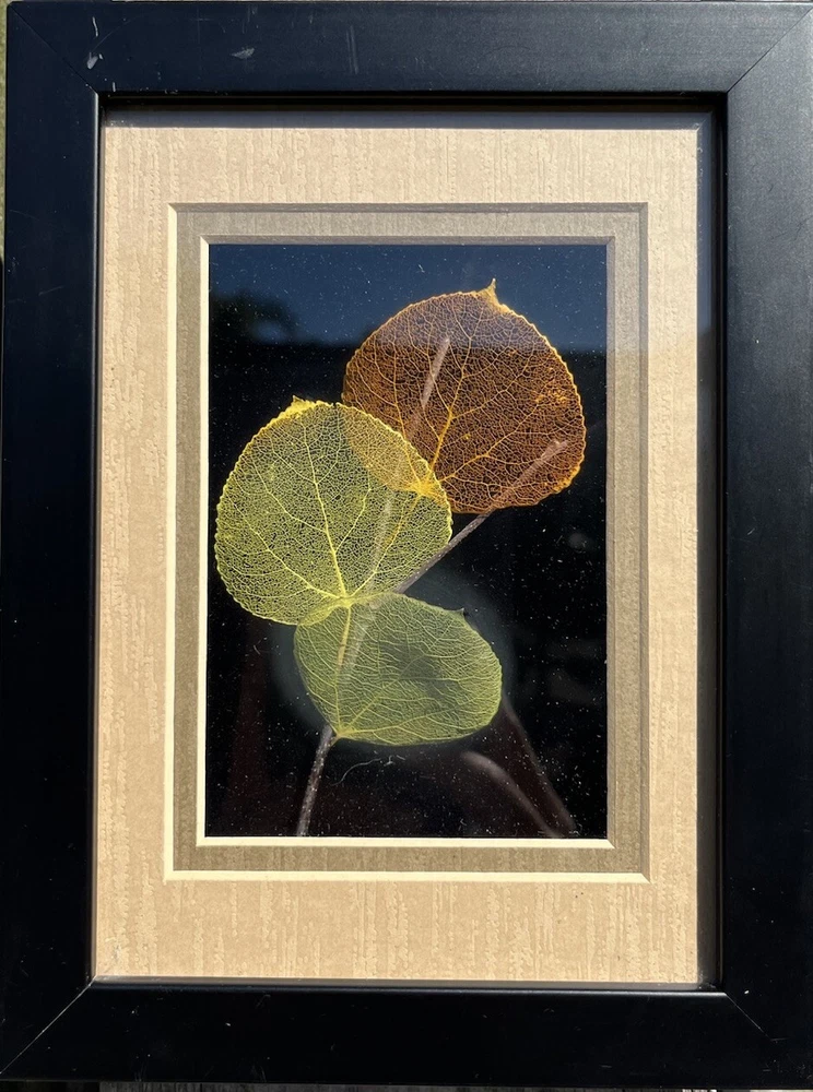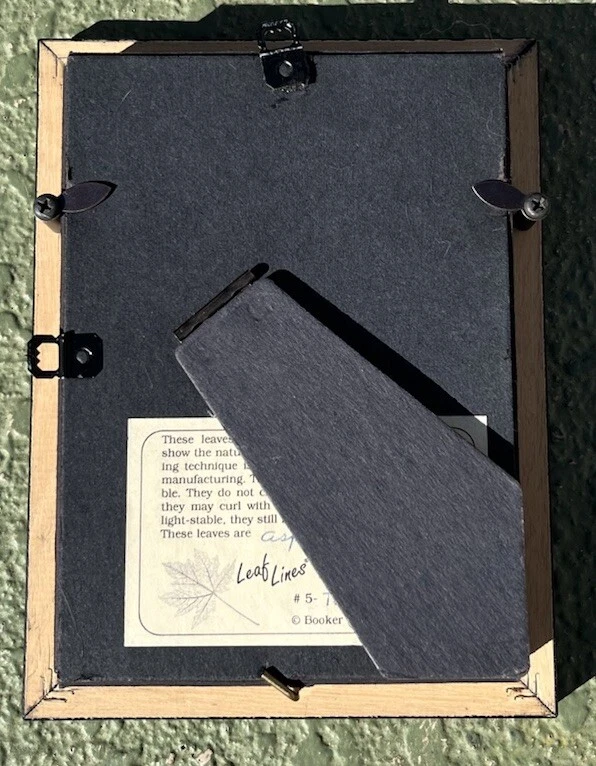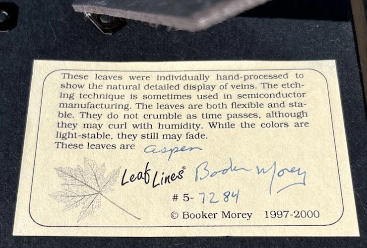This is an original hand-etched Leaf Line Shadow Box created by artist Booker Morey in 1997. The small glass artwork features a nature theme with leaves in a 3D collage style, framed and signed by the artist. It measures 6 inches in length, 8 inches in height, and 1 inch in width. The piece is one of a kind and includes a Certificate of Authenticity. Made in California, USA, using mixed media techniques.