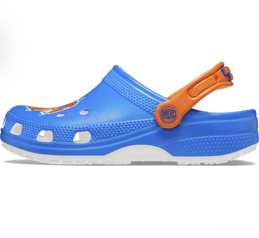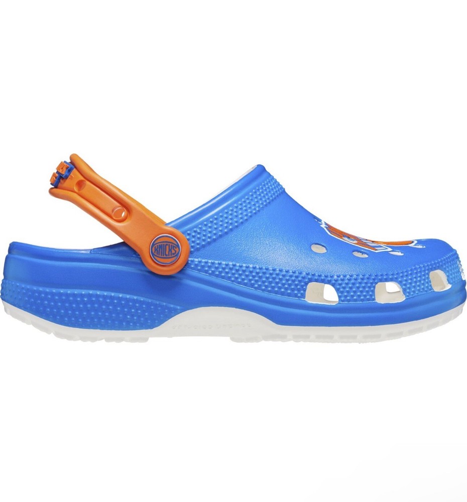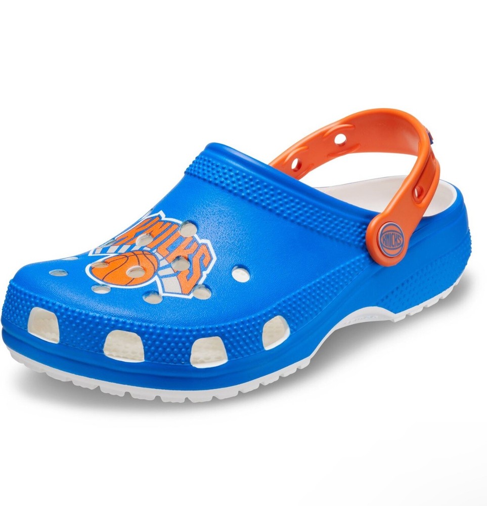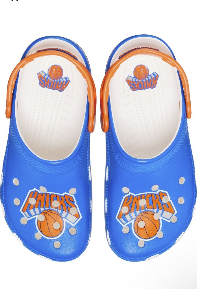 Elevate your casual shoe game with these Crocs NBA New York Knicks Classic Clogs. These slip-on clogs feature a round toe shape, synthetic upper material, and rubber lining material. The outsole is also made of rubber, providing comfort and durability for everyday wear. Perfect for summer, fall, and spring, these multicolor clogs are adorned with the New York Knicks logo, making them a must-have for any fan. With a breathable design, these Crocs are ideal for casual occasions. Get your pair now and step up your shoe game! **Retail $60**