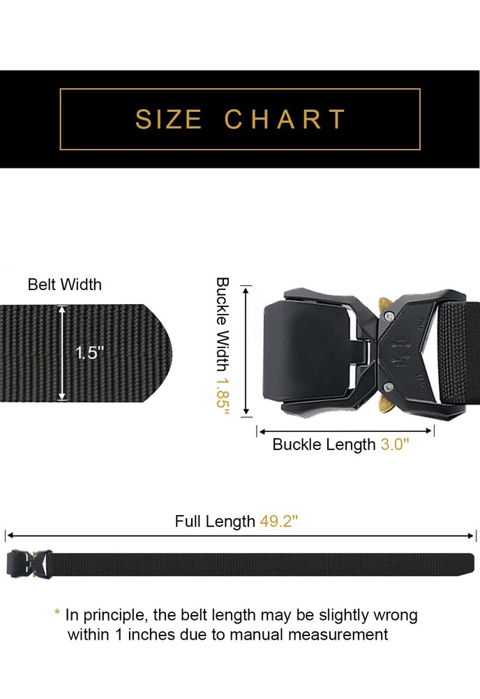 DURABLE COMBAT-READY CONSTRUCTION-Made With Heavy Duty IndustrialNylonMore than that, it is very sturdy, which make your waist be more comfortable as well as stay tight, when you take large range of activities. UNIQUE DESIGN-If you are looking for a belt that reflects your outstanding personality,This belt touts the high-quality metal quick release belt,The crafted heavy-duty buckle, made of zinc alloy, has very strong load-bearing capacity, which can meet your different wearing requirements. FIT EVERYWHERE-It is widely used for outdoor activities, such as camping, hiking, cycling, fishing, mountain climbing, travel, field training, etc. The automatic belt design is elegant, suitable for jeans, casual pants, suit pants,Perfect mens casual belt that will soon become your favorite go to everyday leather belt. EASY TO USE-Slide the belt into the sliding, pull the leather belt through, then click-itsimply automatically locks. To release the casual belt, gently push the lever on the side of the automatic buckle, then the lock snaps shut. Simple! RISK FREE ORDERS-We are committed to making our customers satisfied. If there is any problem with the product, contact us without hesitation.