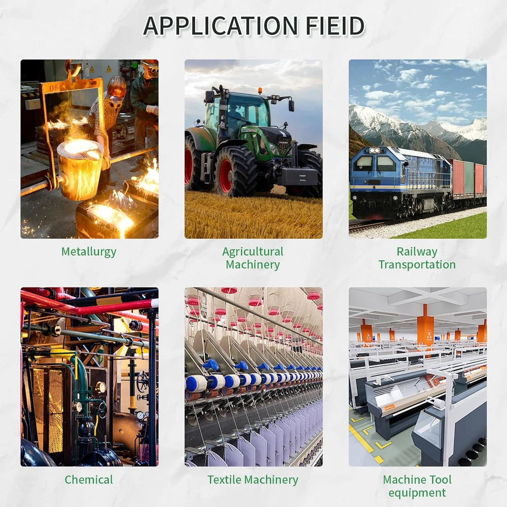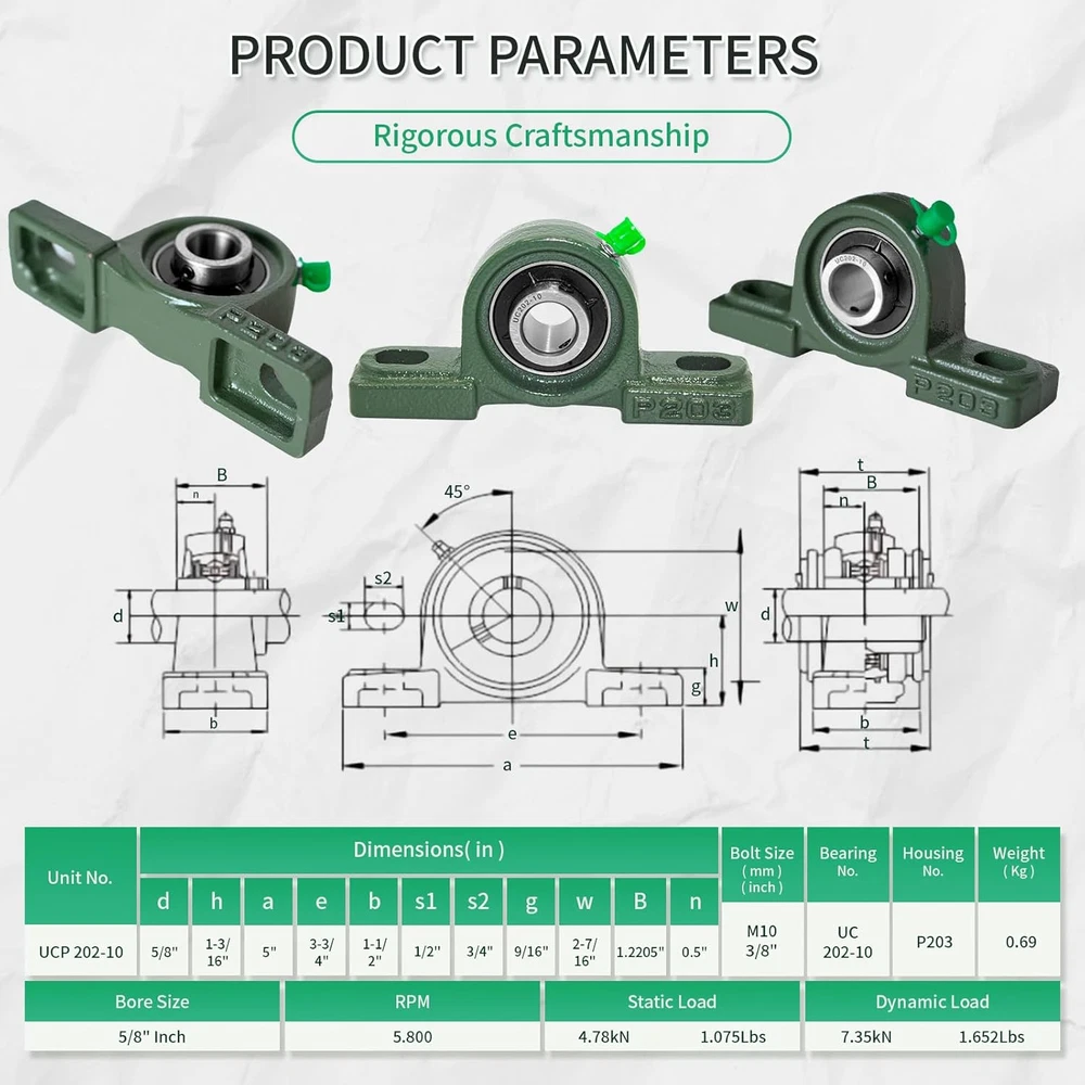 Robust Design: The UCP pillow block bearing series features a secure two-bolt mounting with set screw locking, ensuring stability and reliability. Durable Construction: Crafted with a solid base, Grewirifc pillow blocks eliminate cavities, enhancing bearing strength, preventing material build-up, and simplifying maintenance. Self-Aligning Performance: Wide inner ring ball bearings with self-aligning spherical outside diameters compensate for shaft misalignment, ensuring optimal functionality. Ready-to-Use and Maintain: Pre-lubricated for immediate installation, these pillow block bearings come with a supplied grease fitting for easy re-lubrication, reducing maintenance efforts. High-Quality Material: Made to last, the pillow block bearings consist of chrome steel (AISI 52100) ball bearings, providing exceptional resistance to wear and tear for long-lasting performance. Product Description At Grewirifc, a leading provider of high-quality bearings, including our UCP, UCF, and UCFL series pillow block bearing, designed to meet the demanding needs of various industries with reliable support for rotating shafts. Grewirifc's UCP202-10 Pillow Block Bearings Features Premium Quality Material: Constructed with high-strength cast iron housing for exceptional durability and stability in demanding industrial environments. Precision Engineering: Engineered with precision to ensure smooth and efficient operation, minimizing friction and vibration for optimal performance. 5/8 Inch Bore Diameter: Designed to accommodate 5/8 inch diameter shafts, offering compatibility with a wide range of machinery and equipment. Easy Installation: Equipped with pre-drilled mounting holes and set screw locking mechanism for quick and hassle-free installation, ensuring secure attachment to shafts. Versatile Applications: Ideal for various industrial applications including conveyor systems, agricultural machinery, material handling equipment, and more, providing reliable support for rotating shafts. Grease Fitting for Lubrication: Includes a grease fitting for convenient re-lubrication, extending the bearing's service life and reducing maintenance requirements. Designed for easy disassembly without the need for specialized tools, allowing for quick maintenance and replacement of components. Utilizes modular design principles, enabling individual components to be easily removed and replaced without requiring disassembly of the entire unit. UCP202-10 Pillow Block Bearings - 5/8 Inch Bore Diameter Solid Cast Iron Housing Item UCP202-10 Pillow Block Bearings Bearing Type Pillow Block Bearing Model UCP202-10 Material High-strength cast iron Bore Diameter 5/8 inch Shaft Size Compatibility 5/8 inch Housing Type Solid Bearing Insert Material Chrome steel Mounting Type Two-bolt mounting with pre-drilled holes Seal Type Contact seal The UCP202-10 Pillow Block Bearings have a wide range of applications across various industries due to their versatility and reliability The UCP202-10 Pillow Block Bearings find applications in industrial machinery, agricultural equipment, material handling, HVAC systems, mining, construction, food processing, automotive components, pumps, and compressors, providing reliable support for rotating shafts across diverse industries.