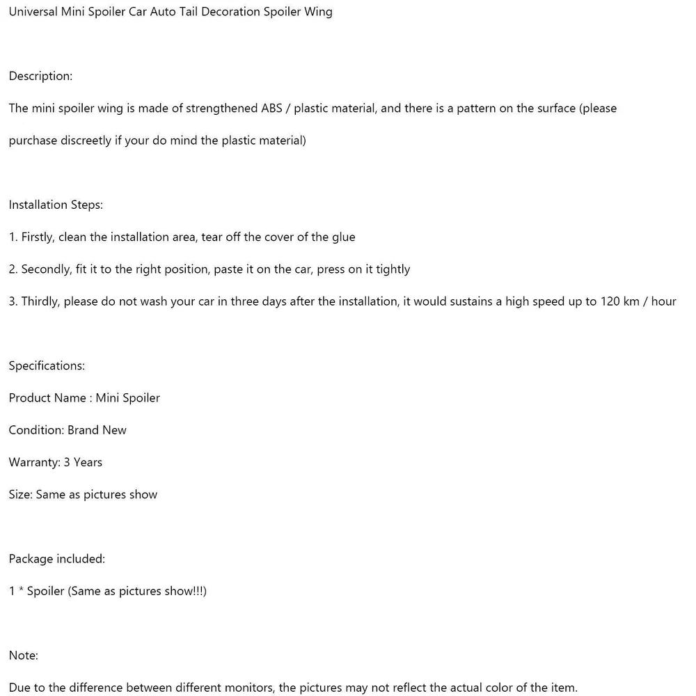 Cramkshaft Timing Pully Gear For Toyota Tundra Tacoma 4Runner 3.4 V6 SA U4 30.65 USD Free shipping Clutch Slave Cylinder for Nissan Patrol GU Y61 2000-12 4cyl 3.0L ZD30 Diesel U4 33.64 USD Free shipping MMI Multimedia Menu Button Switch Knob Cover For Audi A6 C6 A8 D3 Q7 4F0919069U4 11.66 USD Free shipping PDC Ultrasonic Parking Sensor For Alfa Romeo 147 156 159 166 Brera Spider d U4 10.66 USD Free shipping 1pc Fits OSRAM H8 12V 35W 3200K Halogen Original Headlight Lamp Bulbs U4 13.64 USD Free shipping Fuel Door Release Repair Kit Fits Honda Civic 2001-2005 White Brand U1 U4 7.99 USD Free shipping SAFE & SECURE SHOPPING 100% SATISFACTION GUARANTEED FAST SHIPPING Store Categories Store Categories Other eBay Motors Grille You may also like Smoked LED Blinker Side Indicator Turn Signal for Jeep Renegade BU 2014-2021 20.79 USD Free shipping LED Sequential Blinker Side Indicator Turn Signal fit BMW E90 E92 E60 E87 E82 16.79 USD Free shipping Ignition Distributor Timing SPOUT Connector for Ford Mustang F150 E53Z-14489-C 13.79 USD Free shipping Clear LED Sequential Side Mirror Turn Signal Light for Mercedes-Benz SLK 34.79 USD Free shipping Smoked LED Sequential Side Mirror Turn Signal Light for Peugeot Citroen 30.79 USD Free shipping Smoked LED Sequential Side Mirror Turn Signal Light for Mercedes-Benz SLK 34.79 USD Free shipping Universal Mini Spoiler Car Auto Tail Decoration Spoiler Wing Carbon Fiber YI U4 Product Description Universal Mini Spoiler Car Auto Tail Decoration Spoiler Wing Description: The mini spoiler wing is made of strengthened ABS / plastic material, and there is a pattern on the surface (please purchase discreetly if your do mind the plastic material) Installation Steps: 1. Firstly, clean the installation area, tear off the cover of the glue 2. Secondly, fit it to the right position, paste it on the car, press on it tightly 3. Thirdly, please do not wash your car in three days after the installation, it would sustains a high speed up to 120 km / hour Specifications: Product Name : Mini Spoiler Condition: Brand New Warranty: 3 Years Size: Same as pictures show Package included: 1 * Spoiler (Same as pictures show!!!) Note: Due to the difference between different monitors, the pictures may not reflect the actual color of the item. About Us Shipping Terms Contact Us About Us Bruce & Shark is a company Focus on Motorcycle parts more than 11 years. The design inspiration comes from the awe of the vast sea and worship of the fighting sharks, therefore Bruce & Shark takes a shark as brand logo. Since its inception, we have always put the "customer first" and "top quality" as our principle. We specialized in selling Motorcycle parts and providing customers with various types of high-quality products. Our brand Bruce & Shark has enjoyed good reputation in America, Europe, Japan, Canada and Africa, covering more than 30 countries. Our vision is to deliver high-quality Motorcycle parts products and sincere services to the world. Our main products are motorcycle mounted, fuel pump, stator, windshield, Seat Cover, motorcycle fairing. Welcome to our shop to choose products that are worth more for your Motorcycle! Please Add me to your list of favorite sellers and visit often. Thank you for your business. Shipping Shipping Terms International Buyers – Please Note: 1. Import duties, taxes and charges are not included in the item price or shipping charges. These charges are the buyer’s responsibility. 2. Please check with your country’s customs office to determine what these additional costs will be prior to bidding/buying. 3.Buyers' Information: We strive our best to provide you the most reliable, affordable way of shipping service. But sometimes international delivery is highly depended on the courier company and local customs/duties. If you do not receive your item on time, please sent us ebay message immediately for further assistance. Thank you for your understanding. Terms We stand behind everything that we sell and will do everything possible to assure you are satisfied. When you receive your purchase if you are not 100% satisfied, please sent me ebay message and we will do our best to make you happy. If you still want to return your purchase, simply ship the item(s) back to us and we will refund your original purchase price and the original shipping charge. Buyers are responsible for the postal cost of returning the items. We must be notified of the intent to return your item within 30 days of receiving the item. Items returned must be in the same condition that they were received. How to return 1,Please ask us for return address . 2,Shipping back the package . The RMA#(Return Merchant Authorization Number = Your ebay ID) must be clearly written on the return package ,Otherwise the package will be refused. 3,Sent us the return tracking number. 4,All returns will be inspected prior to a credit being issued. Contact Us Sent ebay message in English If you have any questions, our Customer Service staffs welcome you to sent me ebay message. We strive to answer all questions and resolve any problems as quickly as possible. Business Hours: HongKong Time GMT+8:00 Monday-Saturday 9:00-17:00 Copyright © 2022 Tongtool