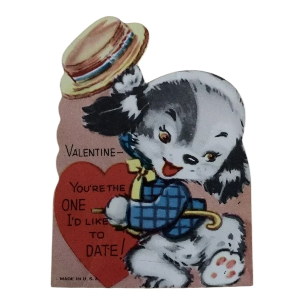 Vintage Valentine’s Day Card - Cute Puppy with Hat & Heart - “You’re The One I’d Like to Date!” Condition: Pre-owned, excellent vintage condition Description: This adorable vintage Valentine’s Day card features a cheerful puppy tipping its hat while holding a red heart that reads, “Valentine - You’re the one I’d like to date!” The die-cut design, bright colors, and charming mid-century style make this card a wonderful collectible or a sweet gift for a loved one. Features: • Vintage die-cut Valentine’s Day card • Features a cute puppy illustration with a heart • Mid-century style with vibrant colors • Printed in the USA • Great for collectors or as a nostalgic keepsake Shipping & Returns: • FREE shipping! (Ships securely with tracking) • FREE returns! Buy with confidence. Don’t miss out on this delightful vintage Valentine’s card! Add it to your collection today!