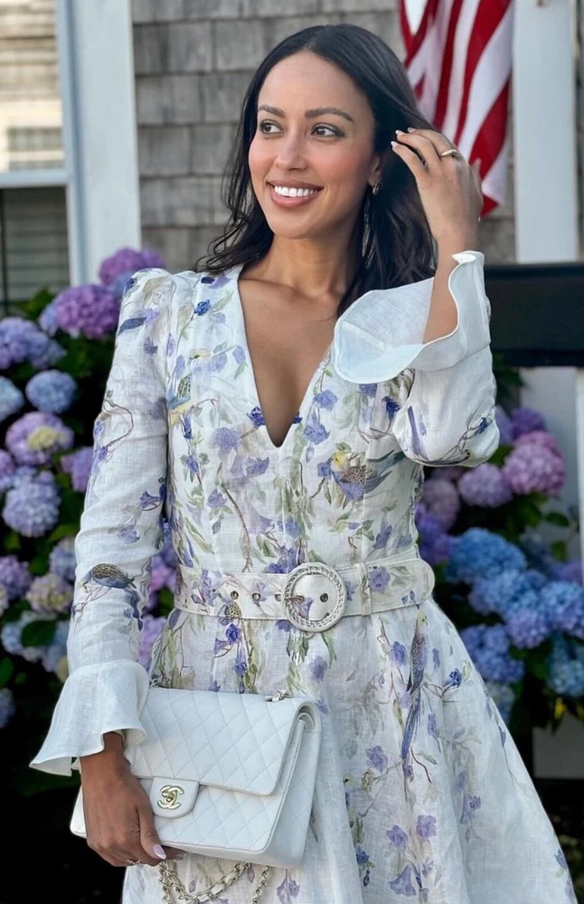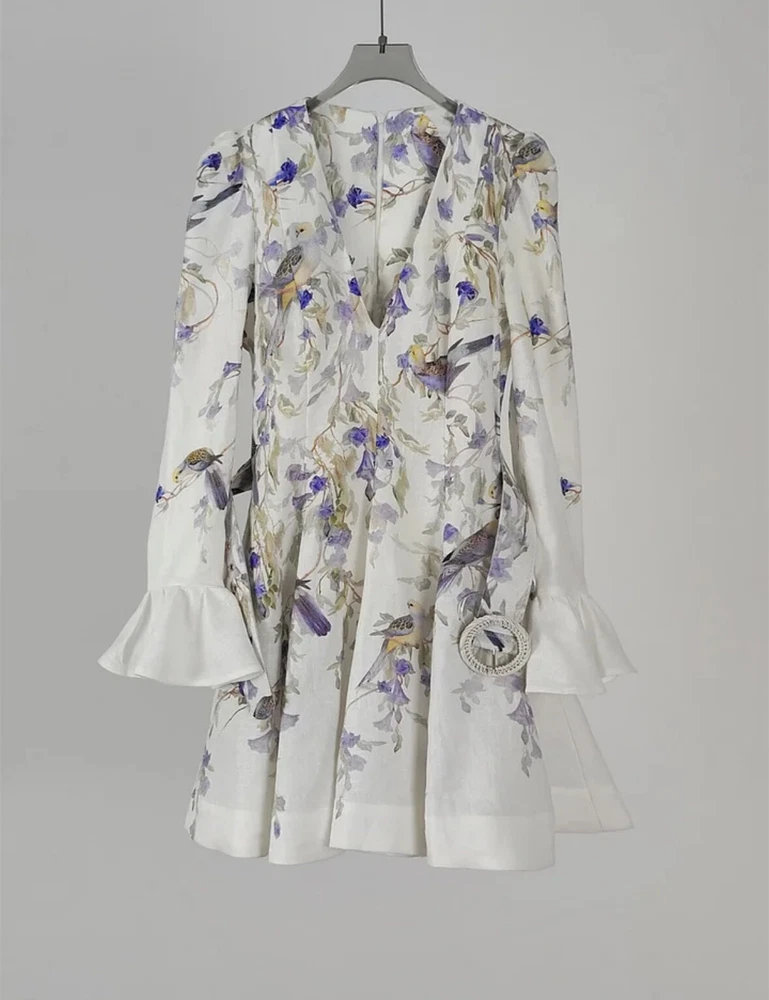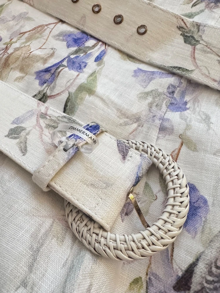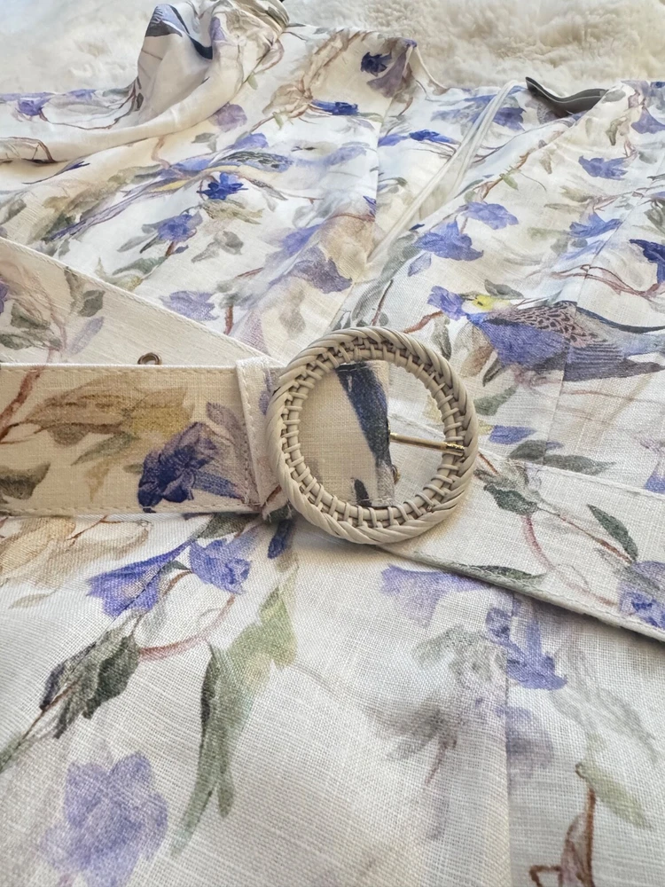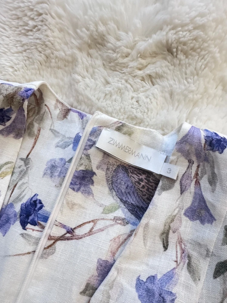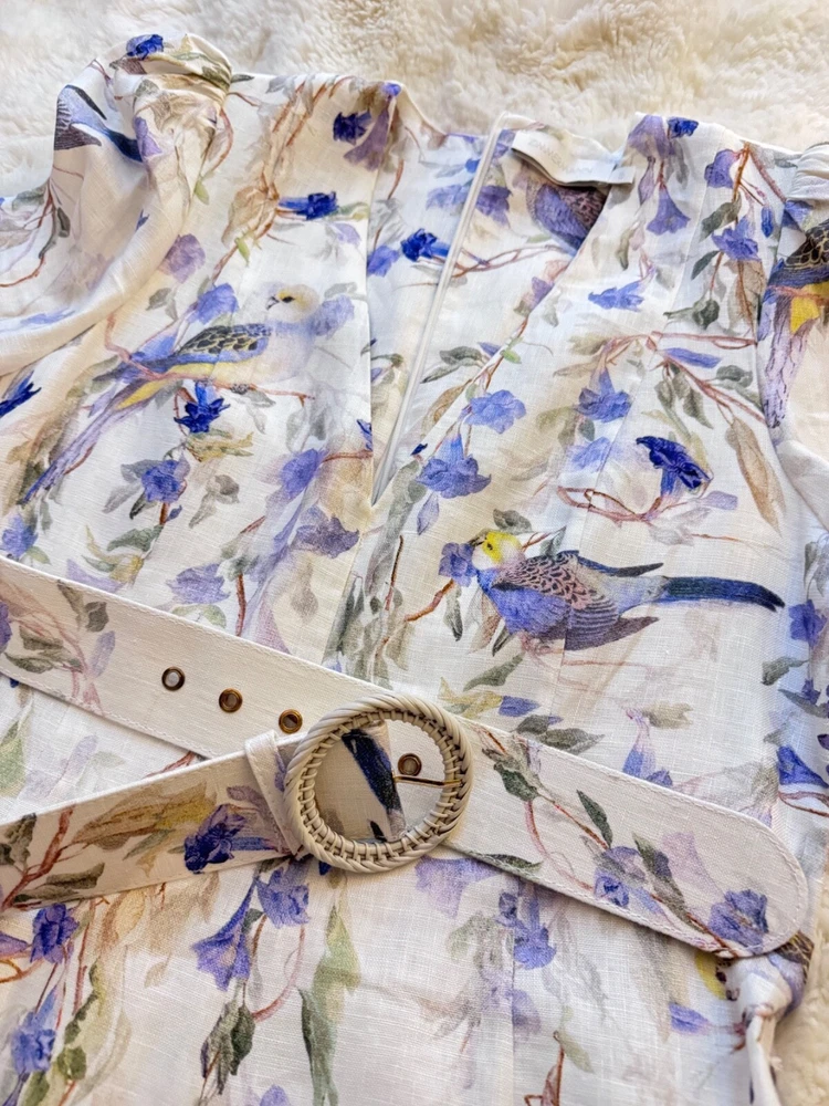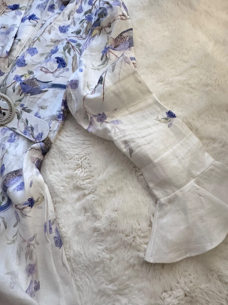 Elevate your wardrobe with the Zimmerman dress in size XL, a versatile piece that transcends occasions from a casual day out to a formal gathering. Featuring a charming floral pattern set against a crisp white backdrop, this mini dress is perfect for creating a springtime vibe, but its timeless design allows for year-round wear. The balloon sleeves and delicate ruffle accents add a touch of elegance, while the V-neckline and belted waist cinch the dress for a flattering silhouette. Crafted from high-quality linen and canvas fabric, this dress promises comfort and durability. It's a designer dress that doesn't compromise on practicality, equipped with a convenient zip closure and suitable for travel. Whether you're attending a cocktail party or enjoying a winter wedding, this dress is an enchanting choice that will carry you through in style.