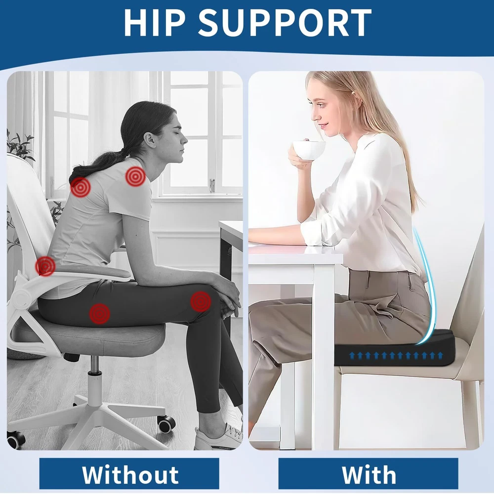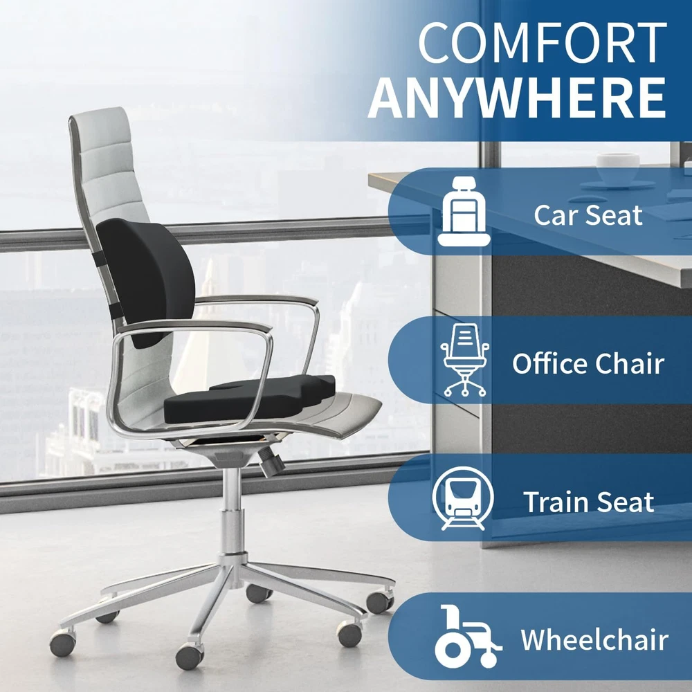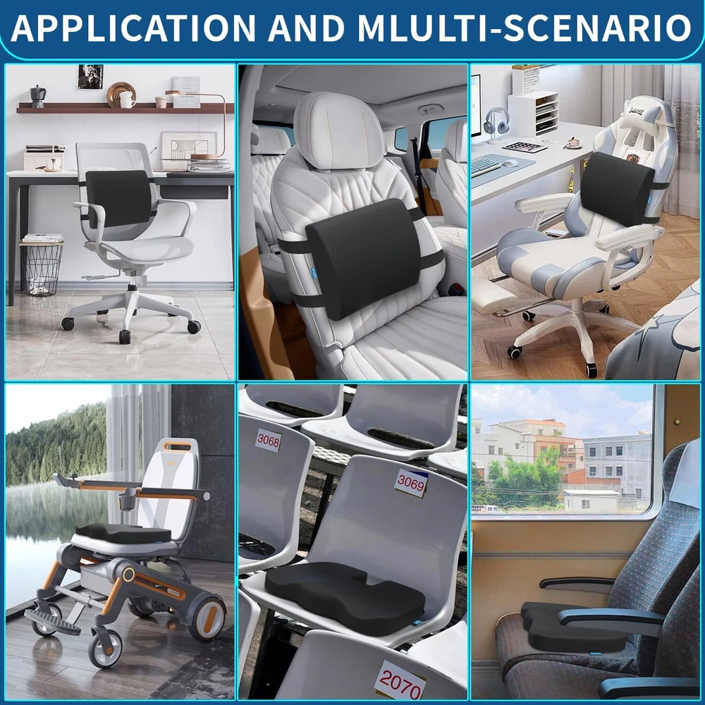 [NEVER GO FLAT & VENTILATED] car seat cushion and back pillow are made of the latest technology slow-rebound memory foam that can sense the memory curve of the human body, reduce pressure on the coccyx tailbone, promotes right posture. Creatively Seat cushions back hollow perforated, provides great air circulation and allows you to sit without feeling hot or sweaty, breathable and supportive. It can save money and solve the chair problems instead of changing chairs on home or office. [OFFICE CHAIR CUSHION FOR TAILBONE PAIN] The coccyx seat cushion is U-Shaped ergonomic designed and recommended by orthopedic surgeons for treatment of chronic or acute pain by alleviating pressure in strategic areas: Relieving Sciatica, Arthritis, Low Back, Hip, Spine, post surgery injury or pregnancy pain relief. Can be used to improve bad posture and relieve leg pain while driving or sitting for long periods. Perfect alternative to donut and hemorrhoid pillows. IDEAL FOR ADULTS 150 - 270 lbs. [LUMBAR SUPPORT PILLOW FOR BACK PAIN] The back cushion for desk chair repeats the anatomical contours of your spine, supports your lumbar area, improves blood flow and relieves pressure on your back. Our back support cushions can be placed anywhere along the back of a car seat or office chair for neck, upper, middle, thoracic, lower back and spine pain relief. The lumbar support is one of the essential work from home accessories relieving pain points while working from home for long hours. [WORKS FOR ANY CHAIRS] The chair pad features a non-slip, rubber bottom to ensure it stay firmly positioned in a seat. Two Adjustable Straps keep the back support cushion in place. Moreover, it can be used to increase the height of any seat. So the combo is suitable for office chairs, office workers with computer chairs, gaming chairs, car seats, wheelchairs, recliners, any home chair, or a seat on a bus, airplane, or train. [COMFORTABLE & BREATHABLE WASHABLE COVER] Black cushion cover is machine washable. Ideal choice for loved ones.Try it now, don't worry. please let us know if our sitting cushion does not work for any reason. Order orthopedic seat cushion and office chair pillow today!