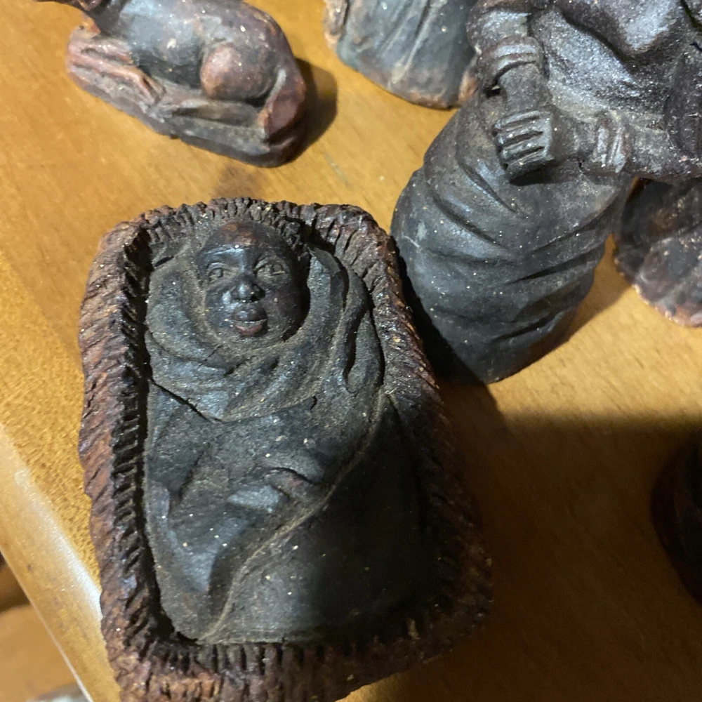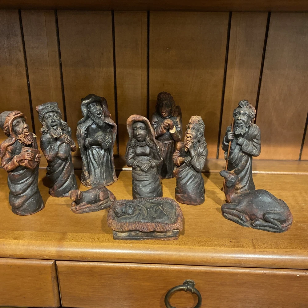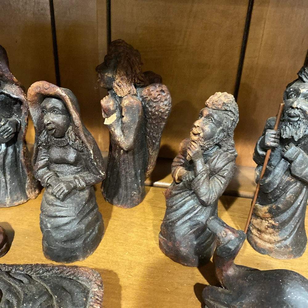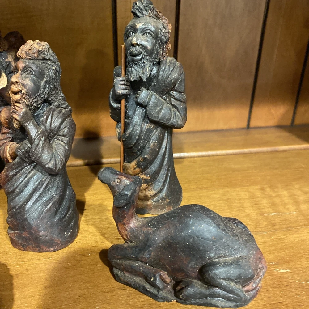Beautiful handmade nativity scene set. I’m not exactly sure of the material ? Possibly clay.? But resembles a little bit like Wood….. Each piece has beautiful details Each piece is about 6-7 inches tall. The set comes with Mary , Joseph, Angel, Wiseman, baby Jesus, a camel, and a lamb.