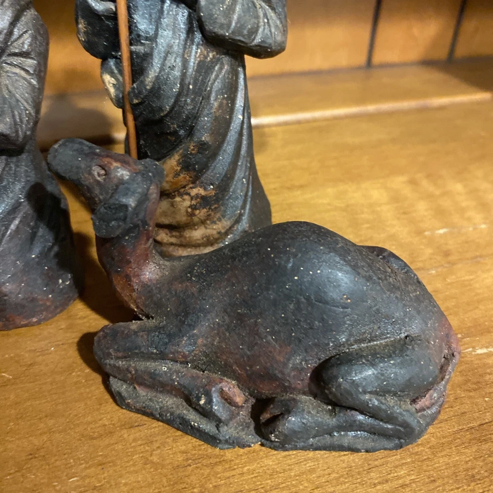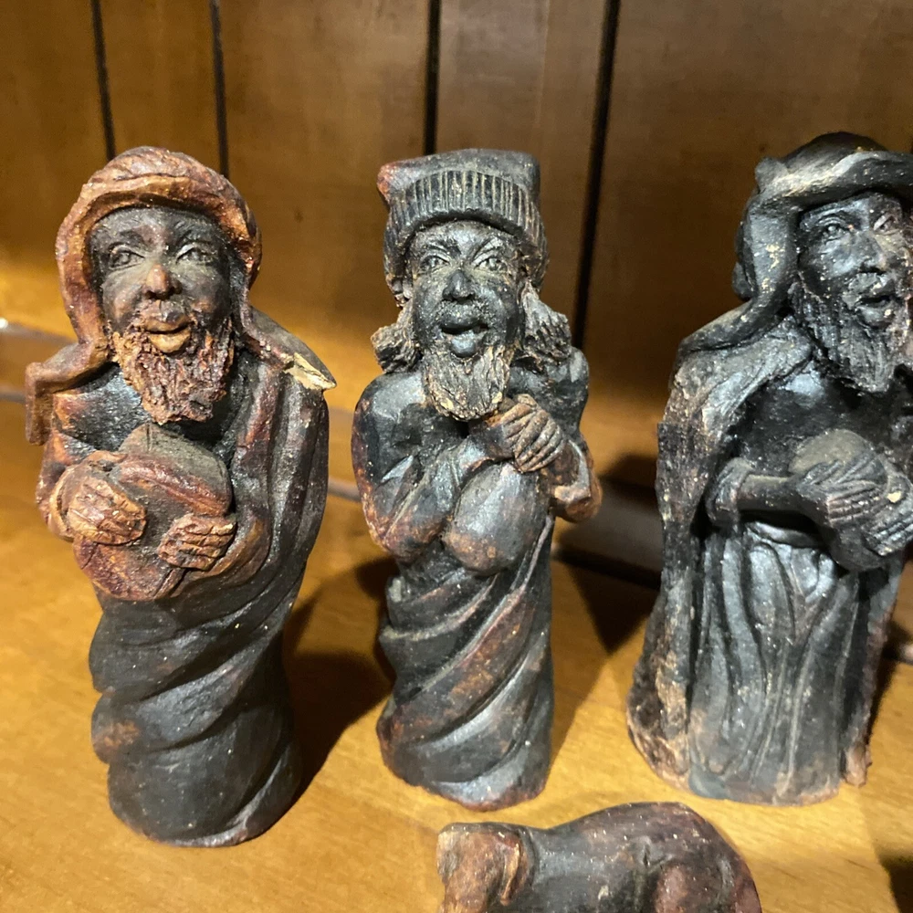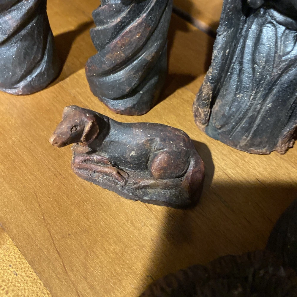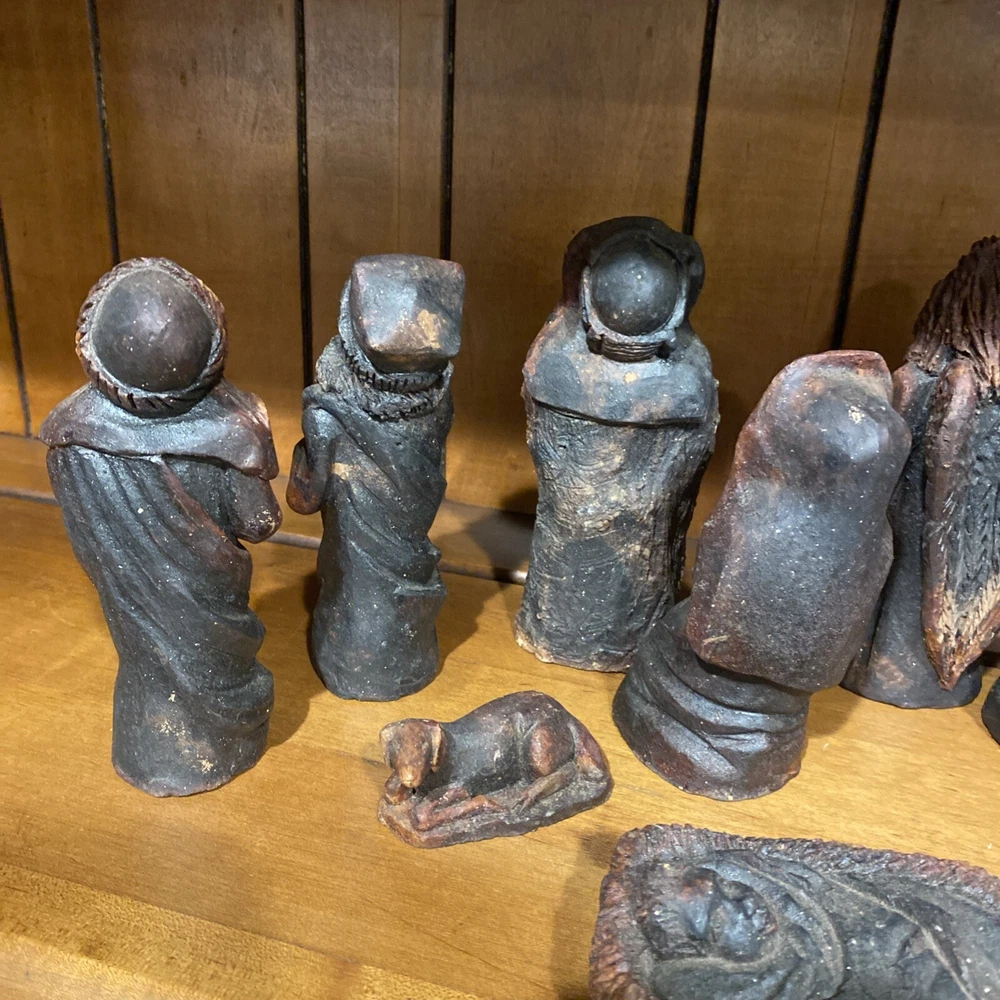 Beautiful handmade nativity scene set. I’m not exactly sure of the material ? Possibly clay.? But resembles a little bit like Wood….. Each piece has beautiful details Each piece is about 6-7 inches tall. The set comes with Mary , Joseph, Angel, Wiseman, baby Jesus, a camel, and a lamb.