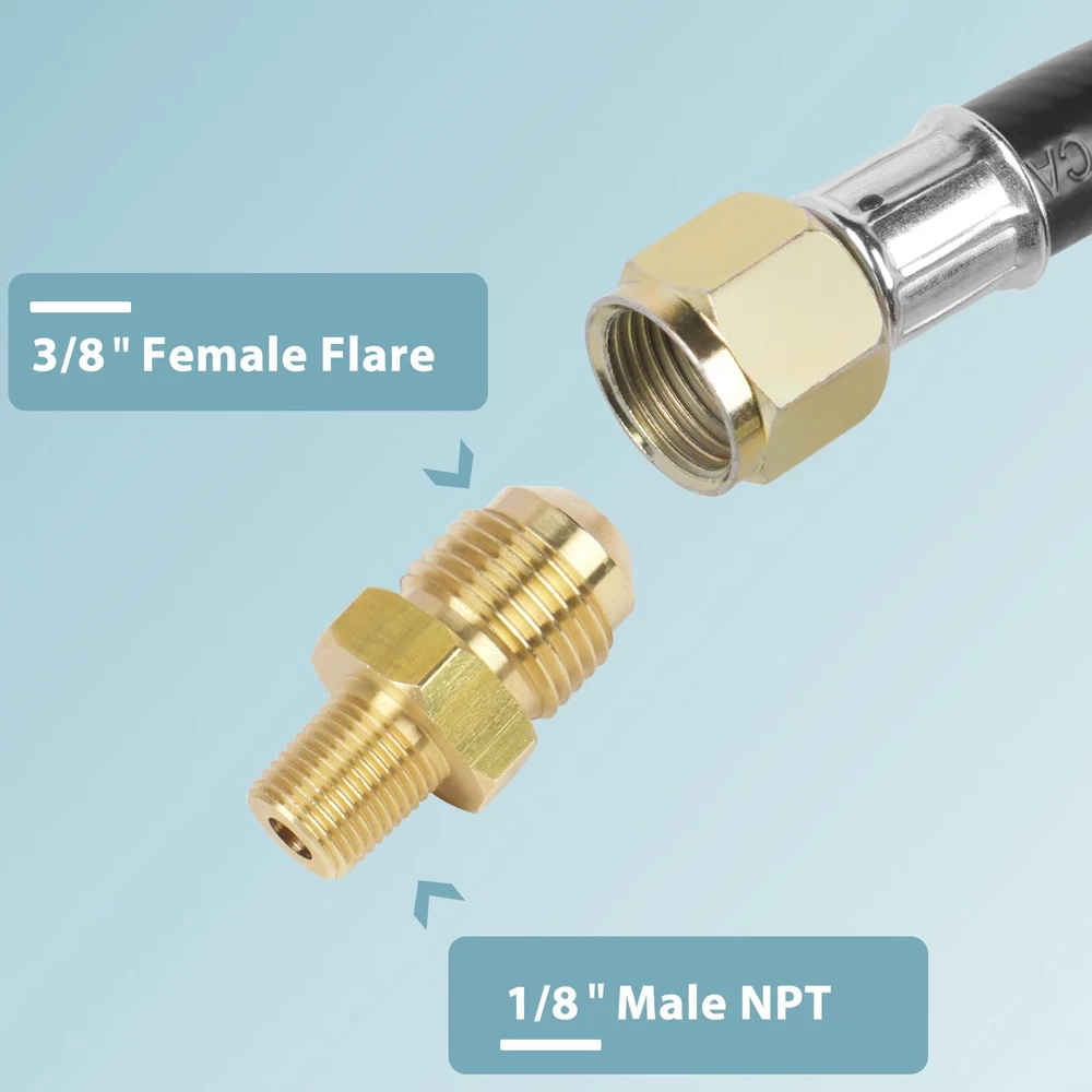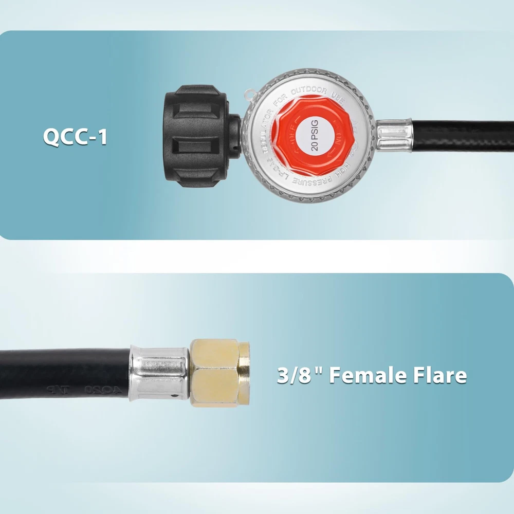 Excellent Flame Control: This high-pressure propane regulator with hose can be adjusted from 0-20 psi with its red knob Orifice Fitting: Comes with extra bonus, a brass orifice connector with 3/8" Flare M x 1/8" MNPT Multipurpose: Fit for paella pans, turkey fryers, Weber and Charbroil grills, fire pit, smokers, hot water heater, forges, burners, fish cooker, heater and more Well Made: Sturdy rubber propane hose and long-lasting brass fittings, providing a sealed tight connection for security Standard Connector: QCC-1 Fitting x 3/8" Female Flare