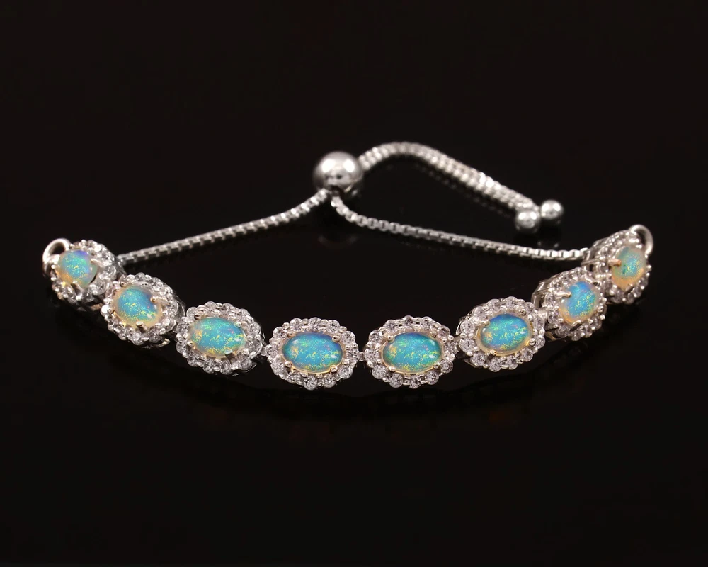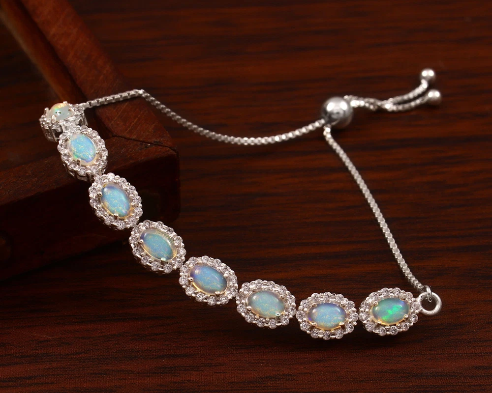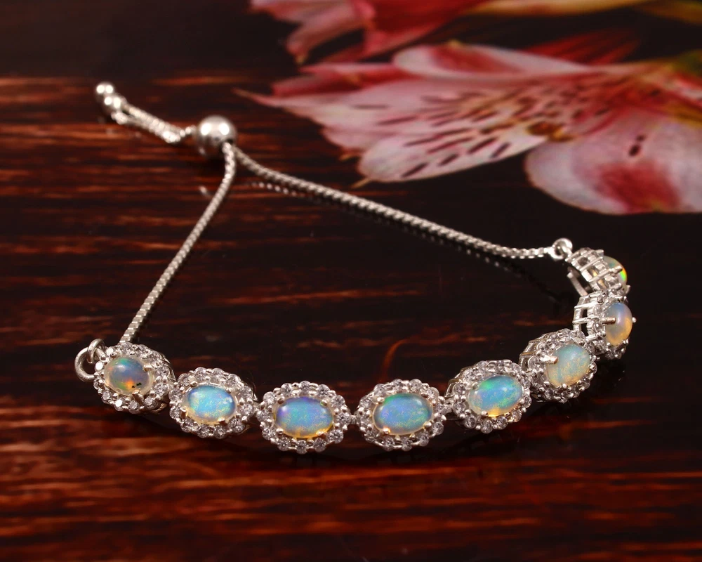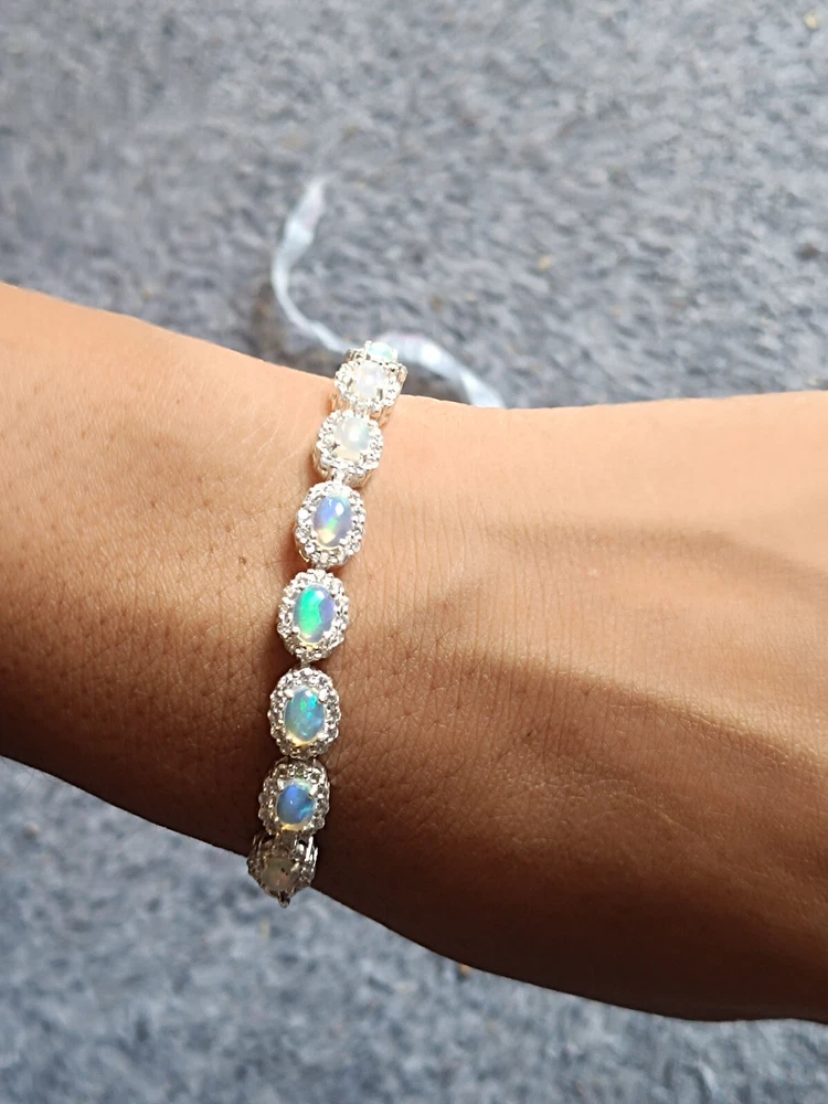 Natural Opal and Moissanite. women's Bolo Tennis Bracelet in Sterling silver, October , birthstone Bracelet, Party wear Bracelet, Finance gift Bracelet, Gemstone Bracelet, Tennis Bracelet. ==================================== PRODUCT DETAILS Product Type - Bracelet Bracelet type - Tennis Bracelet Gemstone setting - Opal Moissanite shape - Round Moissanite . size - 1.5mm Natural Opal and Moissanite color -Rainbow Natural Opal Shape-Pear Natural Opal Size-4mm Natural Opal & Moissanite Color- Rainbow , White Setting type - Prong ==================================== Benefits of Opal stone: Protective Stone Opal will shield you from negativity since it is a protective stone. It will create a barrier between you and others who try to inflict negative energies on you. 4. Improves Financial Situation Venus is associated with luxury and materialistic ambitions in addition to creativity. If Venus is placed in a weak position in your horoscope, you might have trouble managing your money. Opal jewelry has the power to improve your financial situation and social standing. 5. Improves Health Opal aids in treating liver, renal and hormonal diseases when it comes to its healing properties. It is a superb healing stone for treating psychological issues and sleep disturbances. Opal is regarded as a helpful stone for treating vision problems and other eye conditions. Benefits of Moissanite stone: It draws wealth : Venus, the planet that rules opulent lifestyles, is the ruler of moissanite stone. A strong Venus in your horoscope can help you achieve your goals. Wearing it draws a life of luxury and the fulfillment of all ambitions. The moissanite stone is a good investment for married life : Moissanite benefits those who experience marital difficulties or delays to achieve a happy marriage life, and solves issues like relationship, breakups, and frequent disruptions in marriages. Brings Prosperity : Wearing a moissanite is associated with advancement, wealth, and notoriety. It improves one's reputation and social standing in the community. Having quick and easy success is also beneficial. Boost creativity : People are strongly advised to use moissanite stone by Caratbazaar to enhance their imagination and creative thinking. Those who are creatively inclined or not can benefit from it.. =========================== Shipping Policy :---- • Shipping Thru FedEx, DHL Express, USPS & Other Courier Services. • We ship item(s) from India to Worldwide . • We also use USP Which take 4-5 days for delivery with 100 % insured and online tracking . • We provide you each item with individually packed secured with quality products to help ensure safety and undamaged delivery =================================== Regards by RG jewels