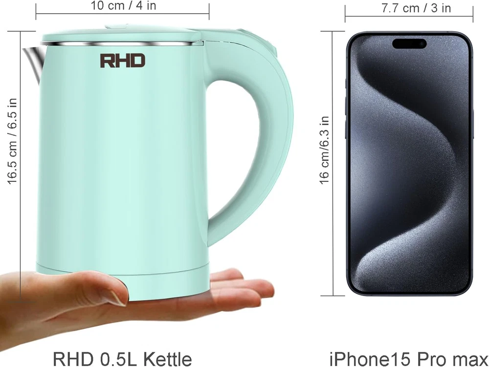 ☑️【Compact and Portable】The small electric kettle with a capacity of 0.5L, makes it easy to carry. It is suit for 2-3 people use. Take up a little space on your desk or countertop, this small electric tea kettle is an ideal appliance for student’s dorms, offices, or small kitchens. ☑️【Fast Boiling & Safety】This mini electric tea kettle with 600 watts, only one touch on/off switch button easy to boiling water fast. Auto shut off and boil dry protection function ensure the safe use. ☑️【Convenient Clean and Storage】Large opening kettle, measure 4 inches (10 cm) diameter, hands can be easily put in to clean. The cord store base both can be removed from cordless kettle for easy storage.WARM TIPS - During use it many times, there maybe produce rusty spots in the bottom of the pot, pls don't worry about it, and it is not product quality problem, just because of the local water, you can use the vinegar to clean it. ☑️【Food Grade 304 Stainless Steel 】The inner surface of all stainless steel has no plastic component in the area of contact with water. Ensure safe and healthy. Insulated outer surface and handle keep cool touch.This stainless steel travel electric kettle makes tea or coffee purest tastes. ☑️【Suitable for All Occasions】This portable water boiler is convenient kitchen appliance on daily life. It can use anywhere, such as the dorm room, home, camping, traveling, office and rented house without kitchen, business trip or the leisure dinner. Product Description WHY CHOOSE THE RHD COMPACT KETTLE? Do you drink safe and healthy hot water while traveling or on business? Our electric kettle interior and all places in contact with water are high quality food grade stainless steel, no plastic in contact with the water, ensure your safety and health. Specially designed 0.5 liter capacity, super compact and portable, will not occupy space, convenient for all your travel. Suitable for business, hotel, office or daily use. Food Grade 304 Stainless Steel Portable Electric Kettle The RHD mini kettle's inner liner is seamless with one-piece molding technology for easy cleaning Precise Thermostat, Mini Kettle Automatically Shuts Off When Boiled RHD small kettle adopts precise temperature controller, with automatic shut-off, overheating automatic stop, anti-dry burning function 0.5L 600W Compact Electric Kettle The 0.5L personal exclusive capacity is designed and features 600W low power technology, allowing it to be used in more situations without being limited! Such as RVs, hotels, hospitals, etc. RHD kettle takes about 7 minutes to boil water Small Electric Kettle That is Easy to Store and Carry Around The base of the RHD Compact Water Boiler is separate from the main body, and the power cord on the base can be hidden storage ENJOY YOUR HOT BEVERAGE ANYTIME, ANYWHERE! Bring a small RHD water heating bottle with you on your trip. Doesn't take up much space, healthy, hygienic! Small Water Heater Best for offices Mini Electric Kettle for RVs Portable Electric Water Boiler for Travel Volts AC voltage; North American stations sell 110V and US plugs; The UK station sells 220V and UK plug; EU station sells 220V and EU plug. Rated Power 600W Rated Frequency 50Hz Product Weight 550G Capacity Add boiling capacity 0.5L