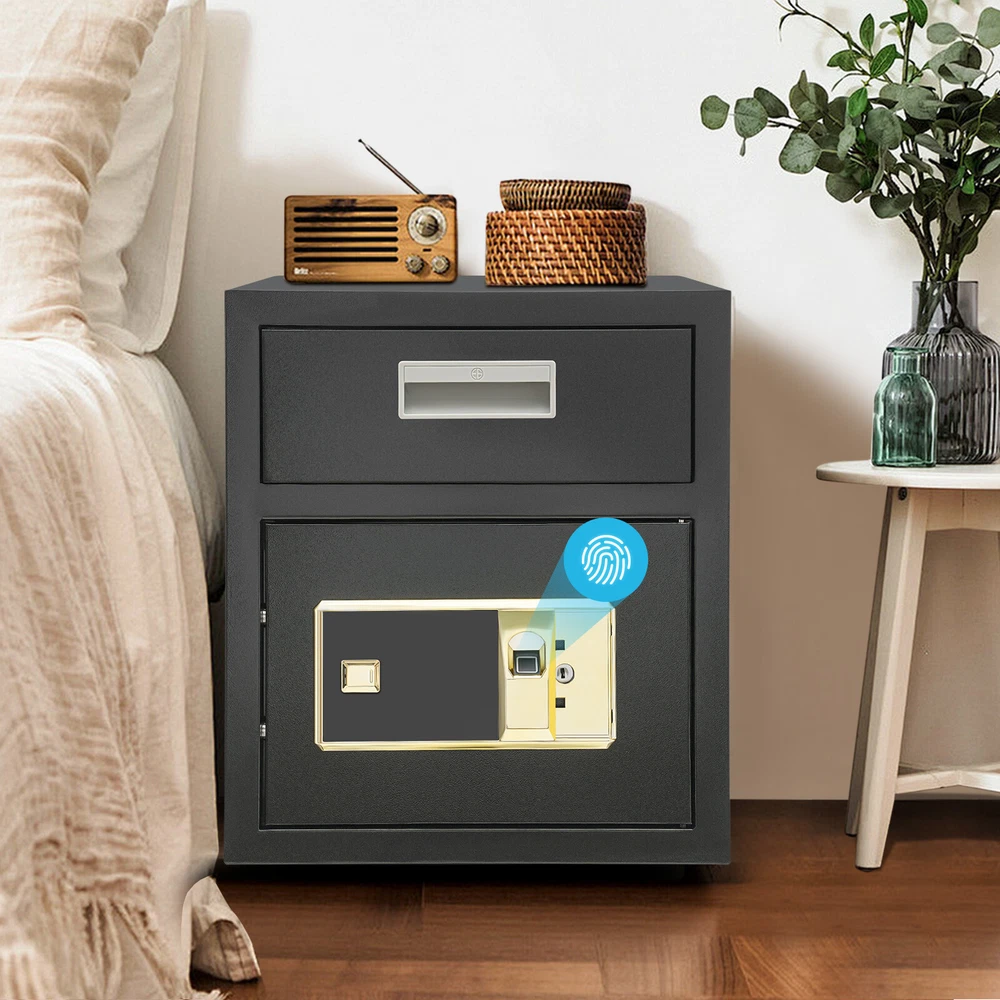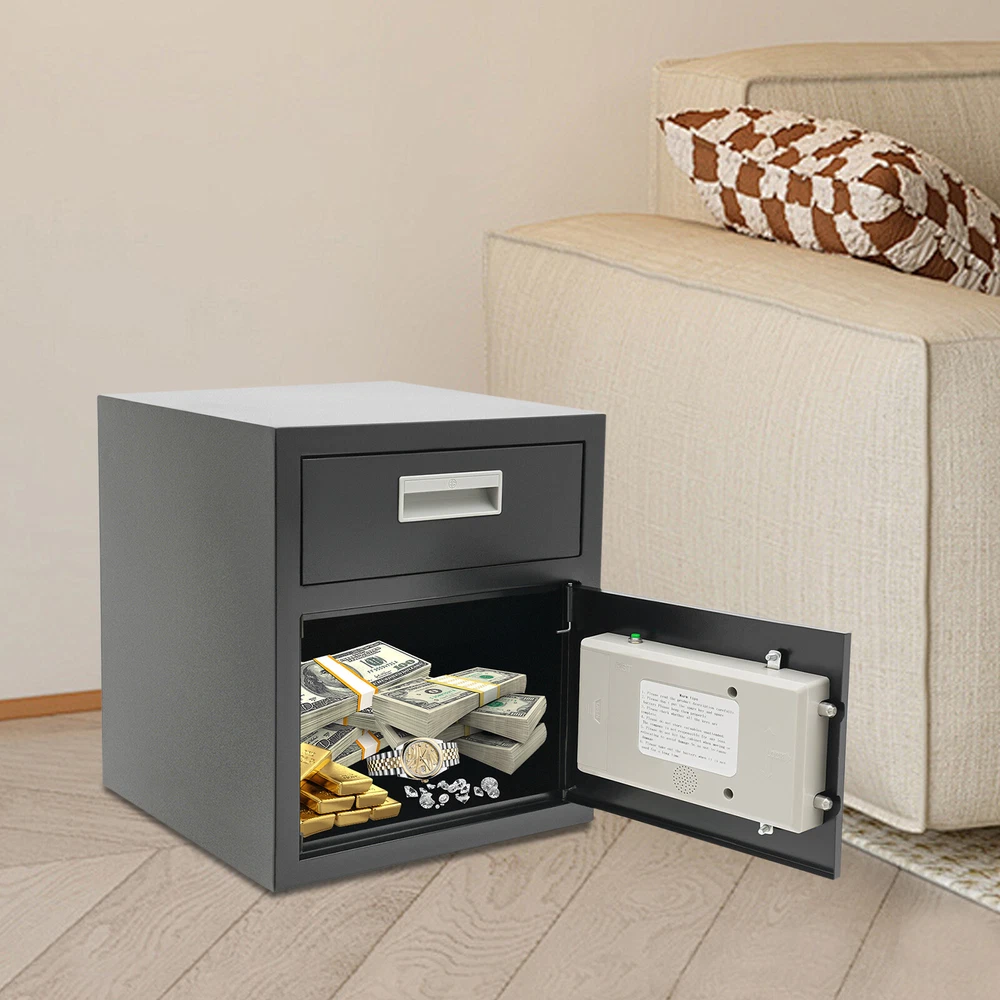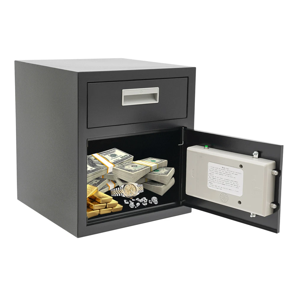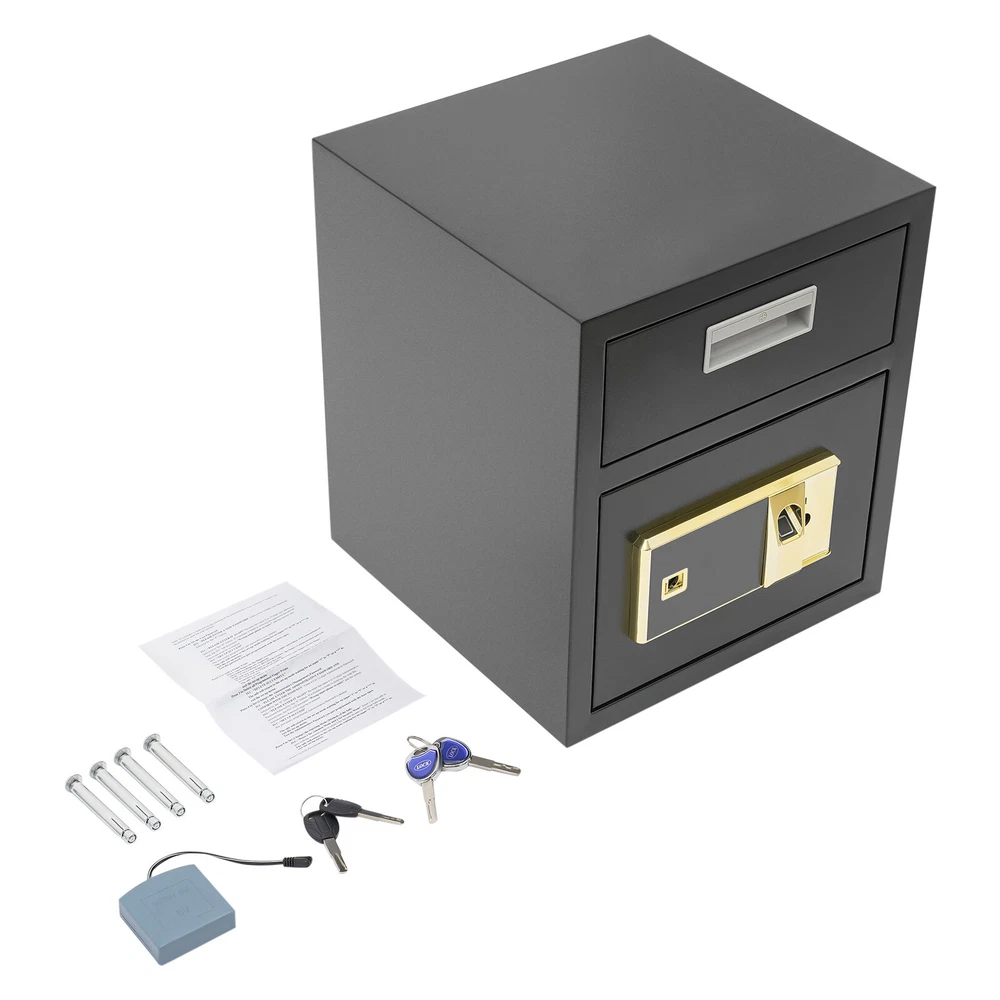 0.64ft³ Drop Box for Money&Mail Drop Slot Safe Cash Depository Safe Black W/Keys Description A high-quality safe can enhance your sense of security even more. This safe is made of sturdy steel and has strong reliability. The sturdy anti-theft lock can protect your valuable property, and the intelligent alarm mechanism allows you to keep an eye on its status at all times. Having this high-quality safe allows you to confidently go out. Key Features Build to Last: It is made of sturdy and thickened steel plates, and adopts laser cutting and galvanizing processes, with the advantages of high strength, rust resistance, and impact resistance, providing you with long-lasting and reliable protection. Large Capacity: The large size of 14*14*15.7 inches provides you with 0.64ft³ of space to help you organize important items and reduce clutter. The wide top can also be used for temporary storage of small items. Powerful Protection: The sturdy lock, 1mm thickened material, three types of unlocking keys((fingerprint, key, password)), and high-quality lock tongues provide your valuables with anti-theft protection. Intelligent Alarm Mechanism: If the password is entered incorrectly three times, an alarm will sound and it will automatically lock for 1 minutes. An alarm will also sound when the battery is low. The intelligent alarm mechanism enhances its security. Convenient to Use: The delivery port with a large opening angle allows you to deliver important items into the safe without opening the door, making it more convenient to use. Easy Installation: Thanks to its pre-drilled mounting holes and screws, you can mount this product on the wall or you can directly place it on the floor for more flexibility and convenience. Nice Appearance: The classic black and smooth lines give the product a sense of modernity and fashion, which can blend with most home and office decoration styles. Customer Service: Communication is the best way to solve problems. If you have any problems, please feel free to contact us. We will reply and solve the problem for you as soon as possible. Details Round Corners: The smooth corners can better ensure safety during installation and use. Practical Handle: The handle design on the delivery port makes it easy for you to open and drop items. Application It is an ideal choice for families, offices, hotels, schools, hospitals, shopping malls, banks, and restaurants to store valuable assets and belongings, such as money, check payments, files, documents, birth certificates, social security cards, coins, etc. Specification Color: Black Style: Modern Material: Steel Process: Laser Cutting, Galvanizing Shape: Rectangular Assembly Required: No Mounting Type: Wall Mount, Floor Mount Unlocking Methods: Password, Fingerprint, Key Capacity: 0.018m³/0.64ft³ Steel Board Thickness: 1mm/0.04in Battery Type: 4*AA Batteries(Not Included) Safe Inner Size: 33*33*25.4cm/13*13*10in Product Size: 35.2*35.5*40cm/14*14*15.7in Package Size: 42.2*42.2*47cm/16.61*16.61*18.5in Gross Weight: 8.5kg/18.74 lbs Net Weight: 7.6kg/16.76 lbs Package Included 1* Safe 4* Keys 1* Spare Battery Box 1* English Manual All Accessories for Assembly Notes 1.Please read the manual carefully before using it and pay attention to the dimensions of this safe before purchasing. 2.It is advisable to set the combination when the safe door is open. After setting the code, you should enter the new code several times. The door can be locked after confirmation. You can change the password to their specific password after purchasing a new safe. Please refer to the manual for the change method. 3.Please keep the spare key and spare battery(not included) in a safe place. 4.Please check that all keys are complete. 5.Please do not leave large amounts of cash and valuables unattended. 6.When moving and relocating, please do not hit the safe to avoid damage. 7.When not in use for a long time, please remove the battery from the battery box. 8.Please bring your own 4*AA batteries. 9.Please allow the slight color difference caused by the shooting light and 1-3cm error due to manual measurement, and make sure you do not mind before ordering. Payment Delivery details Terms of sales About us Contact us Payment We accept ebay payment 。 Fees such as import duties, taxes are not included in the item price or shipping costs. These charges are the buyer's responsibility. Delivery details Shipping: 2-9 working days to: USA Terms of sales We maintain high standards of excellence and strive for hundred percent customer satisfaction. Feedback is very important to us. We hope that you contact us immediately before you give neutral or negative feedback, so that we can address your concerns. It is impossible to address issues if we do not know about them! About us Your satis faction is our ultimate goal. We work hard to earn your trust and future business. Our certified technicians have tested each item before shipping. The unit comes with 1 year limited warranty on all manufacturing defects. a) If you receive a defective item, you may return it or ask for a discount. Please contact us within 14 days after you receive the package. b) What you returned must be intact and in its original packaging as re? u. Customer is responsible for shipping costs of the returned item. c) We will cover the cost of shipping back t with the shipping rate indicated in the registration page. We will send you a new unit or refund the full payment you paid. Thank you. Contact us Business Hour Business Hour: Monday To Friday: 8:30 AM to 5:00 PM (Beijing China time) Due to time zones, our reply to your questions may not be immediately. But within above working time, we will reply your email within 24 hours. If it's non-workdays, please kindly be patient and wait till Monday. Please contact us with ebay message. Please feel free to contact us if you have any questions. Monday To Friday: 8:30 AM to 5:00 PM (Beijing China time) Due to time zones, our reply to your questions may not