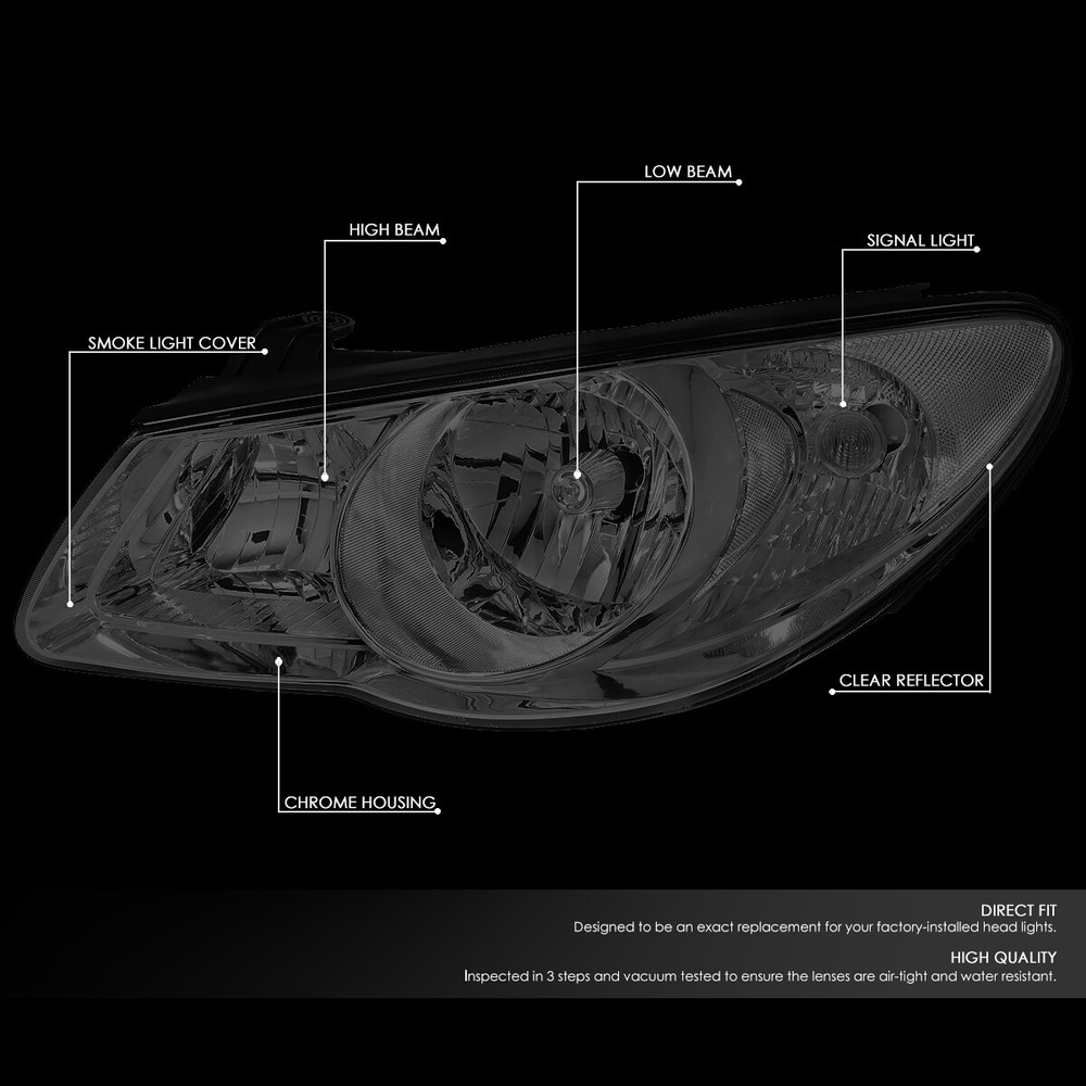 Welcome to our eBay store DPT Motorsport Business Hours: Monday - Friday, 9 AM to 6 PM PST. Store Home Payment Shipping Returns Need Help Add to Favorites About Us Fit 07-09 Hyundai Elantra Left+Right Smoked Housing Clear Side Headlight/Lamps Product Description A headlight (headlamp) is a lamp attached to the front of a vehicle to light the road ahead. Headlight performance has steadily improved throughout the automobile age, spurred by the great disparity between daytime and nighttime traffic fatalities. Headlights are one of the most important components of your vehicle; they allow you to see the road in front of you clearly during the night and in any bad weather that may arise. Our headlights upgrade the face of your vehicle with clear style and extreme range. Made of High-Grade Durable ABS Plastic Materials Factory Style Headlight Smoke Tinted Lens with Chrome Housing Sold as a Pair (Driver & Passenger Side) Plug and Play Operation Direct Bolt-on Replacement for The Stock Unit Easy Installation without Drilling or Modification Needed Improves Visibility and Driving Safety in Hazy Weather Use of H1 Bulb for High Beam / H11B Low Beam Use of 2357A Bulb for Turn Signal Light Bulbs are Not Included; Reuse Existing Bulbs Includes: 1 X Pair of Headlights (Left & Right) Notes: Compatible with: 07-09 Hyundai Elantra 100% Brand New Professional Installation is Highly Recommended Installation Instruction is NOT Included About Us Payment Shipping Returns Feedback Contact Us Have any questions or need info about something you already purchased? We'd love to hear from you! For items already purchased, please kindly include your eBay item number for faster response time. DPT Motorsport operates from Monday through Friday, 10 am to 6 pm (PST). ATTENTION: We are closed on Saturdays and Sundays. All messages will be replied in the order it was received during business days Thank you for choosing DPT Motorsport and happy bidding! We accept PayPal only. We reserve the right to file Non-Paying Bidder if payment is not received 10 days after the auction ended. Shipping Methods All shipments are made via either UPS or United States Postal Service depending on the types of products purchased. Majority of our orders will be ship within 2 business days (mostly within 24hrs) (All mail transit time stated above is best estimated but not guaranteed.) All shipments requires physical addresses, no PO Box address will be shipped. Shipping and handling charges are not negotiable. Return Policy **We stand behind the products we sell. If for any reason you are not satisfied with your purchase, we'll be happy to process a refund the product less S&H within 30 Days of your purchase. All return items will require a RMA number, which is given by our Customer Service Department only. Please allow 10-14 days for returns and exchange to be process. Please inspect all your order(s) upon receipt. All return items MUST be in brand new condition which means the item is never installed and kept in the original packaging. We will not reship replacement(s) before we get a claim approval for the lost or stolen item(s) or the returned item from customers. In most cases, all shipping and handling fees are non-refundable, unless it has been approved by our Customer Service Department. Any item(s) that the buyer states as defective will be tested by our Returns Department, if there is no problems or errors found during testing. Once the RMA# is issued, the buyer will have 30 days to return the item, if any items that is return after 30 days, the item(s) are subject for rejection. All items are brand new unless otherwise stated. PROFESSIONAL installation is highly recommended. Buyer assumes all risk on usage. About Us Have any questions or need info about something you already purchased? We'd love to hear from you! For items already purchased, please kindly include your eBay item number for faster response time. DPT Motorsport operates from Monday through Friday, 10 am to 6 pm (PST). ATTENTION: We are closed on Saturdays and Sundays. All messages will be replied in the order it was received during business days Thank you for choosing DPT Motorsport and happy bidding! Payment We accept PayPal only. We reserve the right to file Non-Paying Bidder if payment is not received 10 days after the auction ended. Shipping Shipping Methods All shipments are made via either UPS or United States Postal Service depending on the types of products purchased. Majority of our orders will be ship within 2 business days (mostly within 24hrs) (All mail transit time stated above is best estimated but not guaranteed.) All shipments requires physical addresses, no PO Box address will be shipped. Shipping and handling charges are not negotiable. Returns >Return Policy **We stand behind the products we sell. If for any reason you are not satisfied with your purchase, we'll be happy to process an exchange or refund the product less S&H within 30 Days of your purchase. All return items will require a RMA number, which is given by our Customer Service Department only. Please allow 10-14 days for returns and exchange to be process. Please inspect all your order(s) upon receipt. All return items MUST be in brand new condition which means the item is never installed and kept in the original packaging, otherwise you will be subjected to a 20% restocking fee. We will not reship replacement(s) before we get a claim approval for the lost or stolen item(s) or the returned item from customers. In most cases, all shipping and handling fees are non-refundable, unless it has been approved by our Customer Service Department. Any item(s) that the buyer states as defective will be tested by our Returns Department, if there is no problems or errors found during testing, there will be a mandatory 20% restocking fee for the price of the item. Once the RMA# is issued, the buyer will have 30 days to return the item, if any items that is return after 30 days, the item(s) are subject fo