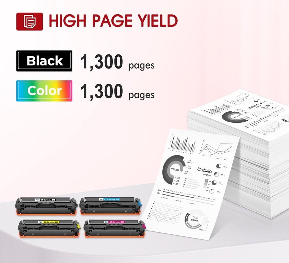 #3020 075 Toner Cartridge Set 075H LBP646Cdw MF665CDW MF662CDW Compatible Replacement for Canon Color ImageCLASS MF663Cdw LBP647Cdw MF660c LBP640c Printer 4 Pack High Yield Ink (Black Cyan Yellow Magenta) Brand Cool Toner Color 075 Black Cyan Magenta Yellow Item Weight 4.98 Pounds Compatible Devices Color Imageclass MF665CDW MF662CDW MF663Cdw LBP646Cdw LBP647Cdw Printer Manufacturer Cool Toner (NOT Canon OEM) for 075 075H Cool Toner compatible 075 075H CRG-075 CRG-075H toner provide high-quality printing and produce excellent results Package contents: 4 packs 075 075H toner cartridge set Page yield: 1,300 pages for 075 black toner and 1,300 pages per 075 color toner at 5% coverage (Letter/A4), replacement for Color Imageclass LBP646Cdw MF665CDW MF662CDW toner cartridges Compatible for printers: color imageclass MF665CDW MF662CDW MF663Cdw LBP646Cdw LBP647Cdw printer High quality: Cool Toner 075 075H toner cartridge set committed you with consistency, vibrant color, sharp printin