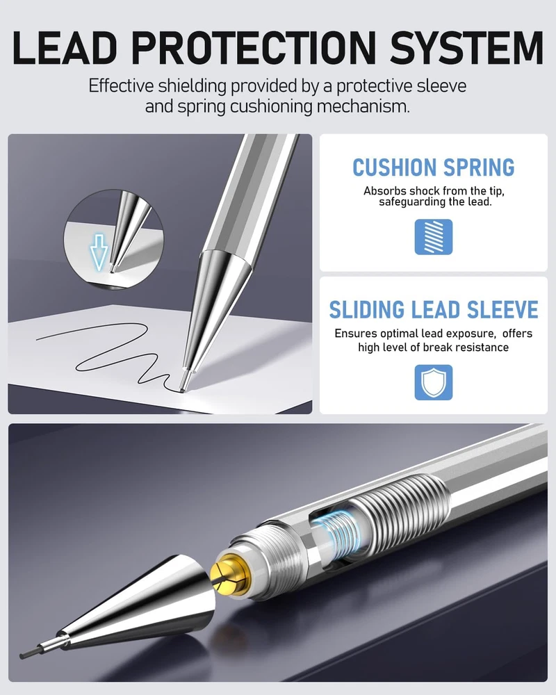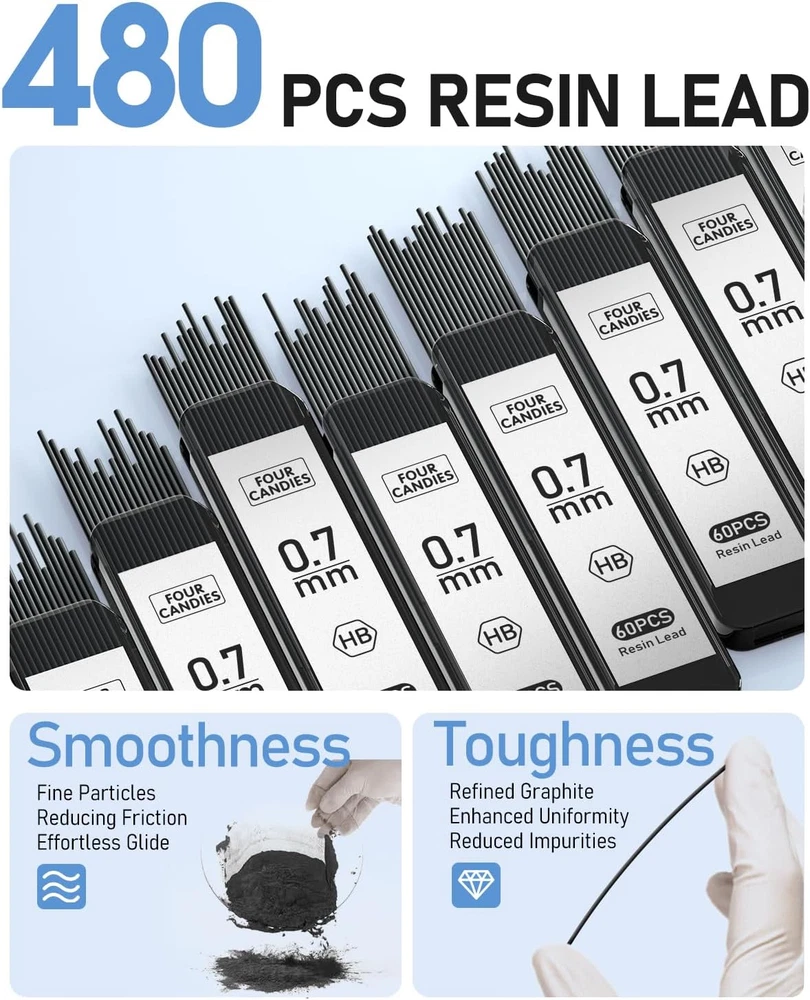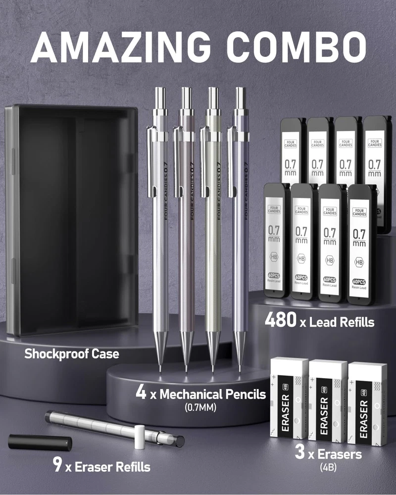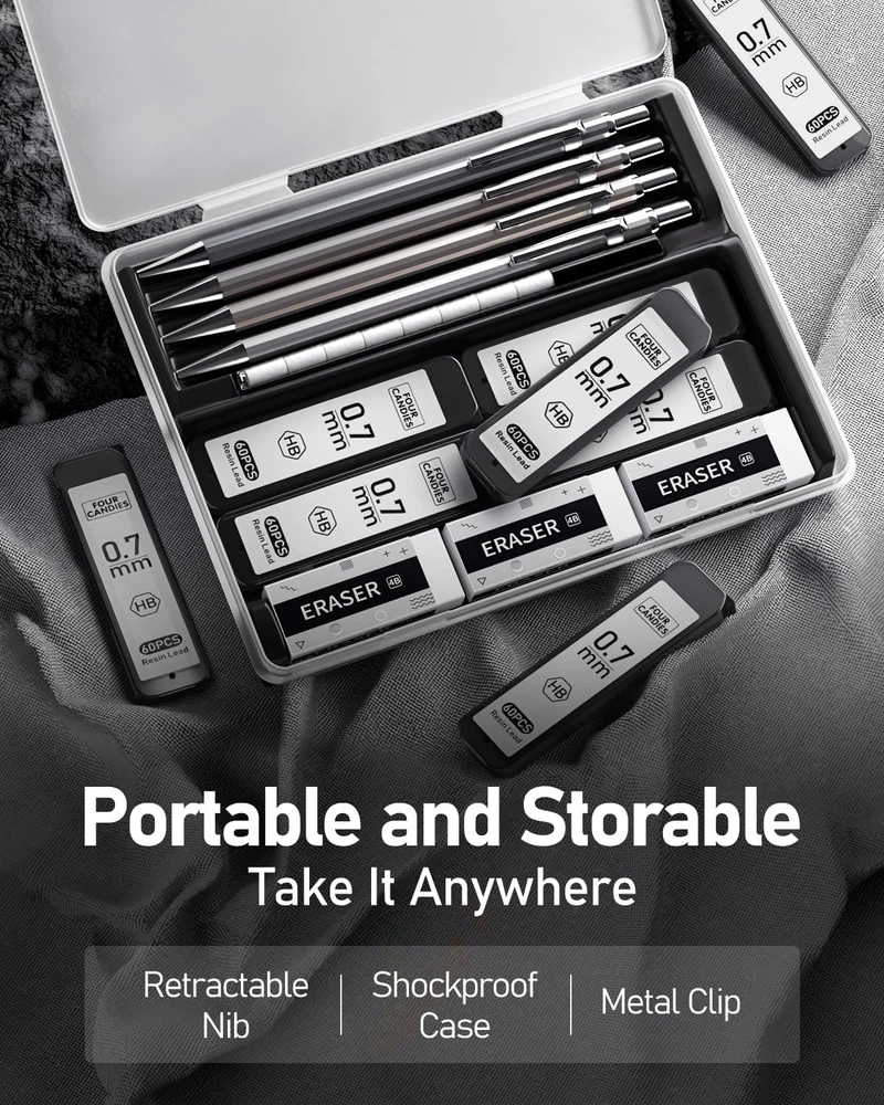 All-in-One Set: The set contains 4pcs 0.7mm drawing mechanical pencils, 8 tubes of #2 lead (HB), 3pcs 4B erasers and 9pcs eraser refills; Includes a convenient case for easy storage and portability Metal Mechanical Pencil: The smooth barrel of the mechanical writing pencil has a comfortable feel, and the metal body provides the ideal weight balance for more efficient and fatigue-free writing and drawing No Slip and Easy to Use: The lead mechanical pencil comes with a metal clip and a polygonal barrel to avoid slipping on the desktop; This pencil is easy to use, anyone can easily load and advance lead 480PCS Resin Lead: 8 tubes of 60pcs super capacity leads; The stronger resin lead which doesn’t require sharpening and is not easy to break, provides ultra-smooth writing and clear dark lines Professional Writing Tools: Great for artists, professionals, teachers and students; For any issues, our friendly customer service is here to help Product Description 1 Your Creative Partner 2 Innovation in Every Line 1 Quality Graphite 2 Efficient Erasing 5PCS - METAL BODY More Recommendations Metal Material Metal 0.7mm Lead Size 0.7mm Weighted + Cushion Spring Mechanism Weighted + Cushion Bulk Refills Storage Case Metal Material Metal 0.7mm Lead Size 0.5 + 0.7 + 0.9 mm Weighted + Cushion Spring Mechanism Cushion Spring Bulk Refills Storage Case 4PCS - METAL BODY 3PCS - METAL BODY