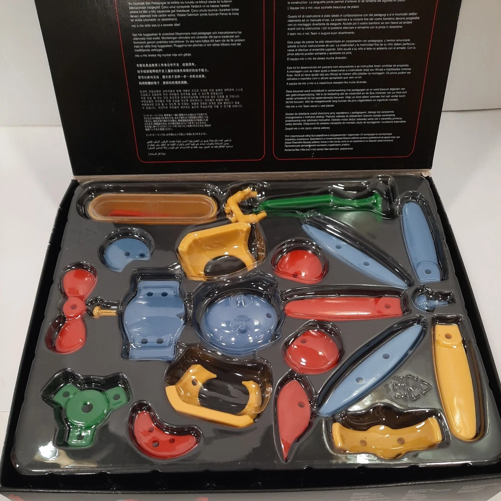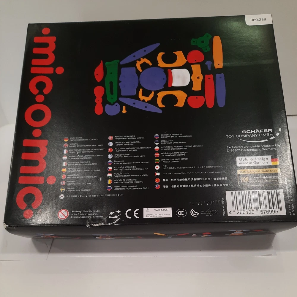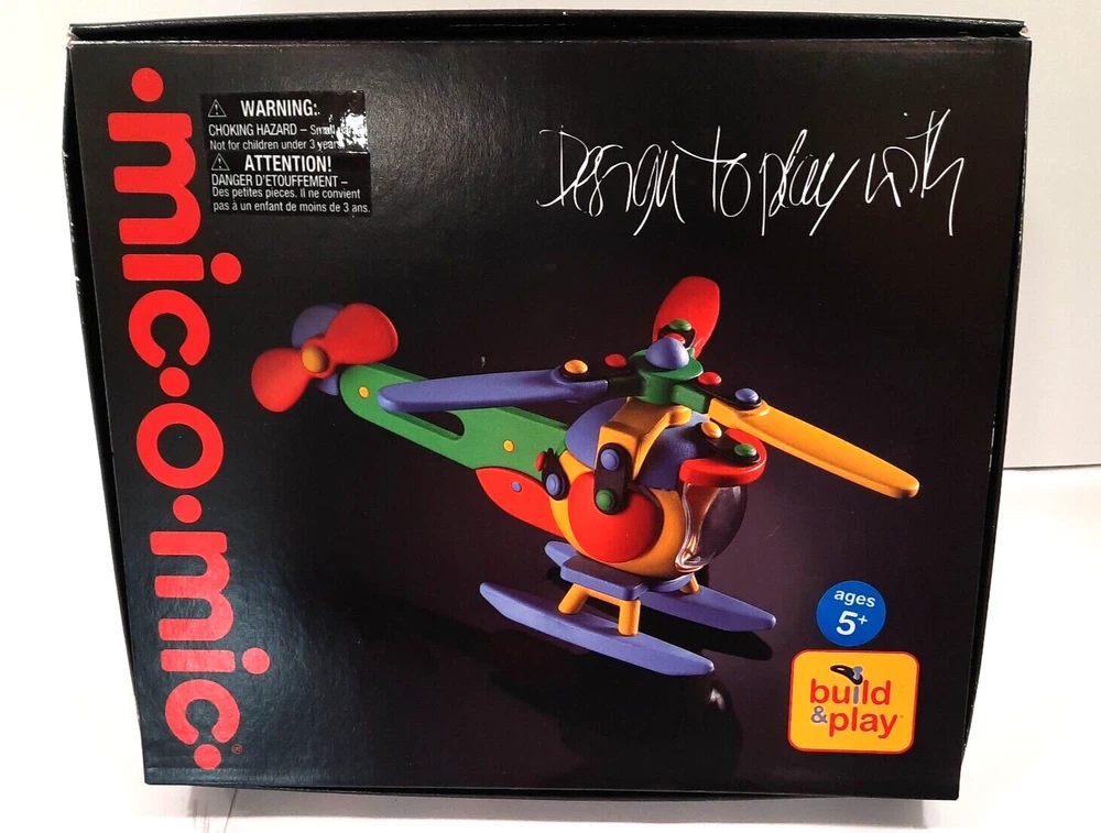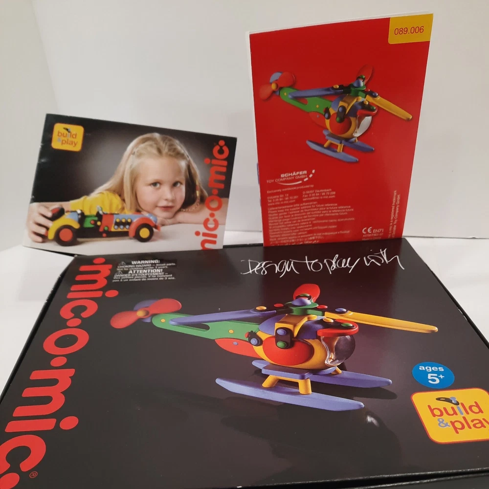 089.289 Chopper, Helicopter Mic-o-Mic Construction Kit, by Schafer Toy Company Germany - Ages 5+ New, never opened parts. Box has a couple of wear points, I will show in pictures. Complete with assembly paperwork. Nice Christmas Gift Idea for Kids Chopper, Mic-o-Mic Construction Kit package measures approximately10" x 8.5" x 2". The Chopper consists of Red, Green, Yellow, Blue and Black plastic parts. Chopper Construction Kit is made to be built and disassembled multiple times but some builders will construct it to be used as a display piece. Mic-o-Mic is produced by Schafer Toy Company. Mold & Design are made in Germany while the kit is Made in China. Suggested for Ages 5+.