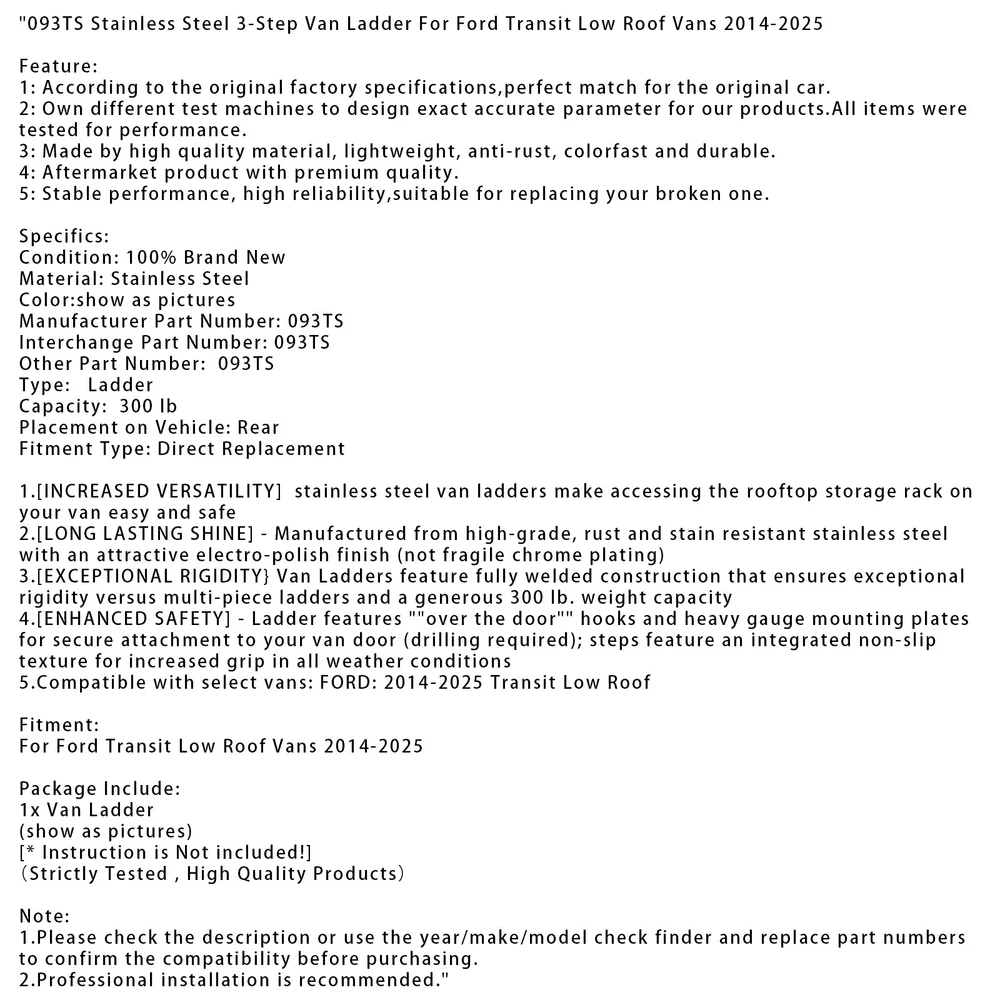 Product Description 093TS Stainless Steel 3-Step Van Ladder For Ford Transit Low Roof Vans 2014-2025 Feature: 1: According to the original factory specifications,perfect match for the original car. 2: Own different test machines to design exact accurate parameter for our products.All items were tested for performance. 3: Made by high quality material, lightweight, anti-rust, colorfast and durable. 4: Aftermarket product with premium quality. 5: Stable performance, high reliability,suitable for replacing your broken one. Specifics: Condition: 100% Brand New Material: Stainless Steel Color:show as pictures Manufacturer Part Number: 093TS Interchange Part Number: 093TS Other Part Number: 093TS Type: Ladder Capacity: 300 lb Placement on Vehicle: Rear Fitment Type: Direct Replacement 1.[INCREASED VERSATILITY] stainless steel van ladders make accessing the rooftop storage rack on your van easy and safe 2.[LONG LASTING SHINE] - Manufactured from high-grade, rust and stain resistant stainless steel with an attractive electro-polish finish (not fragile chrome plating) 3.[EXCEPTIONAL RIGIDITY} Van Ladders feature fully welded construction that ensures exceptional rigidity versus multi-piece ladders and a generous 300 lb. weight capacity 4.[ENHANCED SAFETY] - Ladder features "over the door" hooks and heavy gauge mounting plates for secure attachment to your van door (drilling required); steps feature an integrated non-slip texture for increased grip in all weather conditions 5.Compatible with select vans: FORD: 2014-2025 Transit Low Roof Fitment: For Ford Transit Low Roof Vans 2014-2025 Package Include: 1x Van Ladder (show as pictures) [* Instruction is Not included!] (Strictly Tested , High Quality Products) Note: 1.Please check the description or use the year/make/model check finder and replace part numbers to confirm the compatibility before purchasing. 2.Professional installation is recommended. ♦ If you are not sure about the part fitment to your vehicle, please supply your Vehicle Model / VIN number / OE Part Number we will check it for you! ♦ Compatibility Chart is for the reference only. The best way to check compatibility is to check the Part Number on your old unit if possible. SHIPPING & HANDLING RETURNS WARRANTY ABOUT US ♦Every item will be inspected and packed carefully before shipping. ♦ Processing Time : shipped within 3 business days (Mon-Fri, excludes holidays) ♦ Estimated delivery time : 3-5 business days . ♦ Tracking Info : Provided automatically via eBay. ♦All orders will be shipped through USPS First Class, UPS and Fedex depends on the weight of the items. ♦ Fast & Reliable Shipping – Your order is our priority! 🌍 Ships from U.S. Warehouse – No long waits! 📦 Standard Shipping (Free): 3-5 business days (U.S. only). We Want You to Love Your Purchase! Our 60-day return policy protects you: ✨ STEP 1 : Message Us First - we often solve issues without returns! ✨ STEP 2 : If the return is due to change of mind, select "Didn't like item" or "Ordered by mistake" . For tem not as described, provide details and photos to help us assist you promptly. Why Contacting Us First Helps You: • Faster solutions (often within 48 hours !) • Possible instant refund or replacement options • Personalized return instructions for your case For Your Protection: • We carefully inspect all returns • Please use tracking when shipping back • "Not as described" returns require photos/video for fastest resolution Help us serve you better by contacting us first! No-Questions-Asked Warranty ♦HASSLE-FREE WARRANTY • 90-365 Day Coverage (varies by product - see listing details) • No Return Required for claims under $20 - we ship replacements immediately ✖ Exclusions : Physical damage (drops/accidents) Installation errors (YouTube tutorial links provided) ♦ Claim Process: Contact us via eBay Messages within warranty period Clear photos/video of the issue We respond within 24-48 hours with solution About Artudatech Established in 2009, Artudatech is specialized in auto parts and are manufacturers of leading auto parts brands,It is headquartered in California with convenient transportation. Artudatech including majority of the best seller autoparts which are fully compatible with the vehicles. When you need parts for your car, reach out to us so that your car could go more far than ever. All of the parts have warranty. Please contact with our customer service crew if you encounter any questions or concerns, we stand behind every part in our store. Excellent product and considerate service. Let time verify quality and win the future with reputation. We hope you can find what you want here and enjoy your shopping. SHIPPING & HANDLING ♦Every item will be inspected and packed carefully before shipping. ♦ Processing Time : shipped within 3 business days (Mon-Fri, excludes holidays) ♦ Estimated delivery time : 3-5 business days . ♦ Tracking Info : Provided automatically via eBay. ♦All orders will be shipped through USPS First Class, UPS and Fedex depends on the weight of the items. ♦ Fast & Reliable Shipping – Your order is our priority! 🌍 Ships from U.S. Warehouse – No long waits! 📦 Standard Shipping (Free): 3-5 business days (U.S. only). RETURNS We Want You to Love Your Purchase! Our 60-day return policy protects you: ✨ STEP 1 : Message Us First - we often solve issues without returns! ✨ STEP 2 : If the return is due to change of mind, select "Didn't like item" or "Ordered by mistake" . For tem not as described, provide details and photos to help us assist you promptly. Why Contacting Us First Helps You: • Faster solutions (often within 48 hours !) • Possible instant refund or replacement options • Personalized return instructions for your case For Your Protection: • We carefully inspect all returns • Please use tracking when shipping back • "Not as described" returns require photos/video for fastest resolution Help us serve you bette
