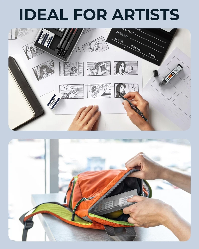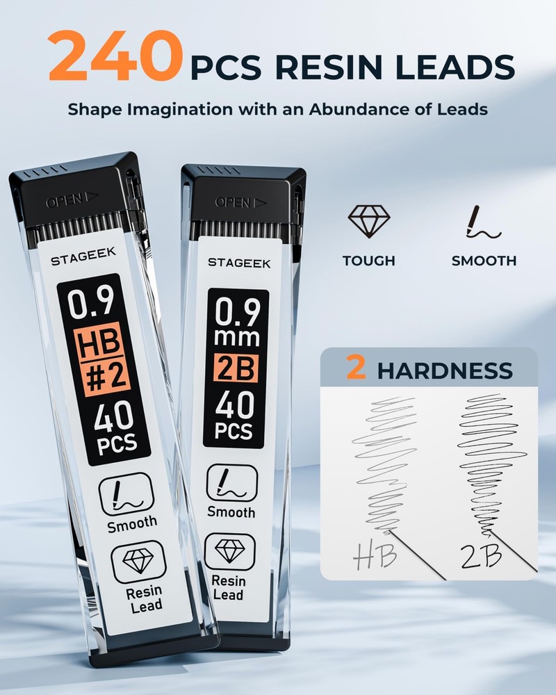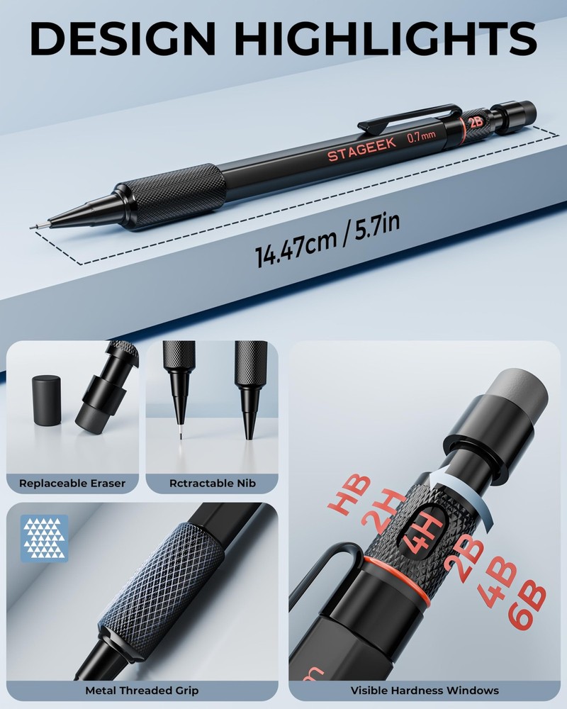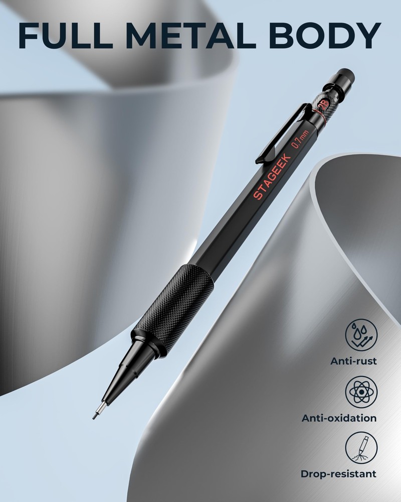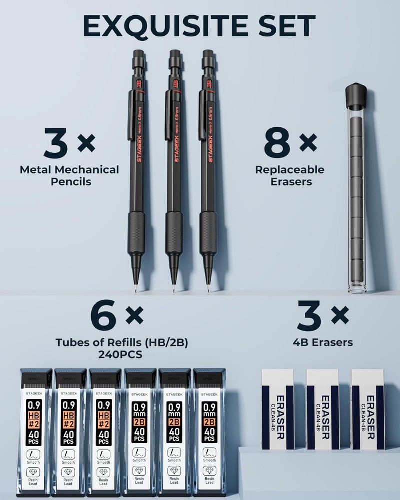Experience the art of writing with our 0.9mm mechanical pencils, presented in an elegant 3-pack that’s perfect for your everyday adventures. Crafted for smooth, effortless writing, each pencil combines style and functionality in a stunning full metal design. The dependable HB lead provides the perfect balance for daily tasks, while the luscious 2B lead invites you to explore your artistic side with bold strokes and beautiful shading. Say goodbye to tedious sharpening and dust—these durable leads are here to keep your creativity flowing. Whether you're at school, work, or in the studio, let your ideas flow freely with these exceptional writing tools! Value Mechanical Pencil Set: This premium collection features 3pcs mechanical pencils 0.9mm, 6 tubes of high-quality HB & 2B lead refills, 3pcs 4B erasers, 8pcs cap eraser refills, and a plastic storage box. HB & 2B Hardness: The HB 0.9mm lead refills are perfect for everyday writing, offering balanced hardness. The 2B lead is ideal for fine details and sketching. These leads are durable, smooth, effortless writing. Full Metal Design: Offers a balanced weight distribution for a comfortable writing experience. The sturdy material is highly durable and performs well in various environments, making it a reliable choice for both indoor and outdoor use. Integrated Construction Design: This pencil features a robust integrated construction design for enhanced durability and stability. It ensures a strong connection between components, preventing disassembly and promoting precise, smooth writing. Metal Threaded Anti-Skid Grip: The metal threaded grip features an anti-skid texture, providing a secure and ergonomic hold for writing or drawing, reducing hand fatigue.
