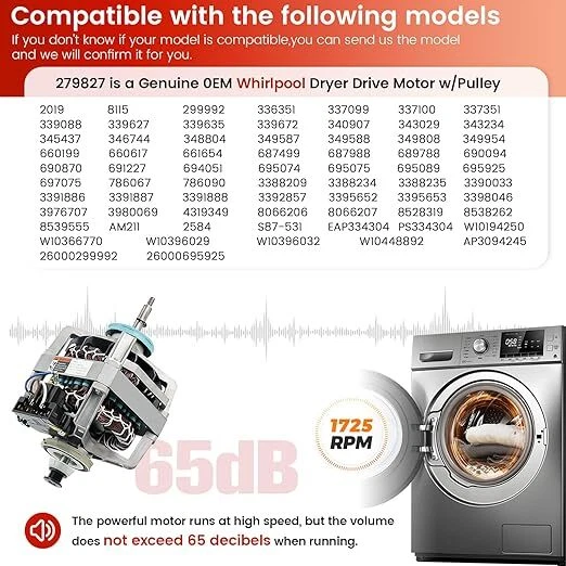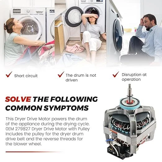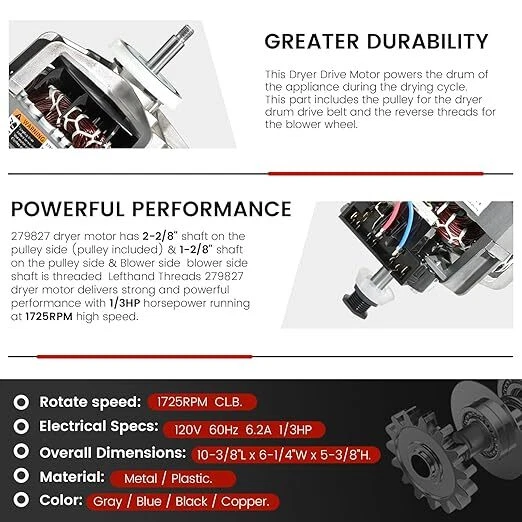 0EM 279827 Dryer Drive Motor with Pulley (Upgraded Blower Shaft Length) - Replacement for MayTag Kitchenaid Kenmore Whirlpool Dryer Motor - Replaces AP3094245, EAP334304, PS334304,W10194250 ใ๐ฌ๐๐ ๐๐๐ก๐จ๐๐ก๐ ๐ฎ๐ณ๐ต๐ด๐ฎ๐ณ ๐๐ฅ๐ฌ๐๐ฅ ๐ ๐ข๐ง๐ข๐ฅใThe 279827 is a genuine OEM Whirlpool Dryer Drive Motor w/ Pulley which is manufactured to exact specifications with high quality materials.โบ279827 dryer motor has 2-2/8" shaft on the pulley side (pulley included) & 1-2/8" shaft on the pulley side & Blower side, blower side shaft is threaded, Lefthand Threads,279827 dryer motor delivers strong and powerful performance with 1/3HP horsepower, running at 1725RPM high speed while maintaining low noise levels.โบCrafted from durable premium materials, this dryer drive motor features thermal protection that revive your old dryer and speed up clothes drying ใ๐จ๐ฃ๐๐ฅ๐๐๐๐ ๐๐๐ข๐ช๐๐ฅ ๐ฆ๐๐๐๐ง ๐๐๐ก๐๐ง๐ใDryer Drive Motor powers the drum of the appliance during the drying cycle. The ๐จ๐ฃ๐๐ฅ๐๐๐ ๐๐๐ก๐จ๐๐ก๐ Replacement WhirlPool 279827 Dryer Drive Motor with Pulley is used in models since 1965. Blower shaft length is 2-2/8",featuring a robust 1/3 HP motor and a rapid 1725 RPM rotation, this dryer motor ensures speedy and efficient clothes drying. It operates quietly With noise levels below 65 db, this dryer drive motor provides a peaceful user experience, allowing you to use it without disruptions. And features overload protection, ensuring hassle-free drying without loud noise disturbances or concerns about overheating ใ๐๐ฅ๐๐ฉ๐๐ฆ ๐ง๐๐ ๐ฅ๐ข๐ง๐๐ง๐๐ข๐ก ๐ข๐ ๐ง๐๐ ๐๐ฅ๐จ๐ ใ279827 dryer motor is a must-have in your laundry room.Fixing a range of dryer symptoms: unable to start, drum not rotating, short circuit, disruption at operation, loud noise and more,addressing common dryer issues and rejuvenating your dryer's overall performanceโบ๐๐ผ๐น๐ผ๐ฟ: Gray / Blue / Black / Copper. ๐ ๐ฎ๐๐ฒ๐ฟ๐ถ๐ฎ๐นl: Metal Aluminum Wire Motor. ๐๐น๐ฒ๐ฐ๐๐ฟ๐ถ๐ฐ๐ฎ๐น ๐ฆ๐ฝ๐ฒ๐ฐ๐: 120V, 60Hz, 6.2A, 1/3HP, 1725RPM, CL.B. ๐ก๐ผ๐ถ๐๐ฒ ๐๐ฒ๐๐ฒ๐น: โค65 dB ๐ข๐๐ฒ๐ฟ๐ฎ๐น๐น ๐๐ฑ๐ฑ๐ถ๐๐ถ๐ผ๐ป๐ฎ๐น ๐๐ถ๐บ๐ฒ๐ป๐๐ถ๐ผ๐ป๐: Blower Shaft measures 1-2/8" diameter,Drive Shaft measures 2-2/8" diameter ใ๐ฆ๐จ๐๐ง๐๐๐๐ ๐๐ข๐ฅ ๐ ๐ข๐ฆ๐ง ๐๐ฅ๐๐ก๐ ๐๐ฅ๐ฌ๐๐ฅ๐ฆใ279827 Dryer Drive Motor w/ Pulley fits some models from the following brands of dryer: Admiral, Amana, Crosley, Estate, Inglis, Kenmore, Kitchen Aid, Maytag, Roper, Whirlpool.Directly Replaces: 279827, AP3094245, 3388235, 2019, 26000299992, 26000695925, 337099, 337100, 3388209, 3388234, 339088, 3391886, 3391887, 3392857, 339627, 339635, 339662, 339672, 340907, 343029, 345437, 348804, 349587, 349808, 3980069, 660199, 660617, 661654, 687499, 689788, 687988, 690094, 690870, 694051, 695089, 695925, 697075, 786067, 786090, 8066206, 8066207, 8115, 8528319, 8538262, 8539555, AM211, K35-099, S87-531, W10194250, W10366770, W10396029, etc