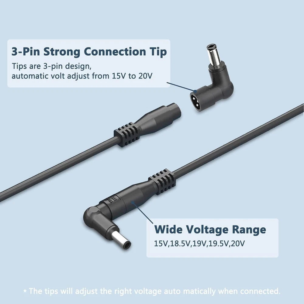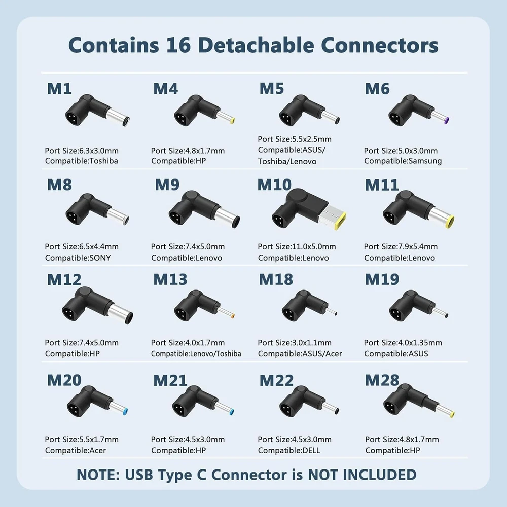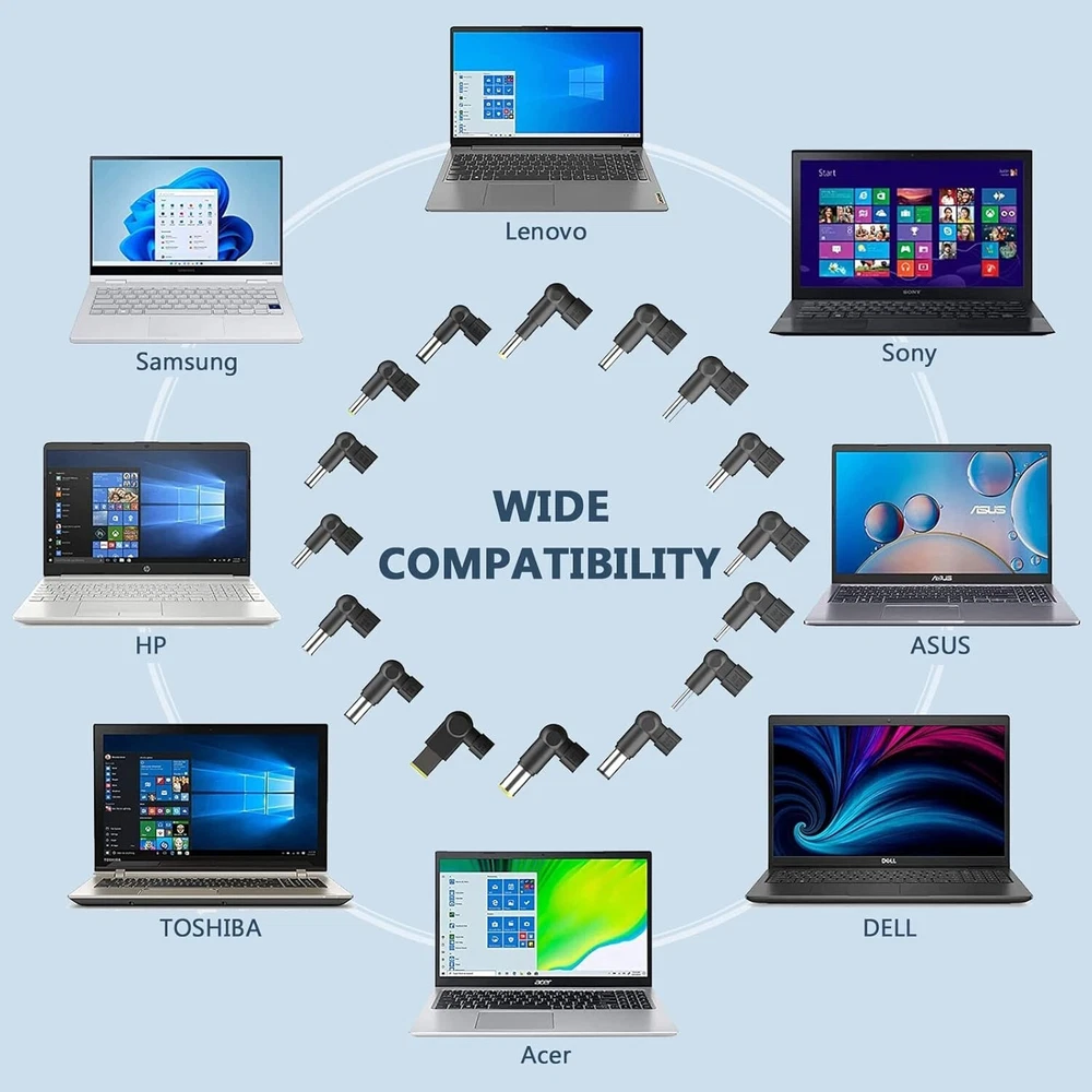 90W Universal AC Adapter Laptop Charger Compatible with HP Dell Lenovo Acer Asus Toshiba Samsung IBM Sony Fujitsu Gateway Notebook Ultrabook Chromebook Power Supply Cord with 16 Connectors 【Universal Laptop Chargers】This 90W charger is equipped with 16 DC connector tips to work for HP Compaq Dell Acer Asus Toshiba IBM Lenovo Samsung Sony Fujitsu Gateway and more brands' laptops.Plug and play, Easy to use with automatic voltage adjustment. You can power your different brand laptops with just one laptop power cord 【Wide output voltage】15V-20V, Input Voltage: Worldwide 100-240V, 50 - 60Hz. Output Voltage: DC 15V, 16V, 18. 5V, 19V, 19. 5V, 20V, 16 Connector Types. Perfectly Compatible with 90W 75W 70W 65W 45W 40W 33W Laptops. Each brand laptop has several different kinds of tips for different models. If you are not sure your laptop tip size, Please send your laptop brand and model number to us before buying 【Strong Compatibility】The 90W Universal Power Adapter is compatible with HP Pavilion G4 G6 G7 G42 G50 G71 ENVY 14-1100 17-1100 Compaq 6510B 6515B 6720T 6730B 6730S EliteBook 745 G2 820 G1 840 G1 850 G1 Probook 4420S 4430S 4440S 4510S Lenovo Ideapad Flex 2 3 14 15 Yoga 11 11S 13 Lenovo ThinkPad L440 L450 L540 Thinkpad Edge E431 E440 E450 E455 Lenovo G500 G505 G510 G410 Dell Vostro 14 15 XPS 11 12 13 9350 9360 9365 9370 I nspiron 11 12 13 14 15 17 Latitude 12 7202 13 3379 7350 14 E5450 etc 【Strong Compatibility】 Acer Aspire E 15 E5-575-33BM A114-31-C4HH E5-575G-57D4, CB3-131-C3SZ, CB3-131-C8GZ, 14 CB3-431-C5FM cb3-532 15 CB5-571-C09S;ACER Chromebook 11 13 14 15 C720, C720P C740 Cb3 Cb5, Aspire P3 S5 S7; TOSHIBA Chromebook 2 Cb35 CB30, Satellite C55-C5241, P755 P775 P870 S855 S875 U305 U505; SAMSUNG NP530U4BL GS6/GT6/7/8, X05 Series, VM GT NT; DELL I nspiron 11Z-1121 1320 13Z-5323 14-3420 14Z-5423 15R-5520 15R-5537, 14R 17R, N5010 N7110, Studio 15 17 【Package Content】 -- 1x 90W Universal Laptop Charger, 16 DC Connector Plugs(USB Type C Connector is NOT INCLUDED), 1x US Power Supply Cord, 1xUser Manual Notes: The laptop charger is NOT compatible with all notebook models. Please make sure that your laptop's Rated Wattage is less than or equal to 90 Watts. (Rated Wattage=input Voltage input Current). For connector specification, please refer to the connector image