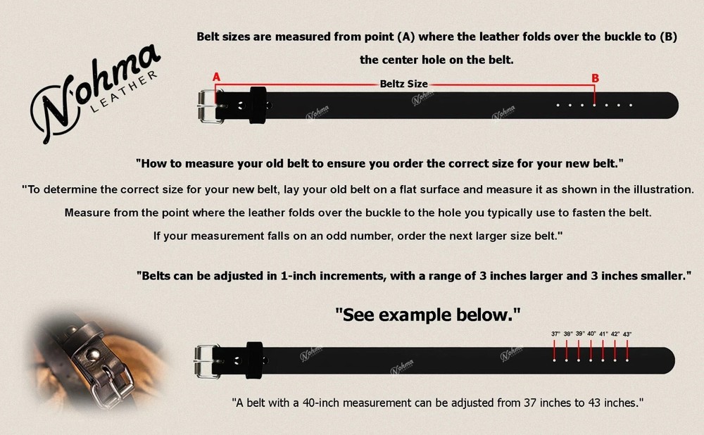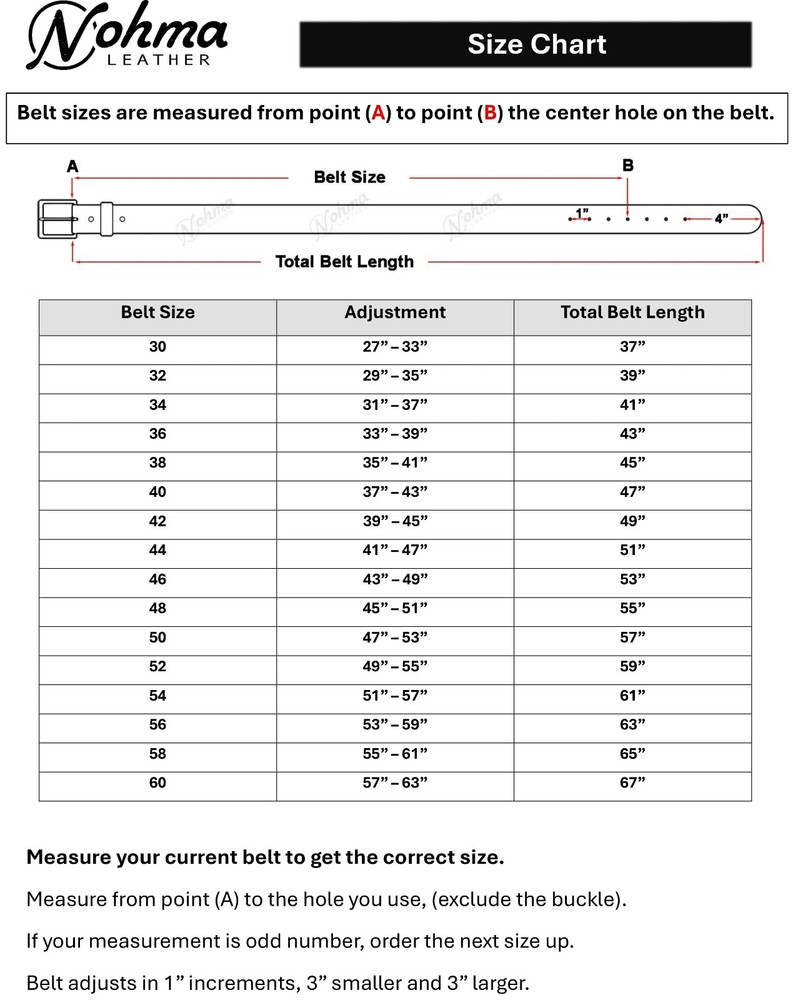 Heavy Duty Leather Work Belt Available in Black or Brown Product Details: Durable heavy-duty leather work belt, ideal for everyday work use or carrying a gun holster. Carefully handcrafted from 12–13 oz 100% full-grain leather, approximately 3/16" to 1/4" thick, providing excellent strength and long-lasting performance. This belt is 1.5 inches wide, designed for durability and comfort, making it suitable for work, outdoor use, or concealed carry. The belt comes with a strong stainless steel buckle and snap fasteners, allowing you to easily remove the buckle and replace it with your own preferred buckle if desired. Color Options: Black or Brown Size Range: Available in sizes 32" to 60" Width: 1 1/2 inches --- How to Choose Your Size If you already have a belt that fits well, measure from the end of the buckle to the hole you normally use to determine your size. A common recommendation is to order a belt 3–4 inches larger than your pants size for a comfortable fit. You may also measure your waist directly and choose a belt that matches your waist measurement. For odd measurements, it is recommended to select the next size up.