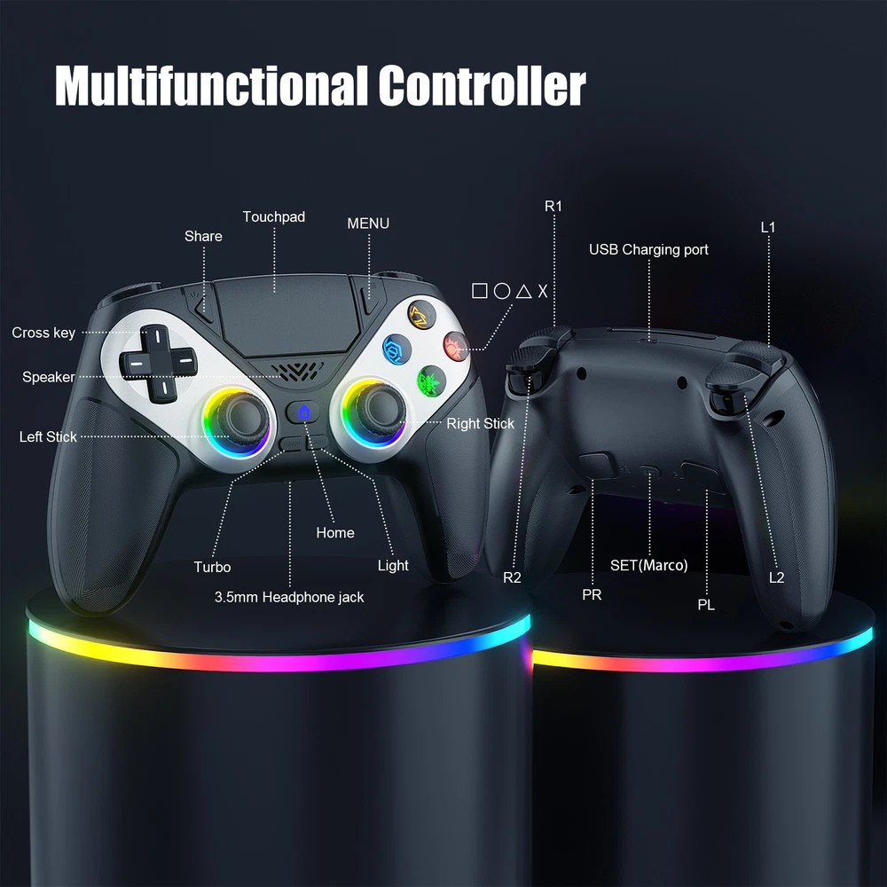 Product Description Product Detail: RGB Lights Wireless Controller For PS5 Connection method: Wireless Compatible with Playstion 5 Pro/Slim/Windows 3D Joystick Somatosensory Dual Motor Vibration Feedback Delicate vibration sensation One-touch Function Sensitive Joystick Voice Controller : Support wired and Bluetooth speaker functions Colorful Lighting Effects Marco Function Turbo Function Large Capacity Battery: 1000mAh Working time: 10-15 runtime fully Charged time : 3-4 Hours Function: Connect to the PS5 console through the handle to control the corresponding PS5 games; The handle has a built-in 3.5MM headphone jack and supports voice function; Supports dual-point capacitive sensing touchpad; Supports dual-motor vibration function. ✅ Six axis function: A brand new motion sensing technology with built-in three-axis gyroscope and three-axis accelerator can detect all-round dynamic information including Roll (left and right tilt), Pitch (front and back tilt), and Yaw (left and right rotation). In addition to accurately sensing the tilt angle of the handle, it can also capture acceleration information of three-dimensional space X, Y, Z, and 3-axis, and quickly transmit all data to the game system, Players can fully use this innovative motion sensing technology to perform special operations in games. ✅ Headphone port: The 3.5mm TRRS stereo jack can connect headphones and microphones, allowing users to receive and transmit audio simultaneously. ✅ Turbo function settings: Set the function of the function key Turbo, the function keys include (╳, ○, □, △, L1, L2, L3, R1, R2, R3) 1. Press and hold any function key 2. Then press the Turbo key MACRO programming function: 1. Press the SET key for 3 seconds,P indicator light flashing slowly,and the motor vibrates 2. press any function key ↑,↓,←,→,╳, ○, □, △, L1, L2, L3, R1, R2, R3 and record key press and release times (The macro programming can record a maximum of 16 key values) 3. After recording,press ant key of PL/PR,the motor vibrates and the P indicator is always on, the button programming is successful Headphone port: The 3.5mm TRRS stereo jack can connect headphones and microphones, allowing users to receive and transmit audio simultaneously. About Us Payment Shipping Returns Contact Us Welcome to our store! We are a professional worldwide wholesale company. High product quality, reasonable prices, excellent customer service and a reliable credit standing is our tenet.If you like our products, please add my eBay shop to your "My Favorites" list. All the products we are selling include factory warranty , don’t cover items that have been abused, burned and damaged in any form. We accpet payment via PayPal , E-wallet , some Credit Card , Direct Debit and Other specific payment methods. Import duties,taxes and charge are not included in the item's price or shipping cost.These charges are the buyer's responsibility. Please check with your country's customs office to determine what these additional costs will be prior to bidding or buying. Insurance is included in the Shipping & Handling costs paid. Items are generally shipped out in 1-3 business day after your payment has been cleared (Sat. & Sun. excluded.) Orders from the United States Warehouse will be shipped out via USPS or UPS. The shipment usually takes 3-7 business days(Saturday and Sunday excluded), if you need the item urgently, please contact us for detail before purchasing. Local pick up is not available. Orders from China will be shipped via Belgian Post or Post NL.The shipment will take 15-35 working days,please contact us if you didn't get the parcel for a long time. We do not ship to APO, FPO, Alaska, Hawaii and Puerto Rico addresses, and we are unable to ship to PO BOX for this item. Please provide your psychical address. You have 60 days to return it from the date it was received. All returned items must be in the original package and you must provide us with the shipping tracking number,specific reason for the return and your ebay ID. We will refund your full winning bid amount , upon receipt of the item in its original condition and package with all components and accessories included. Dear buyers,we appreciate your business, if you are satisfied with our service , please leave us a Positive feedback and rate the details of the transaction (Detailed Seller Ratings) with a " Pefect Stars ". We aim to provide best services and products in exchange your maximum statifaction. We will do our best to resolve your issue till your satisfaction. O ur working time is: 09:00 AM-18:00 PM(Chinese time from Monday to Saturday) .All emails will be answered within 24 hours except weekends and holidays. About Us Welcome to our store! We are a professional worldwide wholesale company. High product quality, reasonable prices, excellent customer service and a reliable credit standing is our tenet.If you like our products, please add my eBay shop to your "My Favorites" list. All the products we are selling include factory warranty , don’t cover items that have been abused, burned and damaged in any form. Payment We accpet payment via PayPal , E-wallet , some Credit Card , Direct Debit and Other specific payment methods. Import duties,taxes and charge are not included in the item's price or shipping cost.These charges are the buyer's responsibility. Please check with your country's customs office to determine what these additional costs will be prior to bidding or buying. Insurance is included in the Shipping & Handling costs paid. Shipping Items are generally shipped out in 1-3 business day after your payment has been cleared (Sat. & Sun. excluded.) Orders from the United States Warehouse will be shipped out via USPS or UPS. The shipment usually takes 3-7 business days(Saturday and Sunday excluded), if you need the item urgently, please contact us for detail before purchasing. Local pick up is not available. Orders from China will be shipped via Belgian Post or Po
