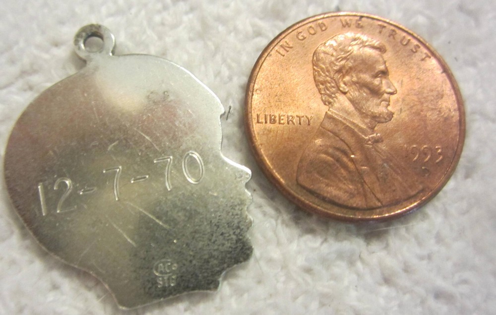 Used,has engraved name and date on back. See penny for size reference. See pics for condition. See photos for condition.Photos are considered part of the condition and description.If you are buying multiple items,save them in your cart and make one payment and they will ship together. USPS sets shipping prices and we always send cheapest unless requested otherwise. Shipping prices are non negotiable. We DO NOT ship to any other address besides your approved shipping address on ebay and our labels are printed from the same. We ship to the USA ONLY. All items will be shipped out the next day.(not including weekends and holidays) ASK QUESTIONS,DO NOT ASSUME.IF IT IS NOT IN THE DESCRIPTION AND PHOTO ,IT IS NOT INCLUDED. If an item is listed as untested,as is,or for parts or repair it is sold "as is" and assume it does not work. We ship USPS and Fed ex only.Fed-ex does not ship to PO boxes. C24