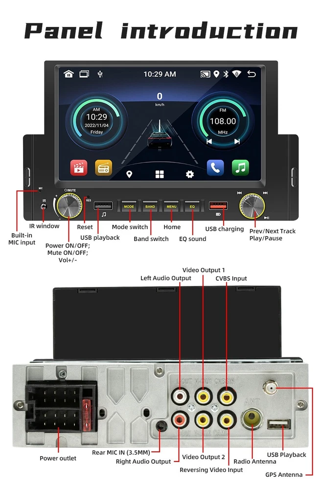 Product Description 1 Din Car Radio W/12LED Camera Android 10.1 Bluetooth Handsfree Wifi GPS USB Mirror Link 6.2in Multimedia Player 2+32G Head Unit Support CarPlay Android-Auto Add our listing to Watchlist Or Add to Cart , you will get more discount Performance parameters Type: Android navigation machine System: Android 10.1 Software solution: Jing Anchi Radio IC: FM 87.5~108.0MHz Power amplifier IC: YD7388 Output power: 60Wx4 Working voltage: 12~14.4V Working temperature: - 10~60 ℃ Bluetooth version: 4.0 (default name: Car BT) Wifi frequency:2.4GHz GPS signal:GPS+GLONASS+Beidou CPU:A7 1.1GHz x 4 Operating memory 2G (DDR3) Memory:32G Display resolution: 800x480 Screen size: 6.2 inches Installation size:178x50MM Face shell size: 188x110MM Host depth: 108MM Functional parameters Mobile internet: support Reverse camera:support (camera optional) Play video warning: support Steering wheel control: supports key learning Video output: support Offline map: is not supported DASH CAM: support (optional) GPS navigation: support USB: front USB charging (red)+front USB2.0 reading (black)+rear USB2.0 reading TF card: does not support Reset button: support Audio output: 2 channels (left channel+right channel) Video output: 2 channels Audio input: is not supported Rear external microphone input: support (optional) Video input: 1 channel Reverse video input: 1 channel Audio format: MP3/WMA/WAV/APE/FLAC/AAC/OGG/RM Video format: MPEG/AVI/RM/FLV/ASF/WMV/MP4/MKV/OGM/TS/DivX/RMVB/VOB Picture format: JPG/BMP/PNG/JPEG/GIF Language parameters Chinese/Chinese Traditional/English/Russian/Greek/Polish/Turkish/Arabic/Persian/Romania/French/Hungarian/Italian/Thai/German/Ukrainian/Spanish/Portuguese/Czech/Vietnamese/Japanese/Malaysia/Dutch/Indonesian/Korea Factory setting password: 1234 Basic functions 1. Radio (FM) 2. Read USB flash disk (audio/video/pictures) 3. Audio input function 4. Bluetooth function 6. Rear view function (camera optional) 7. Video input 8. Original vehicle steering wheel learning function 9. Android recorder can be installed 10. WIFI internet access 11. GPS navigation 12. Mobile Internet (Android/Apple) 13. APP can be installed 14. Wired/wireless android auto, wireless carplay Accessories 1. Host 2. Instruction 3. Power cord 4. Remove the key 5. 12LED Rear Camera Payment Returns Contact Us Shipping We accept payment by PayPal only ! Payment should be completed within 5 days after buyer places the order,or else an unpaid case will be opened in order to cancel the transaction. If you can not pay in time, please contact us. e-check from PayPal will only be processed once the payment clears. All of the items will be shipped to buyer's EBAY address,please confirm your address on Ebay before you buy.Your order will be usually shipped out the same or next business days once the payment is made and cleared. 30-day Warranty with Exchange for defective, malfunctioned, incorrect or parts-missing items. Please notify us and return the item with all parts and accessories packed and marked "FOR EXCHANGE" within 14 days of receipt. If defective, malfunctioned or parts-missing items are no longer available, a refund may be issued. All returning postage costs will be the responsibility of the buyers under all circumstances. If you encounter any problems about anything, please feel free to contact us and we will do our best to assist you solve the issue. If you are not satisfied in anyway, please feel free to let us know and give us a second chance to correct it before you decide to leave any neutral or negative feedback. Please contact us through eBay link if you have any questions. We will reply you within 24- 48 hours. Please check you spam mail if no response for 48 hours. All items will be checked before packing. All items are new and of high quality. Item will be shipped within 1 business days upon receipt of payment, excluding weekends and public holidays. If to USA,we will ship your order by USPS,it will take about 8-12 working days to you,and you can track it on line. If to other country,we will ship your order by China Post or Singapore Registered Air Mail,it will take about 14-21 working days to you,you aslo can track it on line. Delivery time is about 14-28 business days and it may take up to 8 weeks . Payment We accept payment by PayPal only ! Payment should be completed within 7 days after buyer places the order,or else an unpaid case will be opened in order to cancel the transaction. If you can not pay in time, please contact us. eCHECK from PayPal will only be processed once the payment clears. All of the items will be shipped to buyer's EBAY address,please confirm your address on Ebay before you buy.Your order will be usually shipped out the same or next business days once the payment is made and cleared. Returns 30-day Warranty with Exchange for defective, malfunctioned, incorrect or parts-missing items. Please notify us and return the item with all parts and accessories packed and marked "FOR EXCHANGE" within 14 days of receipt. If defective, malfunctioned or parts-missing items are no longer available, a refund may be issued. All returning postage costs will be the responsibility of the buyers under all circumstances. Contact Us If you encounter any problems about anything, please feel free to contact us and we will do our best to assist you solve the issue. If you are not satisfied in anyway, please feel free to let us know and give us a second chance to correct it before you decide to leave any neutral or negative feedback. Please contact us through eBay link if you have any questions. We will reply you within 24- 48 hours. Please check you spam mail if no response for 48 hours. Shipping All items will be checked before packing. All items are new and of high quality. Item will be shipped within 1 business days upon receipt of payment, excluding weekends and public holidays. If to USA,we will ship your order by USPS,it will take about 7-10 working days to you,and you can track it on line.