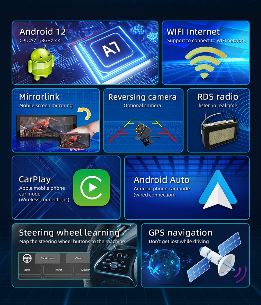 Product Description Android 12 Multimedia Player 6.86in 1 Din GPS Navigation WiFi FM Bluetooth Radio Car Video Player 2+32G CarPlay Android Auto Mirror Link With Free Rearview Camera Kit Add our listing to Watchlist Or Add to Cart , you will get more discount Basic parameters Type: Android Navigator System: Android 12 Radio frequency: FM 87.5~108.0MHz Radio IC: 6625 Power amplifier IC: YD7388 Output power: 60Wx4 Working voltage: 12-14.4V Working temperature: -10~60 ℃ Bluetooth version: 4.1 (default name: CAR BT) WiFi frequency: 2.4GHz GPS signal: Beidou/GPS+GLONASS CPU: A7 1.3GHz x 4 Running memory:2G (DDR3) Storage memory:32G Display resolution: 1280x480 Screen size: 6.86 inches Installation size: 178x50MM Shell size: 191x76MM Host depth: 108MM Functional parameters Mobile Mirror Link: support Reverse camera:support (camera optional) Play video warning: support Steering wheel control: supports key learning Video output: support Offline map: support Dash cam: support (USB signal input) GPS navigation: support Rear USB: USB 2.0 Reset button: support Audio output: 2 channels (left channel+right channel) Video output: 2 channels Video input: 1 channel Reverse video input: 1 channel External microphone input: support (optional external microphone configuration) Audio format: MP3/WMA/WAV/APE/FLAC/AAC/OGG/RM Video format: MPEG/AVI/RM/FLV/ASF/WMV/MP4/MKV/OGM/TS/DivX/RMVB/VOB Image Format: JPG/BMP/PNG/JPEG/GIF Language parameters:Chinese/Chinese Traditional/English/Russian/Greek/Polish/Turkish/Arabic/Persian/Romania/French/Hungarian/Italian/Thai/German/Ukrainian/Spanish/Portuguese/Czech/Vietnamese/Japanese/Malaysia/Dutch/Indonesian/Korean Accessories 1. Host 2. GPS antenna 3. ISO power cord 4. USB cable 5. Instructions 6. Disassembly key 7. 4LED Rear Camera Kit Basic functions 1. Radio 2. Reading USB flash drives (audio/video/images) 3. Bluetooth function 4. Rear view function in reverse (camera not included) 5. Video input function 6. Original car steering wheel learning function 7. Can install Android recorder 8. WIFI internet access 9. GPS navigation 10. Mobile Internet (Android/Apple) 11. APP can be installed 12. External microphone (optional external microphone) 13. Wireless CARPLAY, wired Android AUTO 14. Recorder functions 15. RDS function, which can receive real-time traffic radio stations Payment Returns Contact Us Shipping We accept payment by PayPal only ! Payment should be completed within 5 days after buyer places the order,or else an unpaid case will be opened in order to cancel the transaction. If you can not pay in time, please contact us. e-check from PayPal will only be processed once the payment clears. All of the items will be shipped to buyer's EBAY address,please confirm your address on Ebay before you buy.Your order will be usually shipped out the same or next business days once the payment is made and cleared. 30-day Warranty with Exchange for defective, malfunctioned, incorrect or parts-missing items. Please notify us and return the item with all parts and accessories packed and marked "FOR EXCHANGE" within 14 days of receipt. If defective, malfunctioned or parts-missing items are no longer available, a refund may be issued. All returning postage costs will be the responsibility of the buyers under all circumstances. If you encounter any problems about anything, please feel free to contact us and we will do our best to assist you solve the issue. If you are not satisfied in anyway, please feel free to let us know and give us a second chance to correct it before you decide to leave any neutral or negative feedback. Please contact us through eBay link if you have any questions. We will reply you within 24- 48 hours. Please check you spam mail if no response for 48 hours. All items will be checked before packing. All items are new and of high quality. Item will be shipped within 1 business days upon receipt of payment, excluding weekends and public holidays. If to USA,we will ship your order by USPS,it will take about 8-12 working days to you,and you can track it on line. If to other country,we will ship your order by China Post or Singapore Registered Air Mail,it will take about 14-21 working days to you,you aslo can track it on line. Delivery time is about 14-28 business days and it may take up to 8 weeks . Payment We accept payment by PayPal only ! Payment should be completed within 7 days after buyer places the order,or else an unpaid case will be opened in order to cancel the transaction. If you can not pay in time, please contact us. eCHECK from PayPal will only be processed once the payment clears. All of the items will be shipped to buyer's EBAY address,please confirm your address on Ebay before you buy.Your order will be usually shipped out the same or next business days once the payment is made and cleared. Returns 30-day Warranty with Exchange for defective, malfunctioned, incorrect or parts-missing items. Please notify us and return the item with all parts and accessories packed and marked "FOR EXCHANGE" within 14 days of receipt. If defective, malfunctioned or parts-missing items are no longer available, a refund may be issued. All returning postage costs will be the responsibility of the buyers under all circumstances. Contact Us If you encounter any problems about anything, please feel free to contact us and we will do our best to assist you solve the issue. If you are not satisfied in anyway, please feel free to let us know and give us a second chance to correct it before you decide to leave any neutral or negative feedback. Please contact us through eBay link if you have any questions. We will reply you within 24- 48 hours. Please check you spam mail if no response for 48 hours. Shipping All items will be checked before packing. All items are new and of high quality. Item will be shipped within 1 business days upon receipt of payment, excluding weekends and public holidays. If to USA,we will ship your order by USPS,it will take about 7-10 working days to 