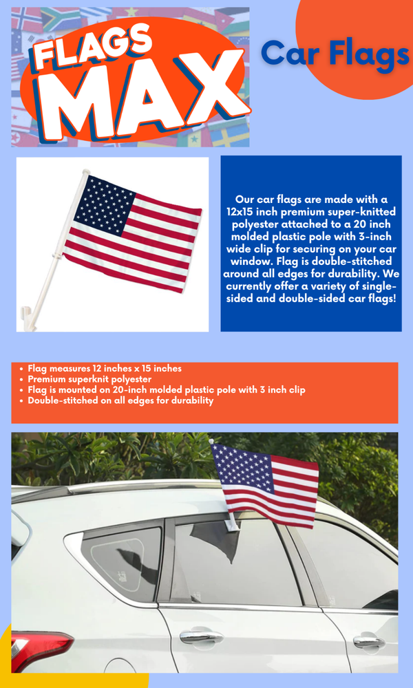 Material:100% PolyesterCustomized:NoCountry of Origin:ChinaCountry/State:United StatesSize:12 x 15 inTheme:CountryBrand:UnbrandedTeam:NoneColor:Multicolorgtin13:Does not applyType:FlagFeatures:Double-SidedStyle:TraditionalSubject:National FlagCare Instructions:Clean with Dampen ClothOccasion:Independance DayItem Weight:1 lbUPC:Does not applyPersonalized:No