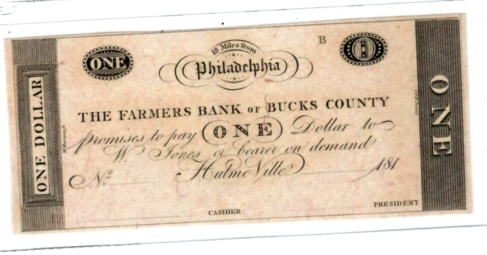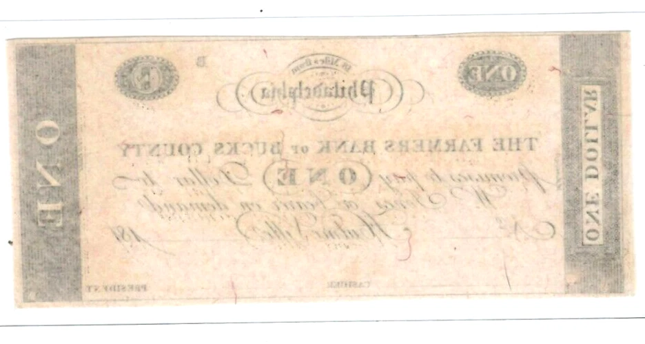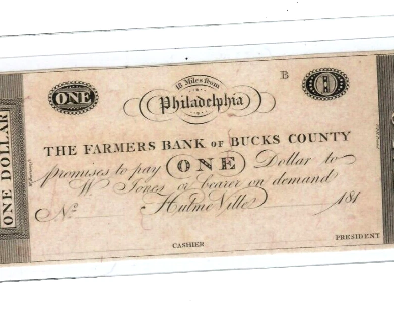 Here we are offering an Authentic rarely seen Odd Denomination $1 Farmers Bank of Bucks County out of Philadelphia with Beautiful Vignettes and lots of Crispiness when held ........from way back in the 1800s...........This note has seen No circulation and has tons of crispiness when held with no problems to report.....No rips, tears, pinholes, rough edges or issing pieces....4 Razor Sharp Corners.....A Nice & RARE note ......The New Owner will be Happy........... Please see scans ........................ 99 Cent Start.................. Thanks ! If you win more than one auction please wait for an invoice as we only charge one shipping charge no matter how many you win...Usually within the hour of our auctions ending on Sunday you will receive an invoice so please wait to pay........Thanks.... WE TRY OUR VERY BEST TO DESCRIBE EVERYTHING CORRECTLY BUT ONCE IN A WHILE WE MAKE AN ERROR AND MAY MISS SOMETHING>>> IT IS TRULY NOT INTENTIONAL AND BACK ALL WE SELL>>>>> NO NEED FOR ANGER AS LIFE IS TOO SHORT FOR ALL OF THAT>>>>>OUR FEEDBACK SHOWS OUR DEDICATION>>>> THANK YOU!!!