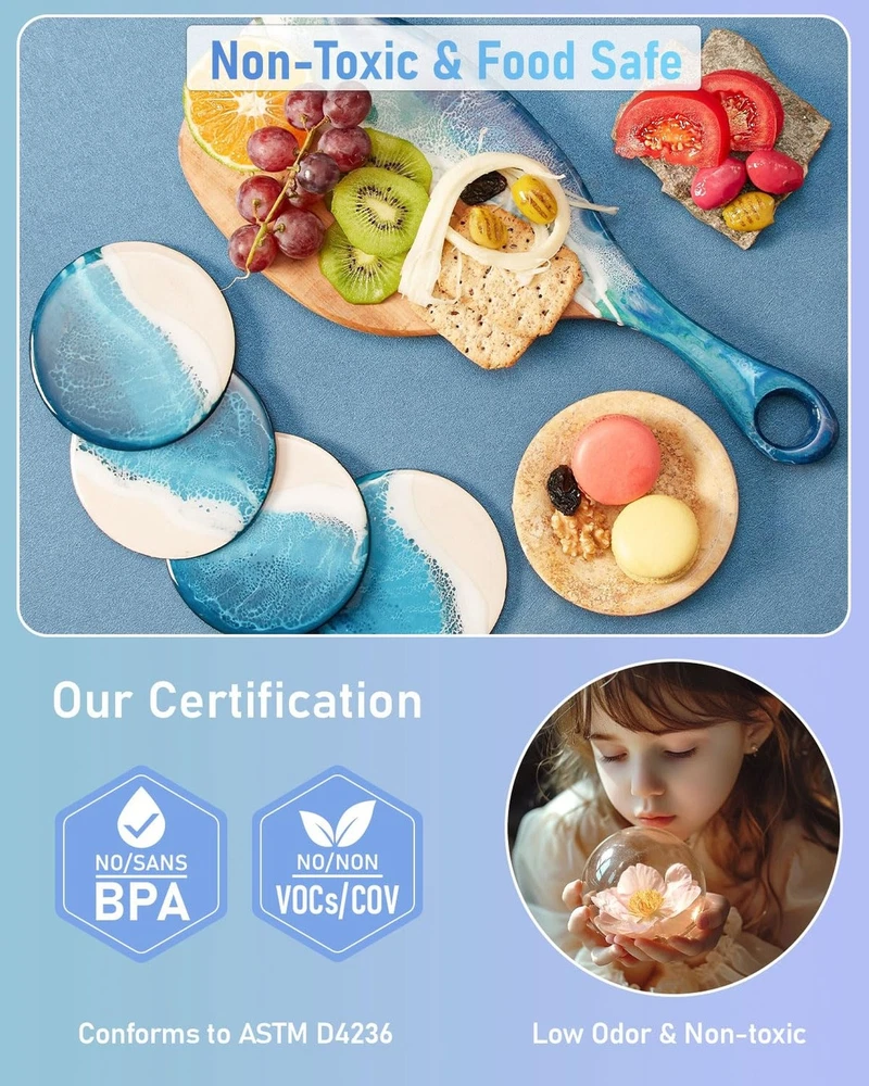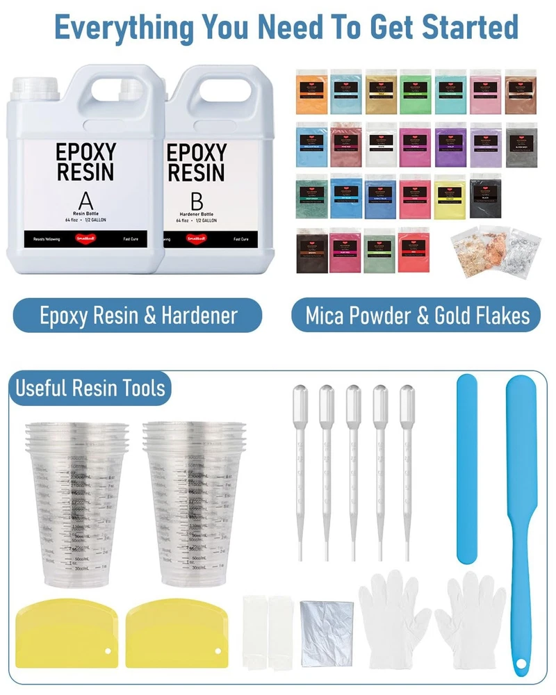 1 Gallon Epoxy Resin Kit with 24 Colors Mica Powder, Gold Foil, Cups & Stick, Crystal Clear Resin Beginner Supplies for Coating Casting Table, Molds, Jewelry Making, DIY Art Craft, 1:1 Ratio Product Details Size: 1 gallon Brand: Smallbudi MPN: BD041 UPC: Does not apply EAN: Does not apply Brand: Smallbudi Color: 24 colors Theme: Fantasy Material: Epoxy resin Seasons: All Seasons Package Dimensions ‏ : ‎ 10.79 x 9.65 x 6.3 inches; 11.13 Pounds Item model number ‏ : ‎ BD041 Date First Available ‏ : ‎ August 29, 2023 Manufacturer ‏ : ‎ SMALLBUDI CO,LTD Best Sellers Rank: #9,004 in Arts, Crafts & Sewing (See Top 100 in Arts, Crafts & Sewing) #89 in Sculpture Molding & Casting Products #89 in Sculpture Molding & Casting Products Customer Reviews: 4.6 4.6 out of 5 stars 509 ratings All-in-One Epoxy Resin Kit Everything You Need to Start Creating. This complete epoxy resin kit includes 64 oz resin + 64 oz hardener, 24 vibrant mica powder colors, 3 gold foil flakes, measuring cups, gloves, silicone sticks, pipettes, scrapers, apron, tablecloths & a detailed manual. Designed for beginners and pros alike - no need to purchase extra supplies, just open the box and start crafting Crystal Clear, Bubble-Free & Anti-Yellowing - Formulated with advanced clarity technology, our epoxy resin delivers a flawless, high-gloss finish without bubbles or imperfections. UV-resistant and non-yellowing over time, your resin art stays vibrant, transparent, and rock as hard - perfect for coating, casting, and preserving every detail of your masterpiece Non-Toxic & Food Safe Safe for All Creators. Made from premium, low-odor materials, this epoxy resin kit is certified non-toxic and conforms to ASTM D-4236 standards. Once cured, its safe for food contactideal for making coasters, serving trays, and kitchenware. No VOC emission, no fumessafe for both personal and classroom use Easy Operation, Smooth Finish Perfect for Beginners. Designed with a simple 1:1 mixing ratio (by volume), our epoxy resin is self-leveling, self-degassing, and beginner-friendly. Just mix by 1:1 volume ratio, stir slowly for 35 minutes, pour, and enjoy 45 minutes of working time before curing. Full cure in 24 hours with minimal effort and maximum results Versatile Applications For Art, Furniture & More. Whether you're pouring river tables, casting jewelry molds, coating wood, or designing custom gifts, this all-inclusive epoxy resin kit is perfect for DIY projects of any scale. Works beautifully with mica powder and foil for dazzling effectsunleash your creativity on wood, countertops, tumblers, and beyond